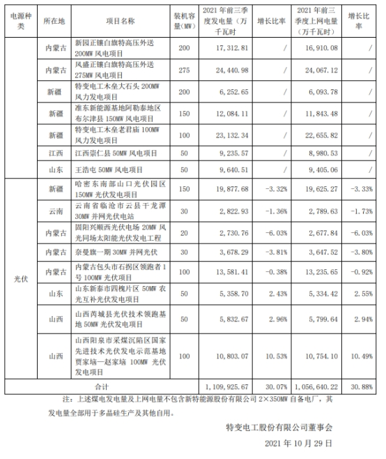 2021 年前三季度,公司電站發電量 1,109,925.67 萬千瓦時,其中煤電發電量 855,564.86 萬千瓦時;風電自營電站發電量 189,675.30 萬千瓦時;光伏發電自營電站發電量 64,685.51 萬千瓦時,上網電量 1,056,640.22 萬千瓦時。 同時,特變電工新疆新能源股份有限公司發布投資建設新能源電站項目的公告,公司擬14.5億元再投資1個風電、3個光伏發電項目,投資項目如下: 1、遼寧省鐵嶺市西豐縣柏榆鎮 102MW 風電項目,總投資 76,918.76 萬元; 2、光晟霍城 50MW 光伏發電項目,總投資 20,491.39 萬元; 3、山西省長治市襄垣縣80MW光伏發電項目,總投資 36,252.07 萬元; 4、甘肅省酒泉市敦煌 20MW 平價光伏發電項目,總投資 11,369.95 萬元。 l 同日,特變電工發布2021年第三季度報告。公司第三季度公司實現營業收入16,613,891,261.98元,同比增長44.33%,歸屬于上市公司股東的凈利潤2,084,553,245.87元,同比增長227.92%,基本每股收益0.5612元/股,同比增長228%。 同時,前三季度實現營業收入39,105,937,751.43元,同比增長32.66%,歸屬于上市公司股東的凈利潤5,191,013,225.31元,同比增長233.67%,基本每股收益1.3976元/股,同比增長233.72%。 報告稱,營業收入、凈利潤同比增長主要系投資的南網能源(003035.SZ)股票上市,公允價值變動收益增加、多晶硅價格上漲及銷量增加、新能源自營電站發電量增加、煤炭銷量增加等原因所致。