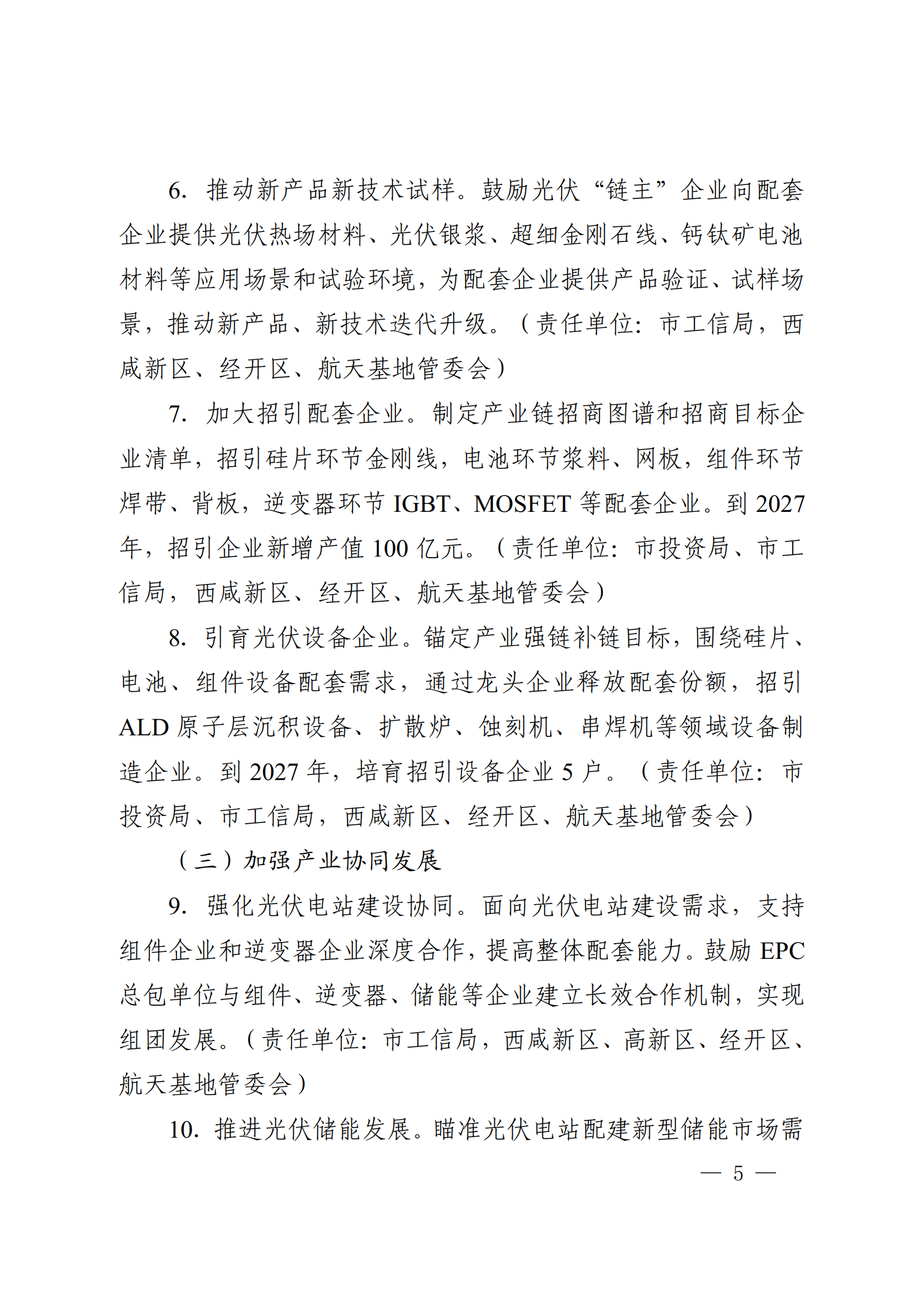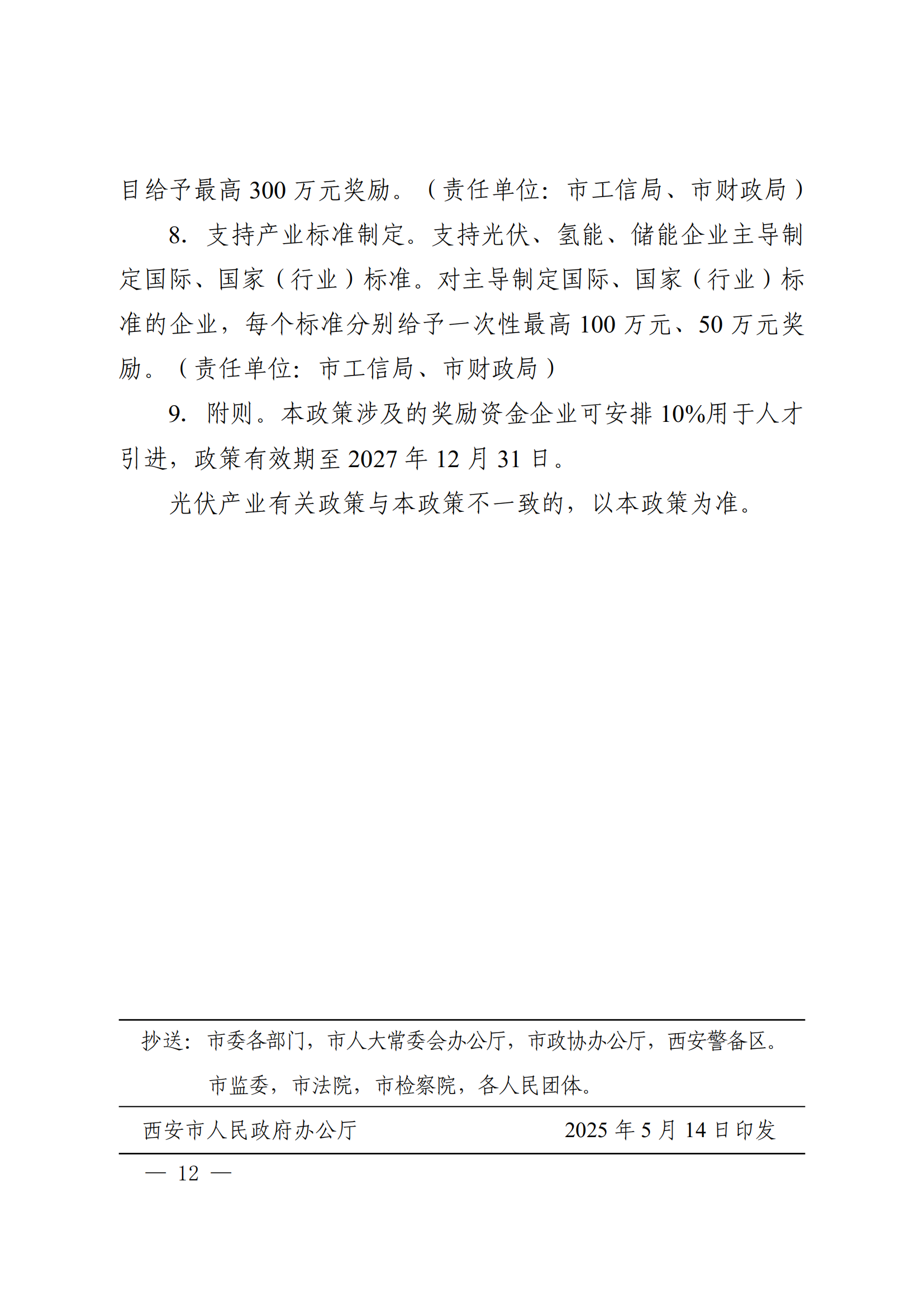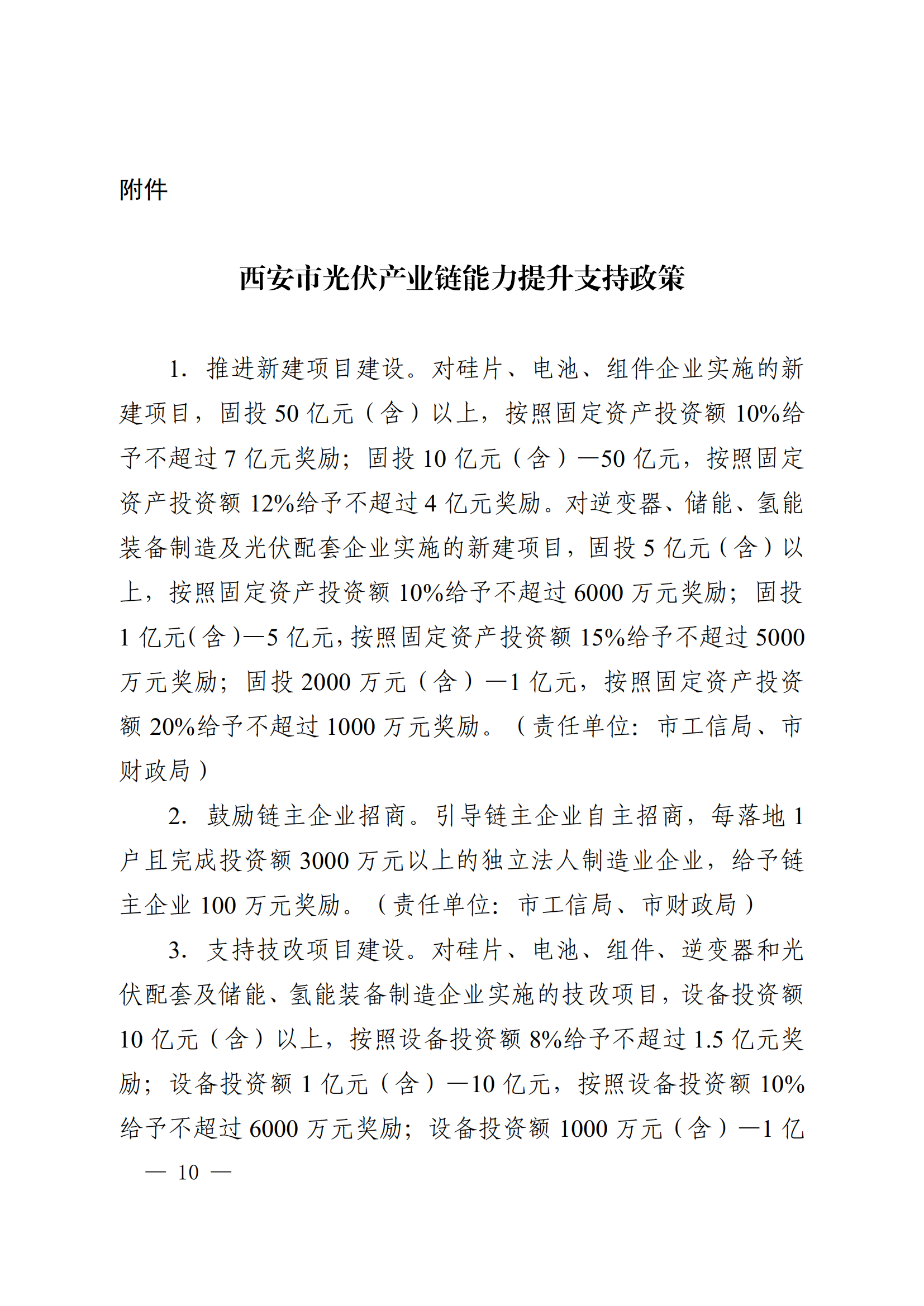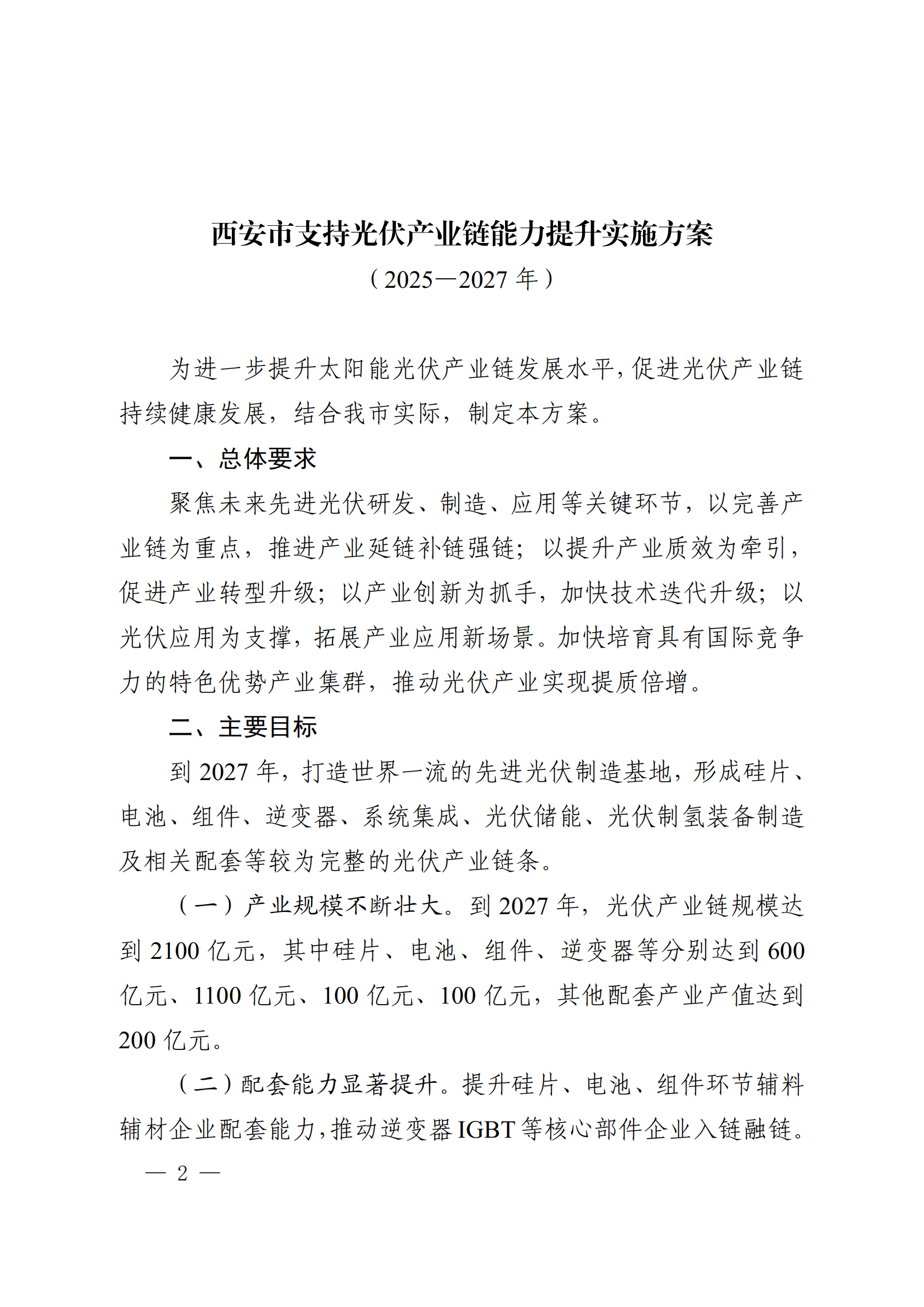 5月15日,陜西省西安市人民政府印發《西安市支持光伏產業鏈能力提升實施方案(2025—2027年)》,《方案》提出,到2027年,打造世界一流的先進光伏制造基地,形成硅片、電池、組件、逆變器、系統集成、光伏儲能、光伏制氫裝備制造及相關配套等較為完整的光伏產業鏈條。 到2027年,全市光伏新增裝機量2GW,光伏累計裝機量達到4.3GW。建設100個“光伏+”鄉村振興行政村,新建公共機構建筑、工業廠房屋頂光伏覆蓋率不低于55%,建設一批零碳(低碳)工廠和園區。 到2027年,硅片、電池產能分別達到120GW、130GW,硅片出貨量全球第一,逆變器產能超過76GW。 此外,在光伏產業鏈新建項目建設、鏈主企業招商、技改項目建設、企業融資降本、創新平臺建設、中試平臺建設、核心技術攻關、產業標準制定等八大方面進行現金獎補。例如,在推進新建項目建設方面,對硅片、電池、組件企業實施的新建項目,最高給予7億元獎勵。在招商方面,引導鏈主企業自主招商,每落地1戶且完成投資額3000萬元以上的獨立法人制造業企業,給予鏈主企業100萬元獎勵。在技改項目建設方面,最高給予1.5億元獎勵。 全文如下: