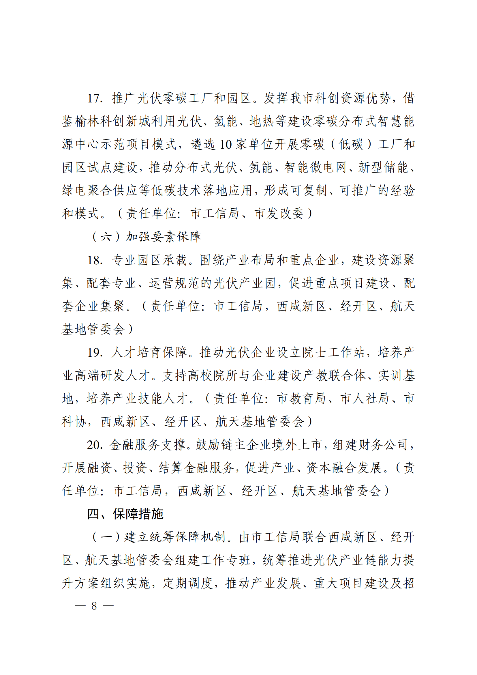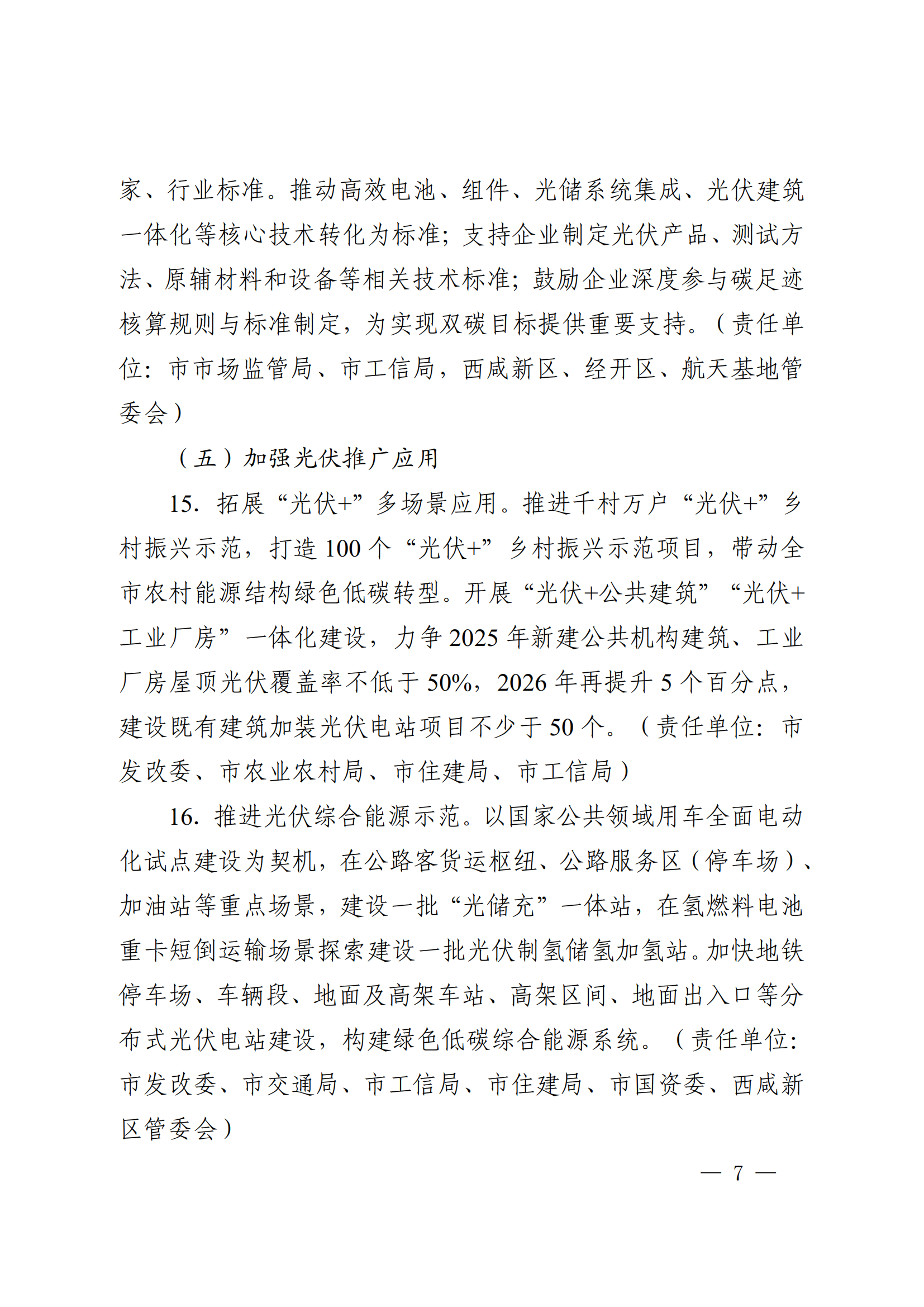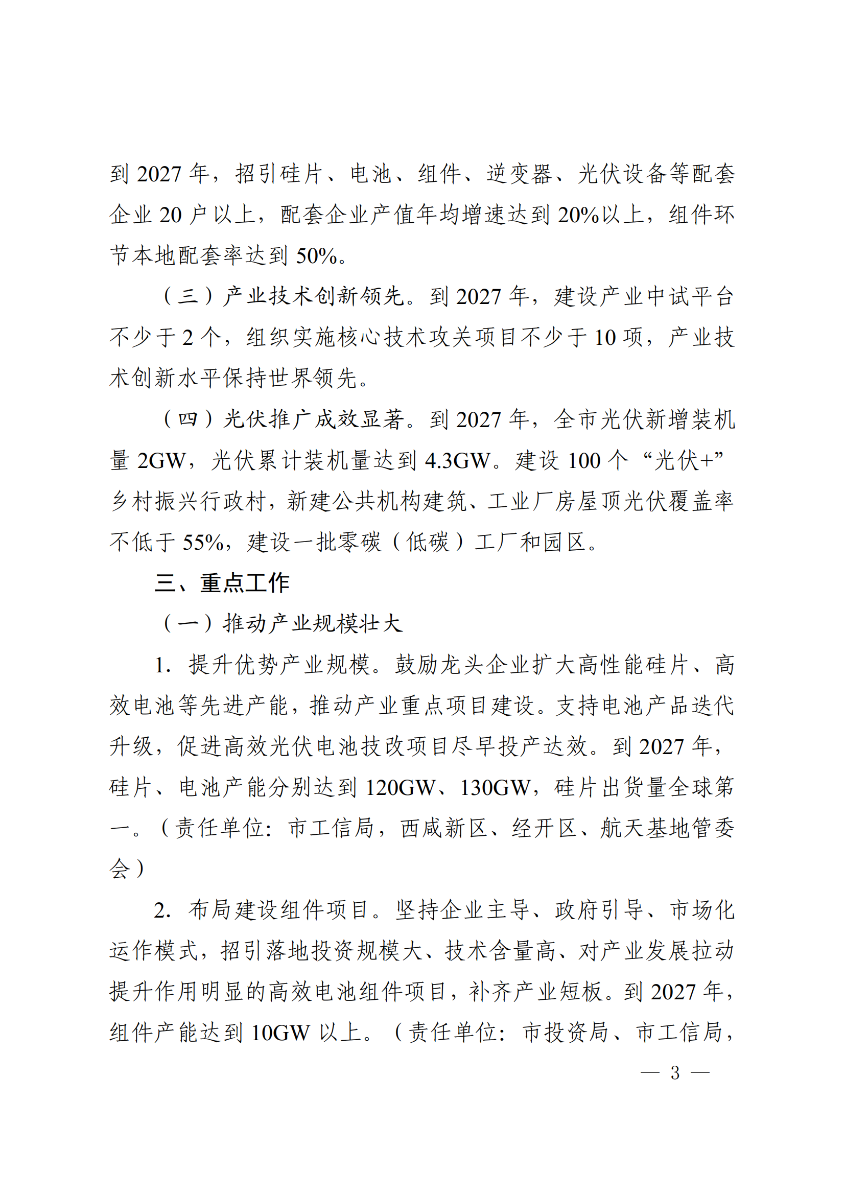 5月15日,陜西省西安市人民政府印發《西安市支持光伏產業鏈能力提升實施方案(2025—2027年)》,《方案》提出,到2027年,打造世界一流的先進光伏制造基地,形成硅片、電池、組件、逆變器、系統集成、光伏儲能、光伏制氫裝備制造及相關配套等較為完整的光伏產業鏈條。 到2027年,全市光伏新增裝機量2GW,光伏累計裝機量達到4.3GW。建設100個“光伏+”鄉村振興行政村,新建公共機構建筑、工業廠房屋頂光伏覆蓋率不低于55%,建設一批零碳(低碳)工廠和園區。 到2027年,硅片、電池產能分別達到120GW、130GW,硅片出貨量全球第一,逆變器產能超過76GW。 此外,在光伏產業鏈新建項目建設、鏈主企業招商、技改項目建設、企業融資降本、創新平臺建設、中試平臺建設、核心技術攻關、產業標準制定等八大方面進行現金獎補。例如,在推進新建項目建設方面,對硅片、電池、組件企業實施的新建項目,最高給予7億元獎勵。在招商方面,引導鏈主企業自主招商,每落地1戶且完成投資額3000萬元以上的獨立法人制造業企業,給予鏈主企業100萬元獎勵。在技改項目建設方面,最高給予1.5億元獎勵。 全文如下: