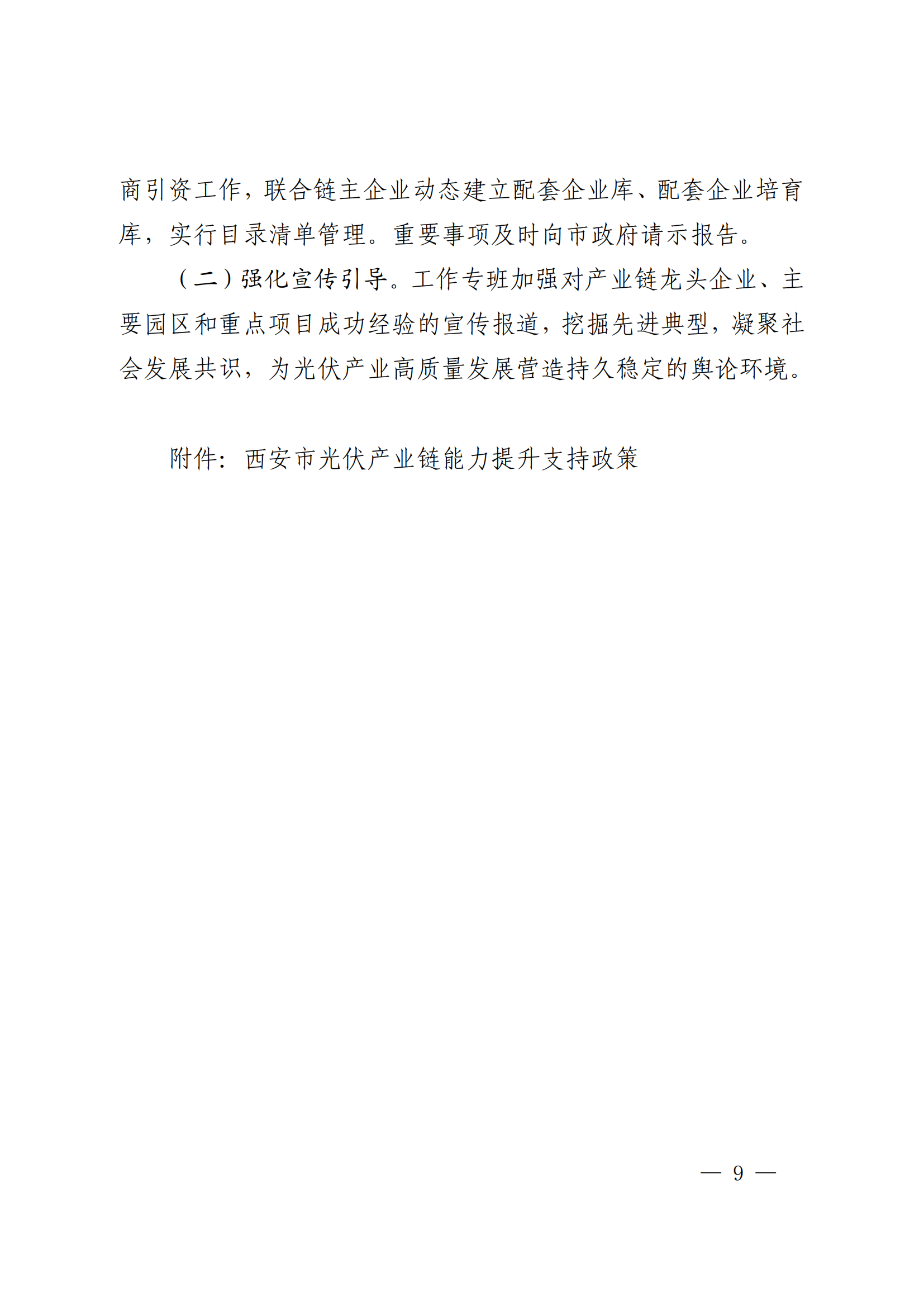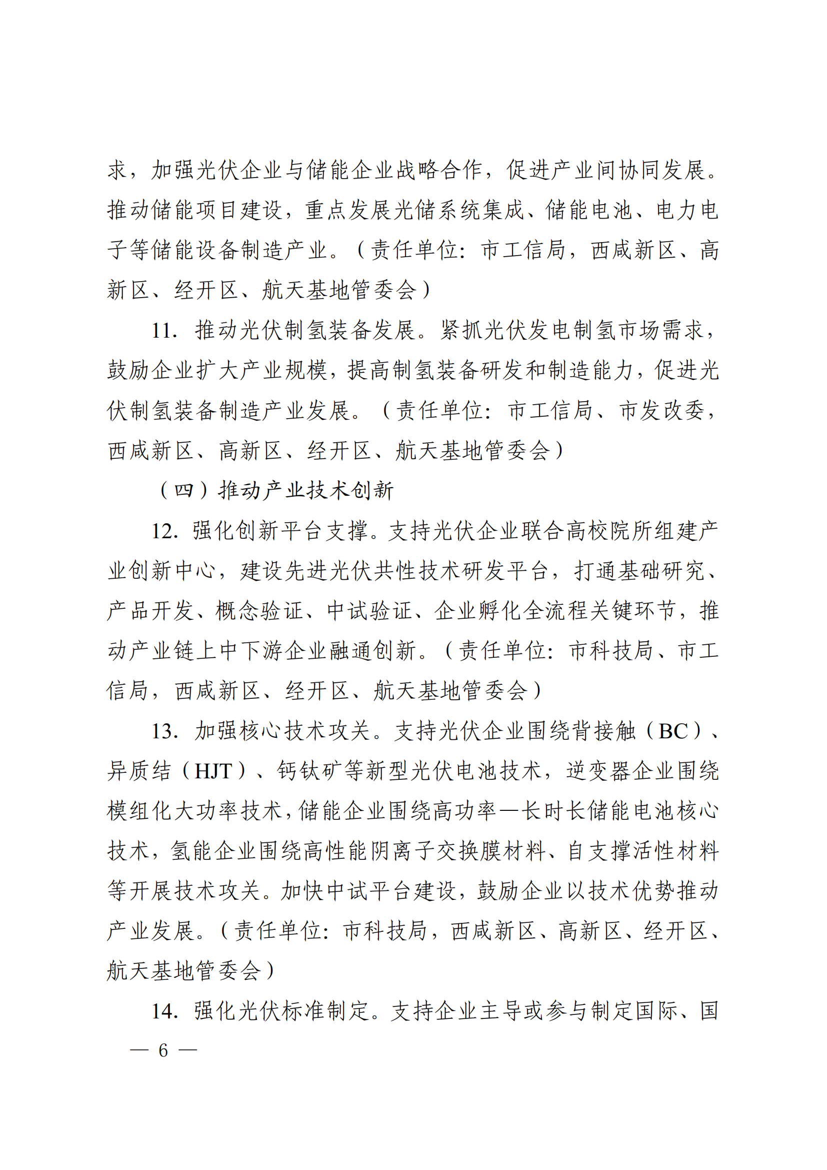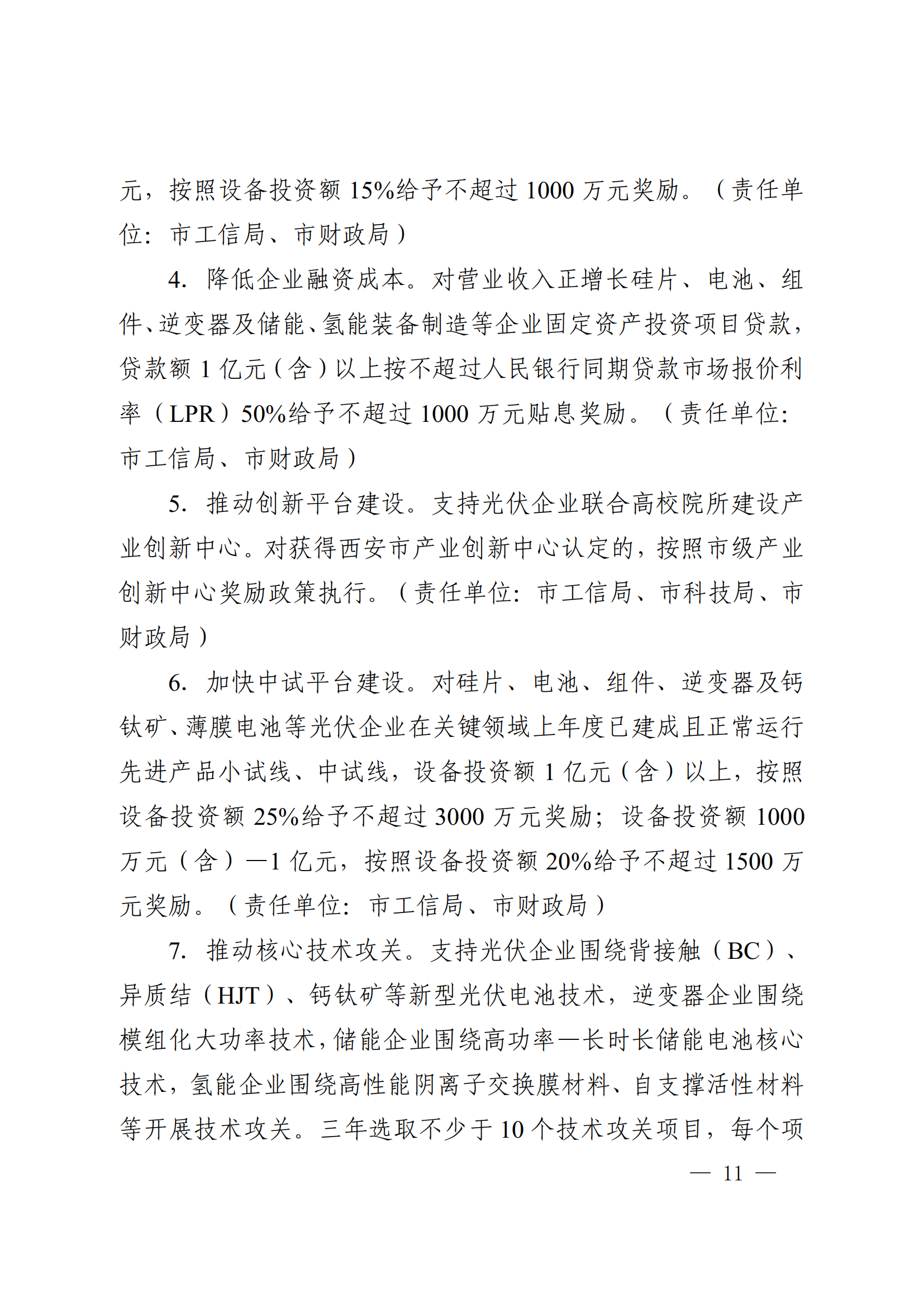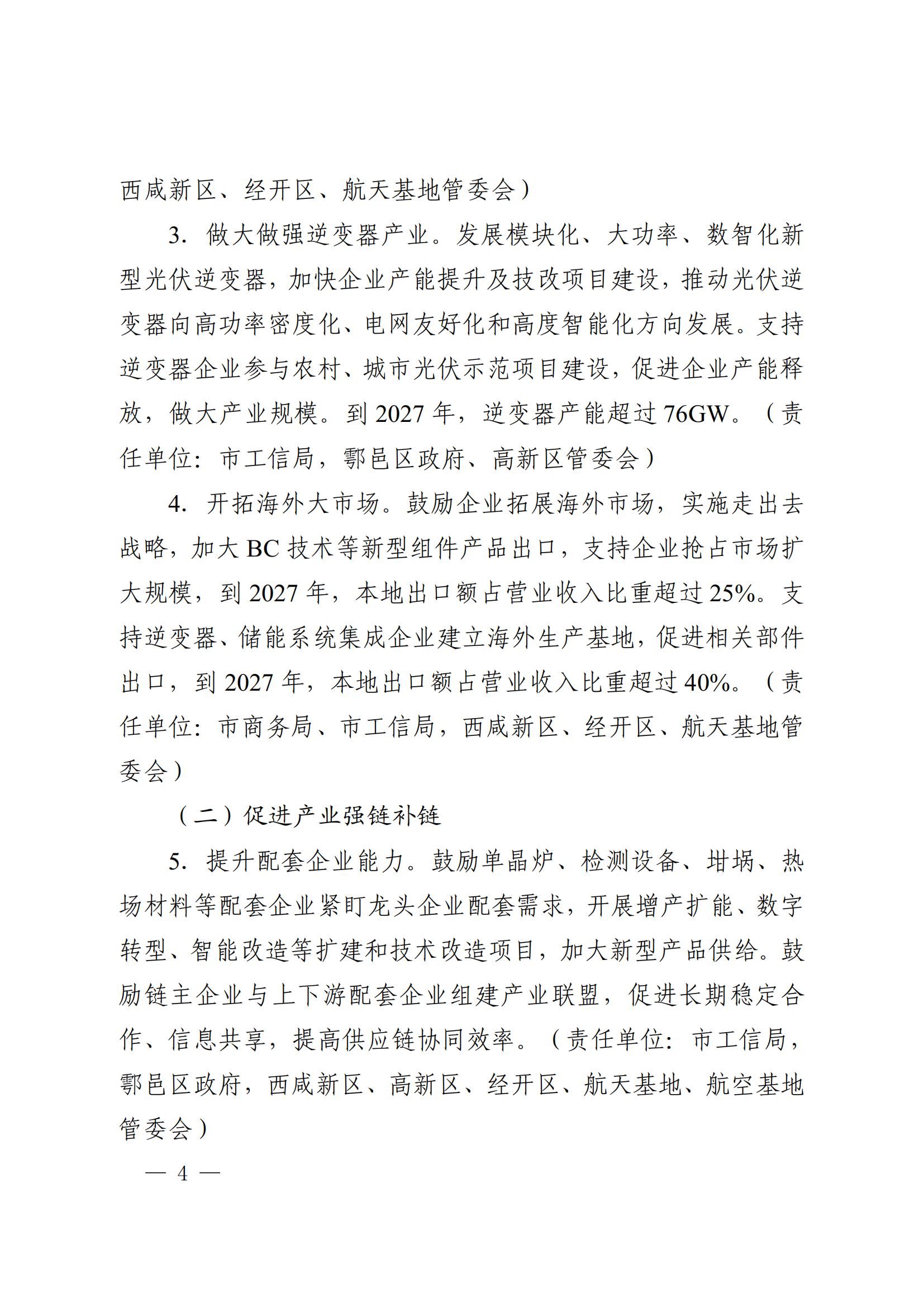 5月15日,陜西省西安市人民政府印發《西安市支持光伏產業鏈能力提升實施方案(2025—2027年)》,《方案》提出,到2027年,打造世界一流的先進光伏制造基地,形成硅片、電池、組件、逆變器、系統集成、光伏儲能、光伏制氫裝備制造及相關配套等較為完整的光伏產業鏈條。 到2027年,全市光伏新增裝機量2GW,光伏累計裝機量達到4.3GW。建設100個“光伏+”鄉村振興行政村,新建公共機構建筑、工業廠房屋頂光伏覆蓋率不低于55%,建設一批零碳(低碳)工廠和園區。 到2027年,硅片、電池產能分別達到120GW、130GW,硅片出貨量全球第一,逆變器產能超過76GW。 此外,在光伏產業鏈新建項目建設、鏈主企業招商、技改項目建設、企業融資降本、創新平臺建設、中試平臺建設、核心技術攻關、產業標準制定等八大方面進行現金獎補。例如,在推進新建項目建設方面,對硅片、電池、組件企業實施的新建項目,最高給予7億元獎勵。在招商方面,引導鏈主企業自主招商,每落地1戶且完成投資額3000萬元以上的獨立法人制造業企業,給予鏈主企業100萬元獎勵。在技改項目建設方面,最高給予1.5億元獎勵。 全文如下: