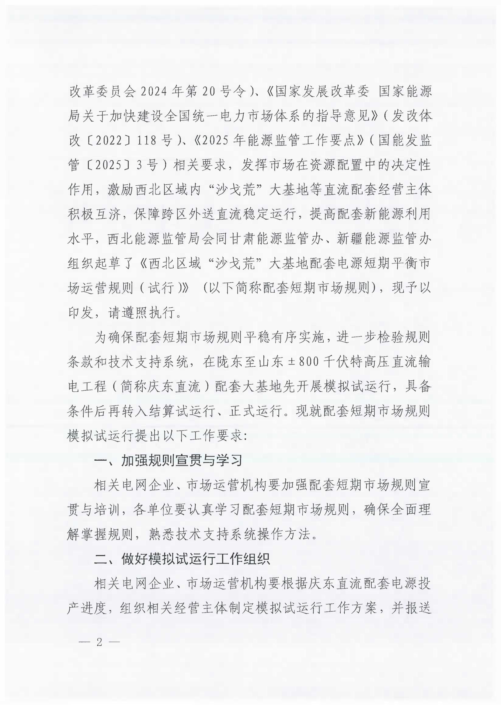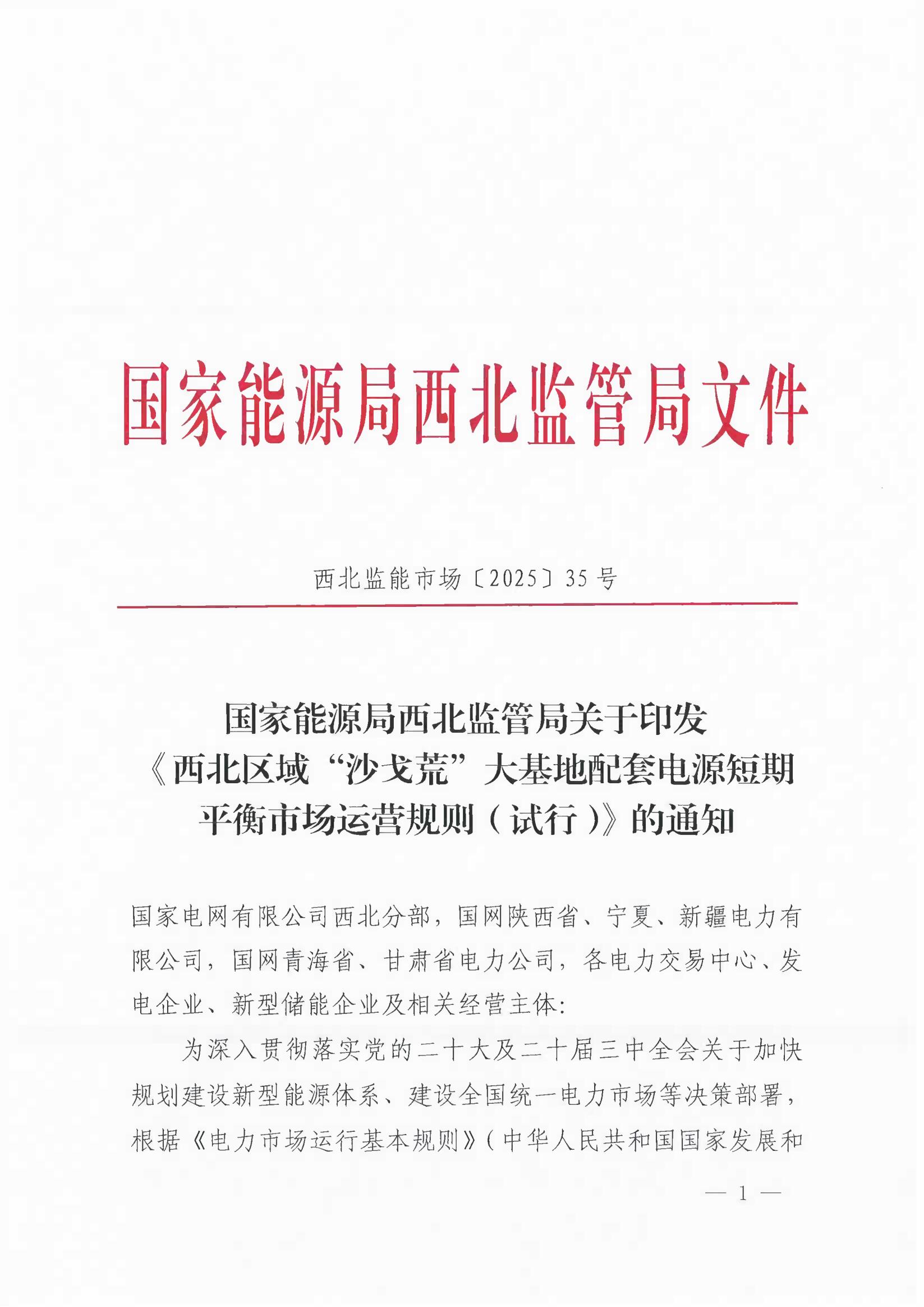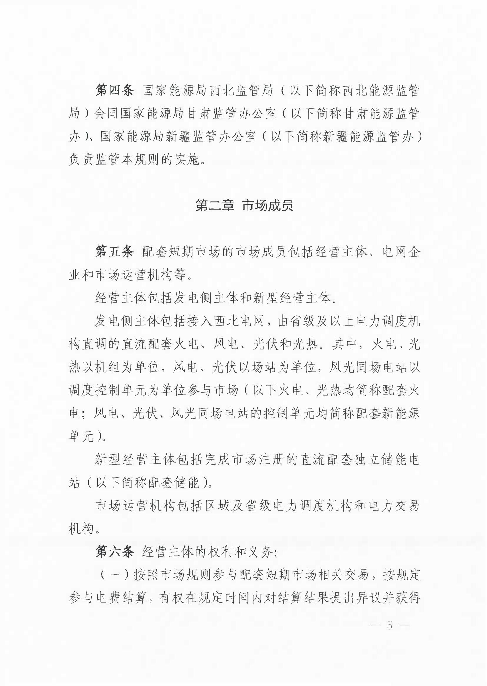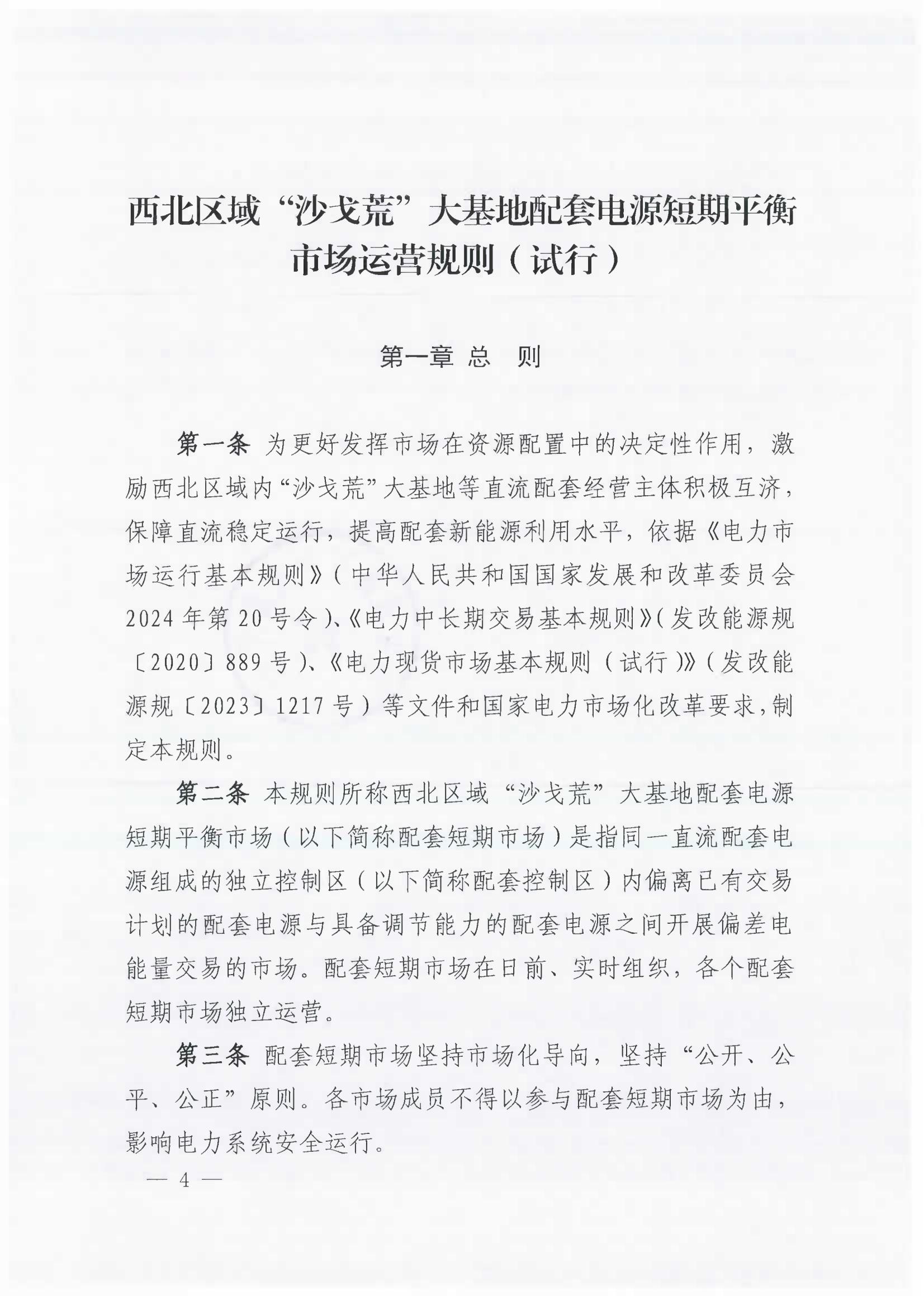 5月15日,國家能源局西北監管局發布關于印發《西北區域“沙戈荒”大基地配套電源短期平衡市場運營規則(試行)》的通知。通知指出,本規則所稱西北區域“沙戈荒”大基地配套電源短期平衡市場(以下簡稱配套短期市場)是指同一直流配套電源組成的獨立控制區(以下簡稱配套控制區)內偏離已有交易計劃的配套電源與具備調節能力的配套電源之間開展偏差申能量交易的市場。配套短期市場在日前、實時組織,各個配套短期市場獨立運營。 配套短期市場的市場成員包括經營主體、電網企業和市場運營機構等。經營主體包括發電側主體和新型經營主體。 發電側主體包括接入西北電網,由省級及以上電力調度機構直調的直流配套火電、風電、光伏和光熱。其中,火電、光熱以機組為單位,風電、光伏以場站為單位,風光同場電站以調度控制單元為單位參與市場(以下火電、光熱均簡稱配套火電;風電、光伏、風光同場電站的控制單元均簡稱配套新能源單元)。 原文如下: