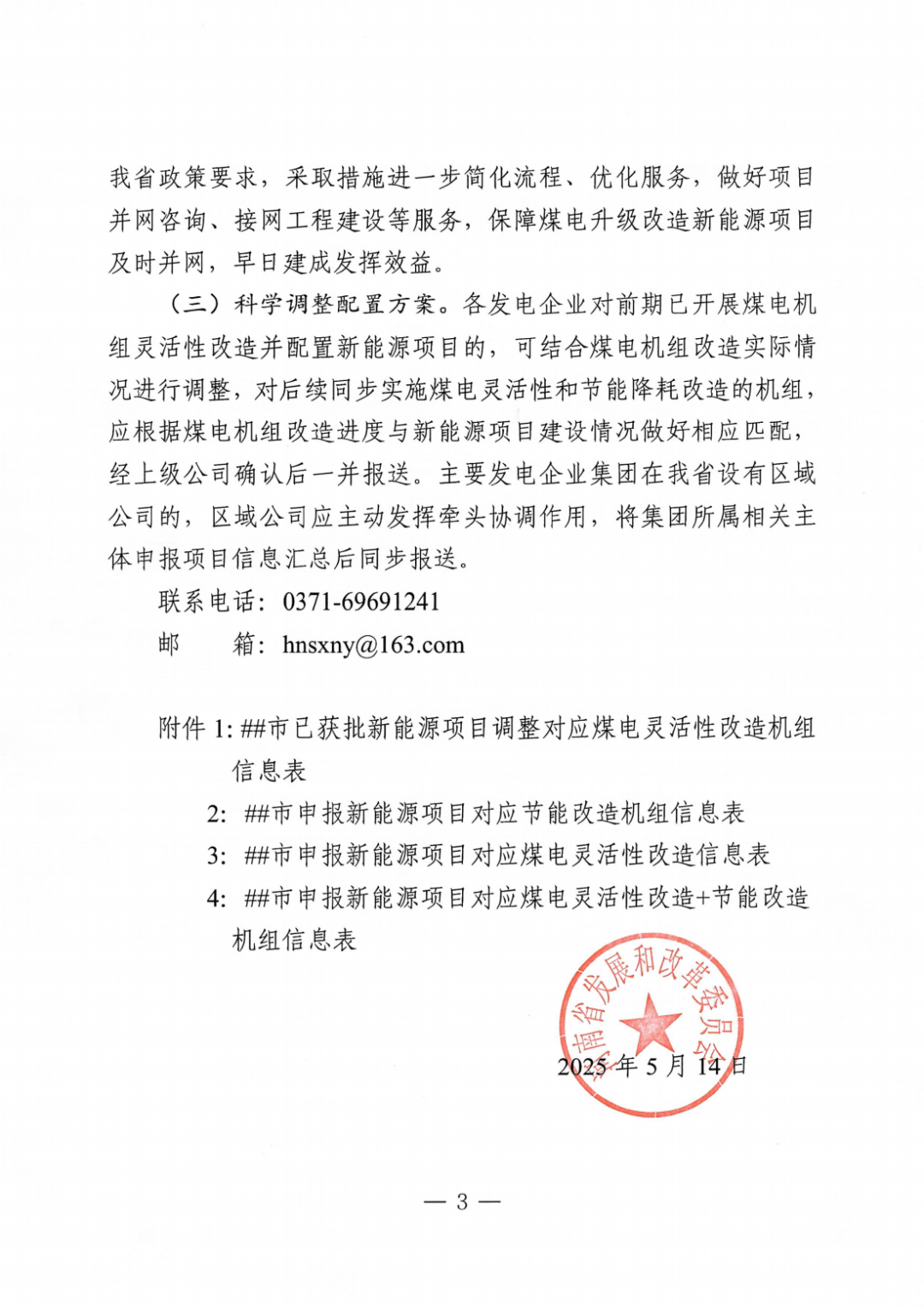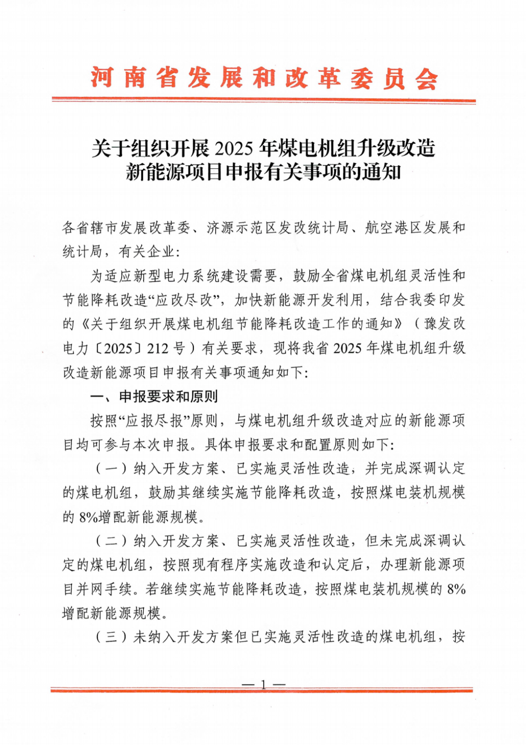 5月14日,河南發改委發布《關于組織開展2025年煤電機組升級改造新能源項目申報有關事項的通知》(簡稱“通知”)。 《通知》明確,按照“應報盡報”原則,與煤電機組升級改造對應的新能源項目均可參與本次申報。具體申報要求和配置原則如下: (一)納入開發方案、已實施靈活性改造,并完成深調認定的煤電機組,鼓勵其繼續實施節能降耗改造,按照煤電裝機規模的8%增配新能源規模。 (二)納入開發方案、已實施靈活性改造,但未完成深調認定的煤電機組,按照現有程序實施改造和認定后,辦理新能源項目并網手續。若繼續實施節能降耗改造,按照煤電裝機規模的8%增配新能源規模。 (三)未納入開發方案但已實施靈活性改造的煤電機組,按照裝機規模的14%配置新能源項目,依程序申請納入開發方案并完成改造和認定后,辦理新能源項目并網手續。若繼續實施節能降耗改造,按照煤電裝機規模的8%增配新能源規模。 (四)未納入開發方案且未實施靈活性改造的煤電機組,應同步開展靈活性和節能降耗改造,按照煤電裝機規模的22%配置新能源規模。 《通知》強調,要科學調整配置方案。各發電企業對前期已開展煤電機組靈活性改造并配置新能源項目的,可結合煤電機組改造實際情況進行調整,對后續同步實施煤電靈活性和節能降耗改造的機組,應根據煤電機組改造進度與新能源項目建設情況做好相應匹配,經上級公司確認后一并報送。 擬參與本次申報的項目,抓緊完善新能源項目前期支持性材料,切實排除顛覆性因素,于6月30日前將更新材料上傳至新能源項目管理系統前期庫()。 需要補充的是,2024年05月13日,河南發改委曾發布《關于開展煤電機組靈活性改造項目深度調峰能力認定工作的通知》。文件指出,煤電機組靈活性改造項目深度調峰能力認定適用于:配置新能源項目納入2022-2025年度開發方案,且最小發電出力經相關性能試驗達到要求的煤電機組。 此外,申請認定的靈活性改造項目應先于或同步于新能源本體項目建設,且機組最小發電出力不高于額定功率的25%,原則上于2025年底前全部完成。 近年來,我國煤電行業經歷了大刀闊斧的優化提升。從超低排放改造到節能降碳改造、靈活性改造、供熱改造“三改聯動”,再到低碳化改造,煤電機組的能效提升、靈活性增強和環保水平優化成果顯著。 2021年10月29日,國家發展改革委、國家能源局發布《關于開展全國煤電機組改造升級的通知》,“三改聯動”在煤電行業拉開帷幕,激發煤電綠色低碳發展新活力。 2025年3月26日,國家發展改革委、國家能源局聯合印發《新一代煤電升級專項行動實施方案(2025—2027年)》,旨在夯實煤電兜底保障作用,積極推進煤電轉型升級,助力構建新型電力系統。 原文如下: