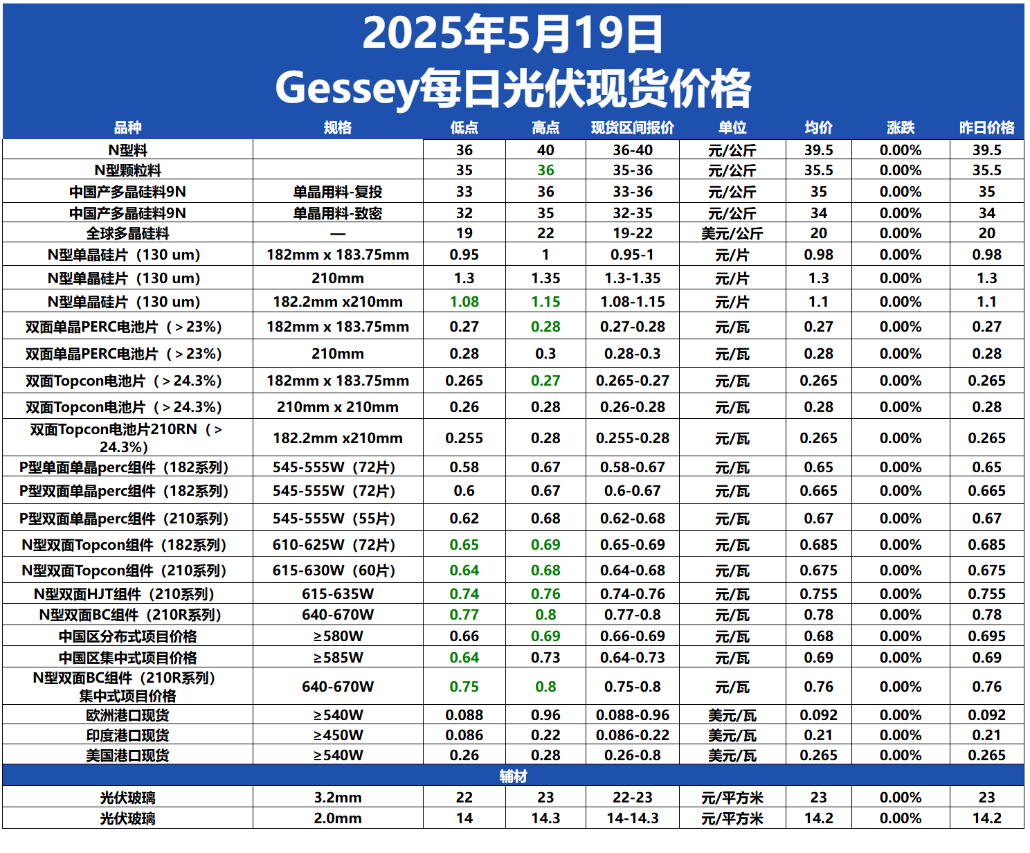 Gessey:5月19日每日光伏市場行情2025-05-19 18:26來源:gessey瀏覽數:294次