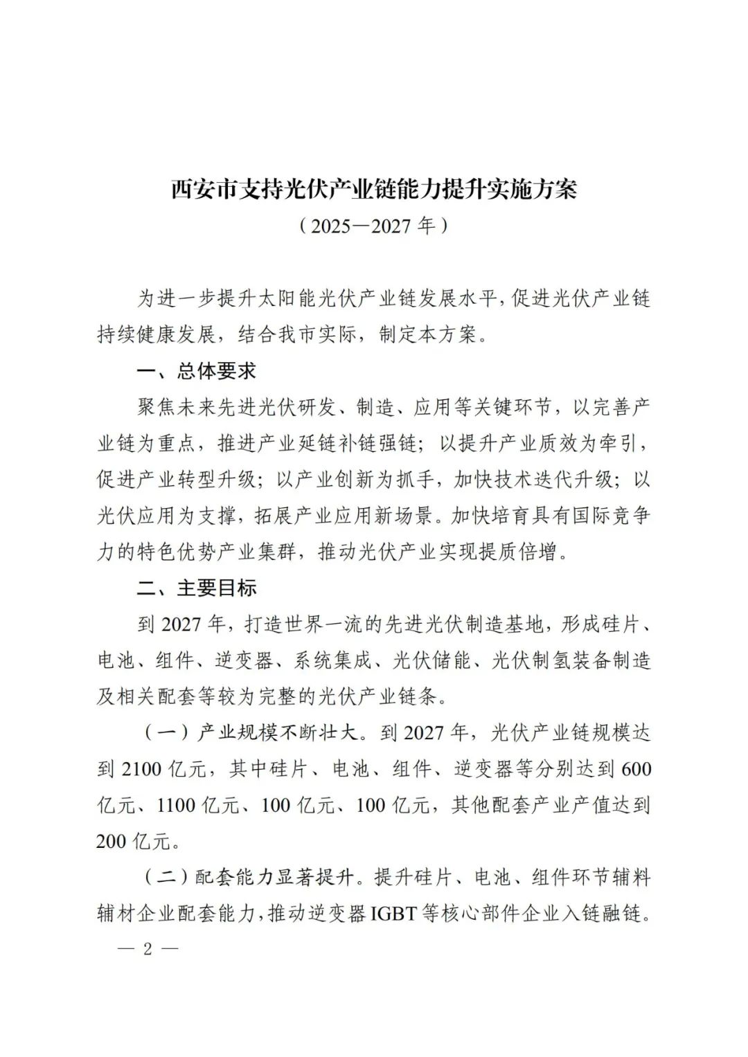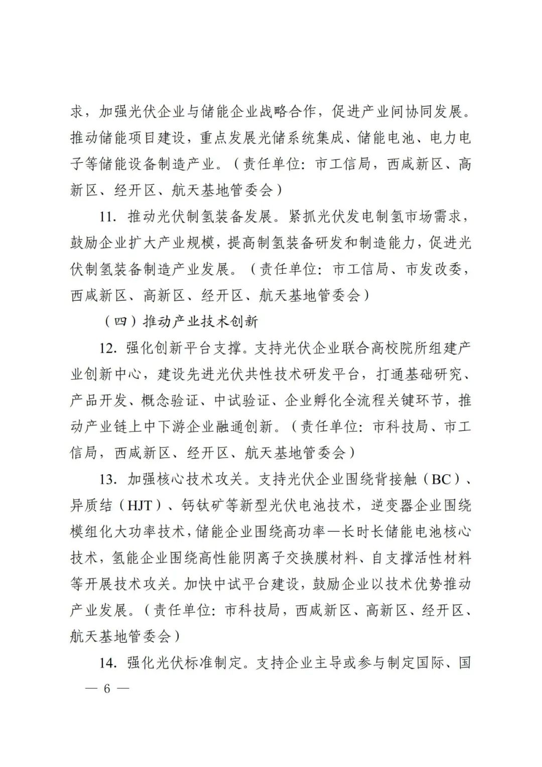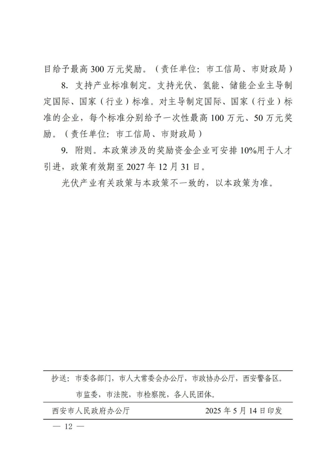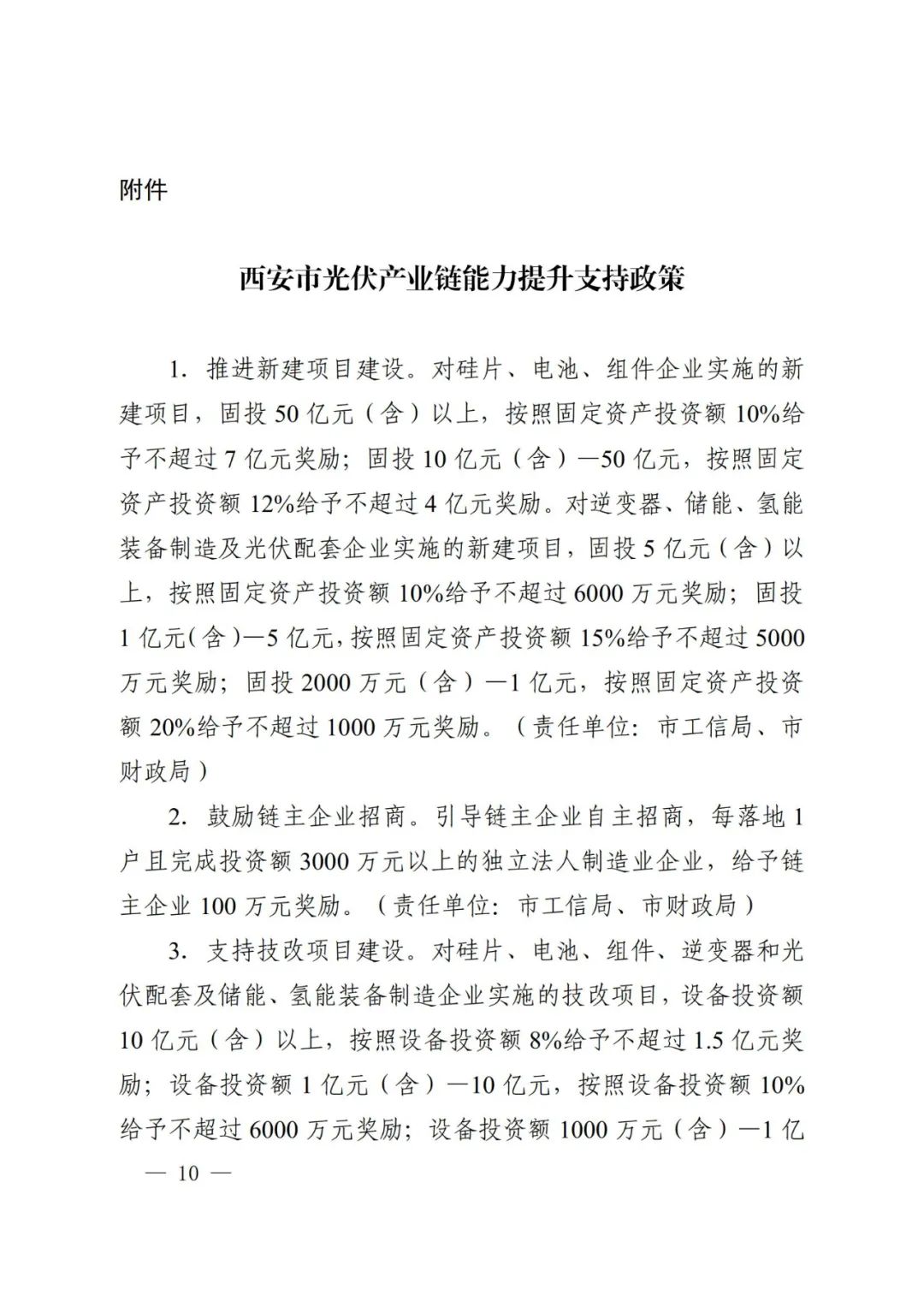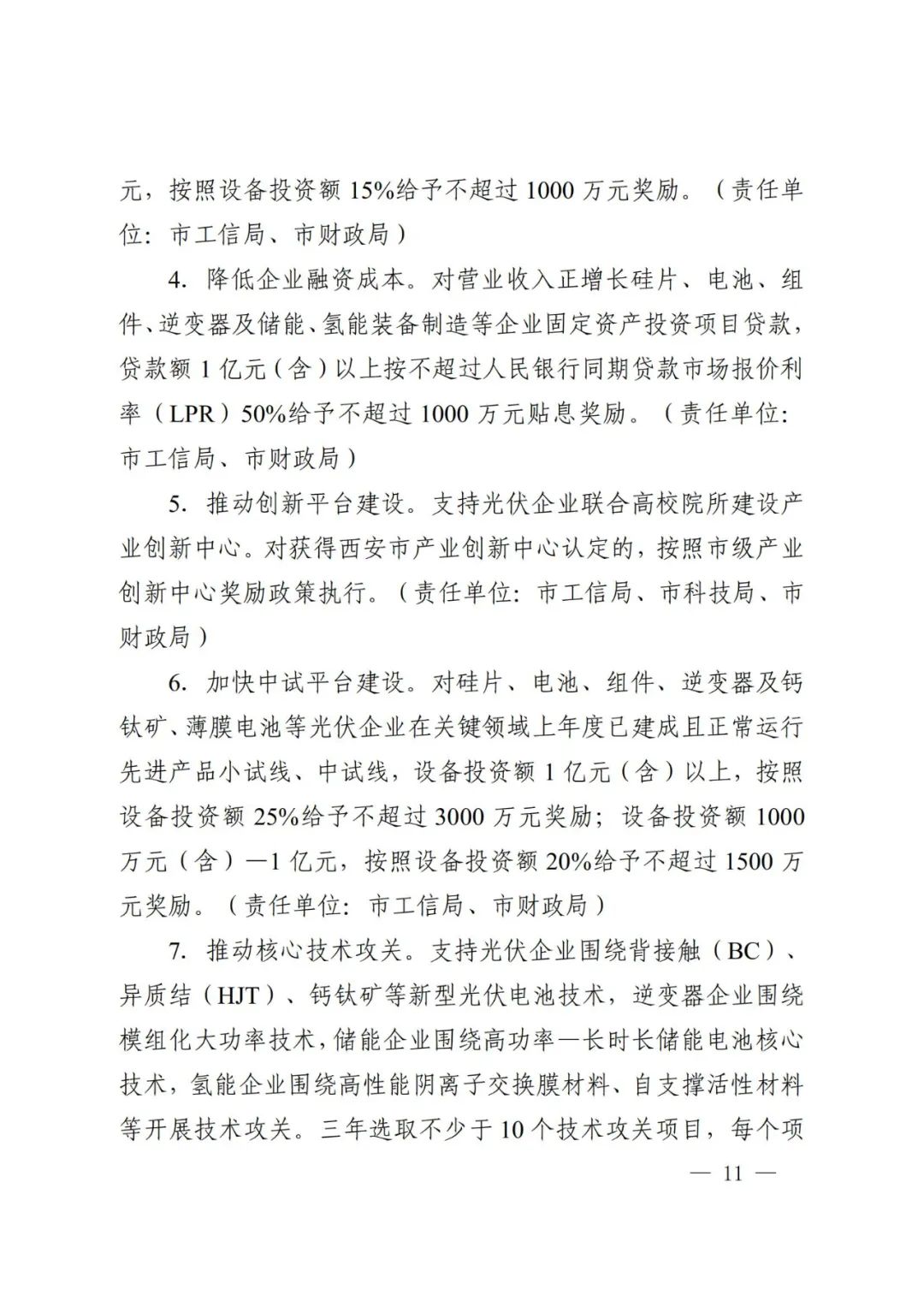 5月15日,西(xi)安市人民政府辦公(gong)廳發布《關于支持光(guang)伏產業鏈能力提升實(shi)施(shi)方案(2025—2027年(nian))的通知》。 《通(tong)知》指(zhi)出,到2027年,打造世(shi)界一(yi)流的(de)先進(jin)光伏制造基地(di),形成硅片(pian)、電池、組件、逆變器、系統(tong)集成、光伏儲能、光伏制氫(qing)裝備制造及相關配套等較(jiao)為完整的(de)光伏產業(ye)鏈條(tiao)。 推動光伏制(zhi)氫裝(zhuang)備(bei)發展。緊(jin)抓光伏發電制(zhi)氫市(shi)場(chang)需(xu)求,鼓(gu)勵企業擴大產業規(gui)模,提(ti)高制(zhi)氫裝(zhuang)備(bei)研發和(he)制(zhi)造(zao)能力,促(cu)進光伏制(zhi)氫裝(zhuang)備(bei)制(zhi)造(zao)產業發展。 加強核心技(ji)術(shu)(shu)攻關。支(zhi)持光伏(fu)企業(ye)圍(wei)繞(rao)(rao)背接觸(BC)、異質結(jie)(HJT)、鈣鈦(tai)礦(kuang)等(deng)(deng)新型光伏(fu)電池(chi)技(ji)術(shu)(shu),逆變器企業(ye)圍(wei)繞(rao)(rao)模組化大功(gong)率技(ji)術(shu)(shu),儲(chu)能(neng)(neng)企業(ye)圍(wei)繞(rao)(rao)高功(gong)率—長時長儲(chu)能(neng)(neng)電池(chi)核心技(ji)術(shu)(shu),氫能(neng)(neng)企業(ye)圍(wei)繞(rao)(rao)高性能(neng)(neng)陰離子交換膜材料(liao)、自支(zhi)撐(cheng)活性材料(liao)等(deng)(deng)開展技(ji)術(shu)(shu)攻關。 以(yi)國(guo)家公共(gong)領域用車(che)全面電動(dong)化試點(dian)建設(she)為(wei)契機,在(zai)公路(lu)客貨運樞紐、公路(lu)服務區(停車(che)場)、加油站(zhan)(zhan)等重(zhong)點(dian)場景,建設(she)一(yi)批(pi)“光儲充(chong)”一(yi)體站(zhan)(zhan),在(zai)氫燃料電池重(zhong)卡短倒運輸場景探索建設(she)一(yi)批(pi)光伏制氫儲氫加氫站(zhan)(zhan)。 推廣光伏零碳(tan)(tan)工廠和(he)園區。發揮西安市(shi)科(ke)創資源優勢,借(jie)鑒榆林科(ke)創新城利(li)用(yong)(yong)光伏、氫能(neng)、地熱等(deng)建(jian)設(she)零碳(tan)(tan)分布式(shi)智慧能(neng)源中心示范(fan)項(xiang)目(mu)模(mo)式(shi),遴選(xuan)10家單位開展零碳(tan)(tan)(低(di)碳(tan)(tan))工廠和(he)園區試點建(jian)設(she),推動分布式(shi)光伏、氫能(neng)、智能(neng)微電(dian)(dian)網、新型儲(chu)能(neng)、綠電(dian)(dian)聚合供應(ying)等(deng)低(di)碳(tan)(tan)技術落地應(ying)用(yong)(yong),形成可(ke)復制、可(ke)推廣的經驗和(he)模(mo)式(shi)。 推進新(xin)建(jian)項目(mu)建(jian)設。對硅片、電(dian)池、組(zu)件企業(ye)實(shi)施的(de)新(xin)建(jian)項目(mu),固(gu)投(tou)(tou)50億(yi)(yi)元(yuan)(含)以上(shang),按(an)(an)照(zhao)固(gu)定(ding)資(zi)(zi)產(chan)(chan)投(tou)(tou)資(zi)(zi)額(e)(e)10%給予不(bu)超(chao)過7億(yi)(yi)元(yuan)獎勵(li)(li)(li)(li)(li);固(gu)投(tou)(tou)10億(yi)(yi)元(yuan)(含)—50億(yi)(yi)元(yuan),按(an)(an)照(zhao)固(gu)定(ding)資(zi)(zi)產(chan)(chan)投(tou)(tou)資(zi)(zi)額(e)(e)12%給予不(bu)超(chao)過4億(yi)(yi)元(yuan)獎勵(li)(li)(li)(li)(li)。對逆變器、儲(chu)能(neng)、氫能(neng)裝(zhuang)備制(zhi)造及(ji)光伏(fu)配套企業(ye)實(shi)施的(de)新(xin)建(jian)項目(mu),固(gu)投(tou)(tou)5億(yi)(yi)元(yuan)(含)以上(shang),按(an)(an)照(zhao)固(gu)定(ding)資(zi)(zi)產(chan)(chan)投(tou)(tou)資(zi)(zi)額(e)(e)10%給予不(bu)超(chao)過6000萬元(yuan)獎勵(li)(li)(li)(li)(li);固(gu)投(tou)(tou)1億(yi)(yi)元(yuan)(含)—5億(yi)(yi)元(yuan),按(an)(an)照(zhao)固(gu)定(ding)資(zi)(zi)產(chan)(chan)投(tou)(tou)資(zi)(zi)額(e)(e)15%給予不(bu)超(chao)過5000萬元(yuan)獎勵(li)(li)(li)(li)(li);固(gu)投(tou)(tou)2000萬元(yuan)(含)—1億(yi)(yi)元(yuan),按(an)(an)照(zhao)固(gu)定(ding)資(zi)(zi)產(chan)(chan)投(tou)(tou)資(zi)(zi)額(e)(e)20%給予不(bu)超(chao)過1000萬元(yuan)獎勵(li)(li)(li)(li)(li)。 支持(chi)技改(gai)項目(mu)建設(she)(she)(she)。對硅片(pian)、電池、組件、逆變器和光伏配(pei)套及儲能、氫能裝(zhuang)備(bei)制造企業實施的技改(gai)項目(mu),設(she)(she)(she)備(bei)投(tou)資額(e)(e)(e)10億元(含(han))以上,按照設(she)(she)(she)備(bei)投(tou)資額(e)(e)(e)8%給(gei)予(yu)不(bu)超過1.5億元獎(jiang)勵(li)(li)(li);設(she)(she)(she)備(bei)投(tou)資額(e)(e)(e)1億元(含(han))—10億元,按照設(she)(she)(she)備(bei)投(tou)資額(e)(e)(e)10%給(gei)予(yu)不(bu)超過6000萬元獎(jiang)勵(li)(li)(li);設(she)(she)(she)備(bei)投(tou)資額(e)(e)(e)1000萬元(含(han))—1億元,按照設(she)(she)(she)備(bei)投(tou)資額(e)(e)(e)15%給(gei)予(yu)不(bu)超過1000萬元獎(jiang)勵(li)(li)(li)。 降低企業融資(zi)成本。對(dui)營業收入(ru)正(zheng)增長(chang)硅(gui)片、電(dian)池、組(zu)件、逆(ni)變器及儲能、氫能裝備制(zhi)造等企業固(gu)定資(zi)產(chan)投資(zi)項目(mu)貸(dai)款(kuan),貸(dai)款(kuan)額1億元(yuan)(含)以(yi)上按(an)不超過(guo)人民銀行(xing)同期貸(dai)款(kuan)市場報價利率(LPR)50%給予不超過(guo)1000萬元(yuan)貼息獎勵。 推動(dong)核心技(ji)(ji)術攻關(guan)。支持光伏企(qi)業圍繞背接觸(chu)(BC)、異質(zhi)結(HJT)、鈣鈦礦等(deng)新型光伏電(dian)池(chi)技(ji)(ji)術,逆(ni)變器企(qi)業圍繞模組化大功率(lv)技(ji)(ji)術,儲能(neng)企(qi)業圍繞高(gao)功率(lv)—長時(shi)長儲能(neng)電(dian)池(chi)核心技(ji)(ji)術,氫(qing)能(neng)企(qi)業圍繞高(gao)性能(neng)陰離子(zi)交換膜材料、自(zi)支撐(cheng)活性材料等(deng)開展技(ji)(ji)術攻關(guan)。三年選(xuan)取不少(shao)于10個(ge)技(ji)(ji)術攻關(guan)項目,每個(ge)項目給予最(zui)高(gao)300萬元獎(jiang)勵(li)。 支(zhi)持產(chan)業標準(zhun)制定(ding)(ding)。支(zhi)持光伏、氫能、儲能企(qi)業主(zhu)