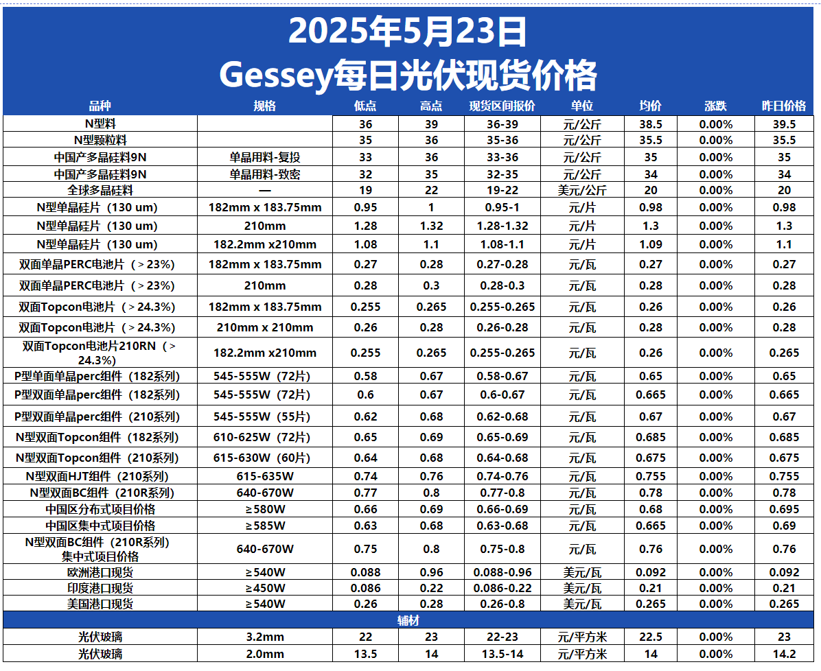 Gessey:5月23日每日光伏市場行情2025-05-23 17:10來源:gessey瀏覽數:153次