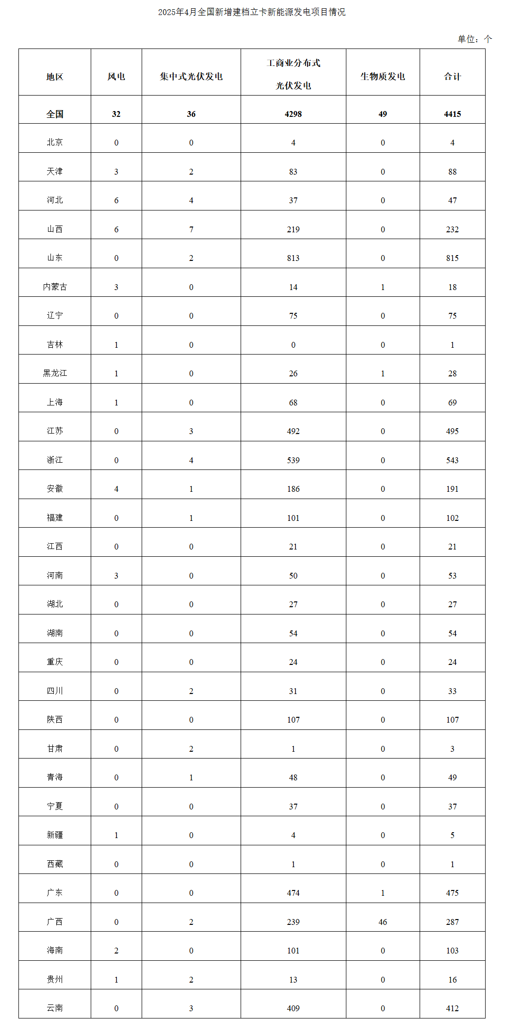 5月26日,國家能源局發布關于2025年4月全國新增建檔立卡新能源發電(不含戶用光伏)項目情況的公告。2025年4月,全國新增建檔立卡新能源發電(不含戶用光伏)項目共4415個,其中風電項目32個,光伏發電項目4334個(集中式光伏發電項目36個,工商業分布式光伏發電項目4298個),生物質發電項目49個。風電、集中式光伏發電、生物質發電項目清單見附件,工商業分布式光伏發電項目清單詳見國家可再生能源發電項目信息管理平臺網站。 附件: 國家能源局 2025年5月20日 上一篇: 南方能源終止2個高速公路光伏項目