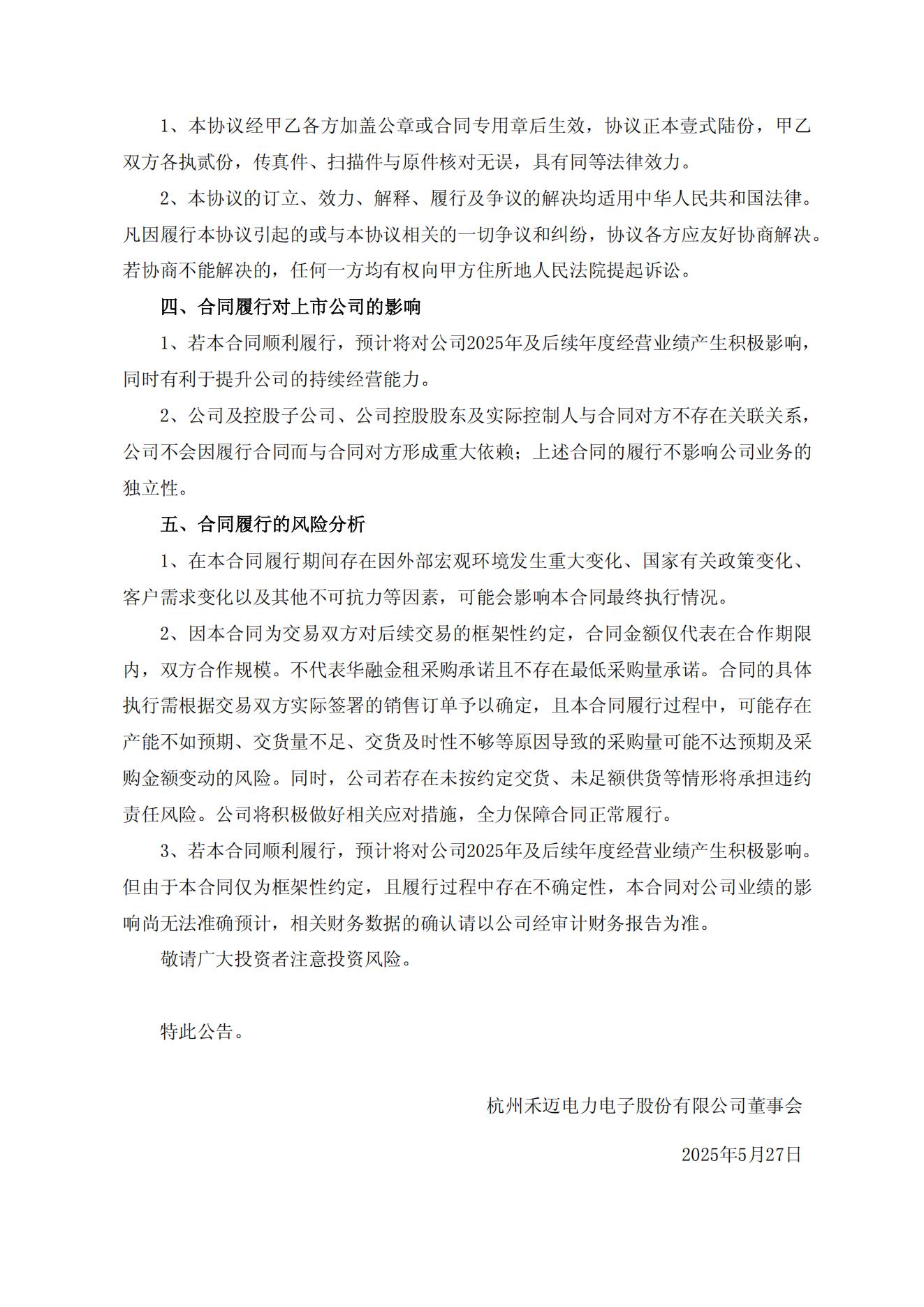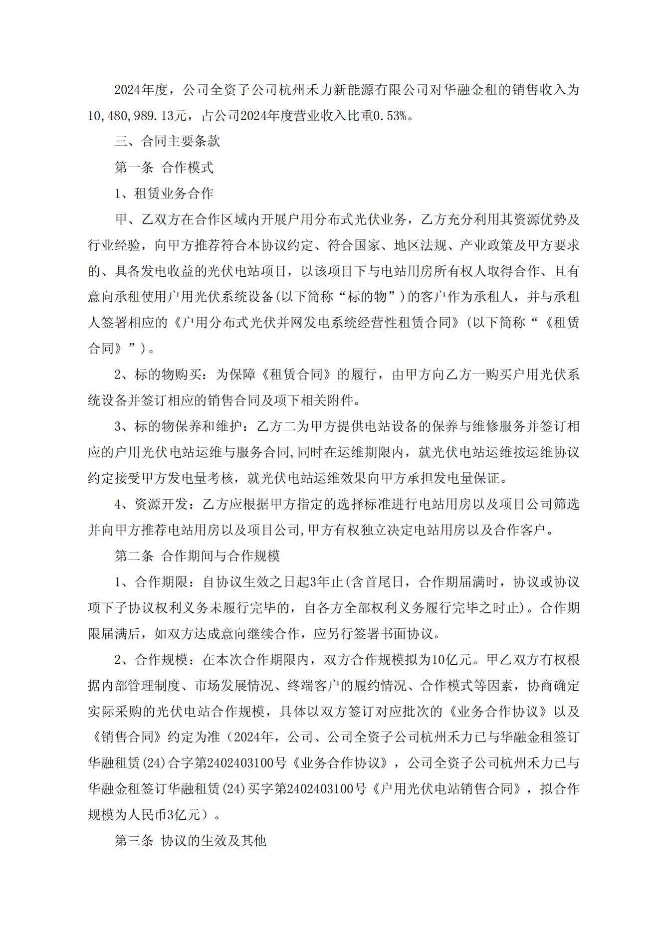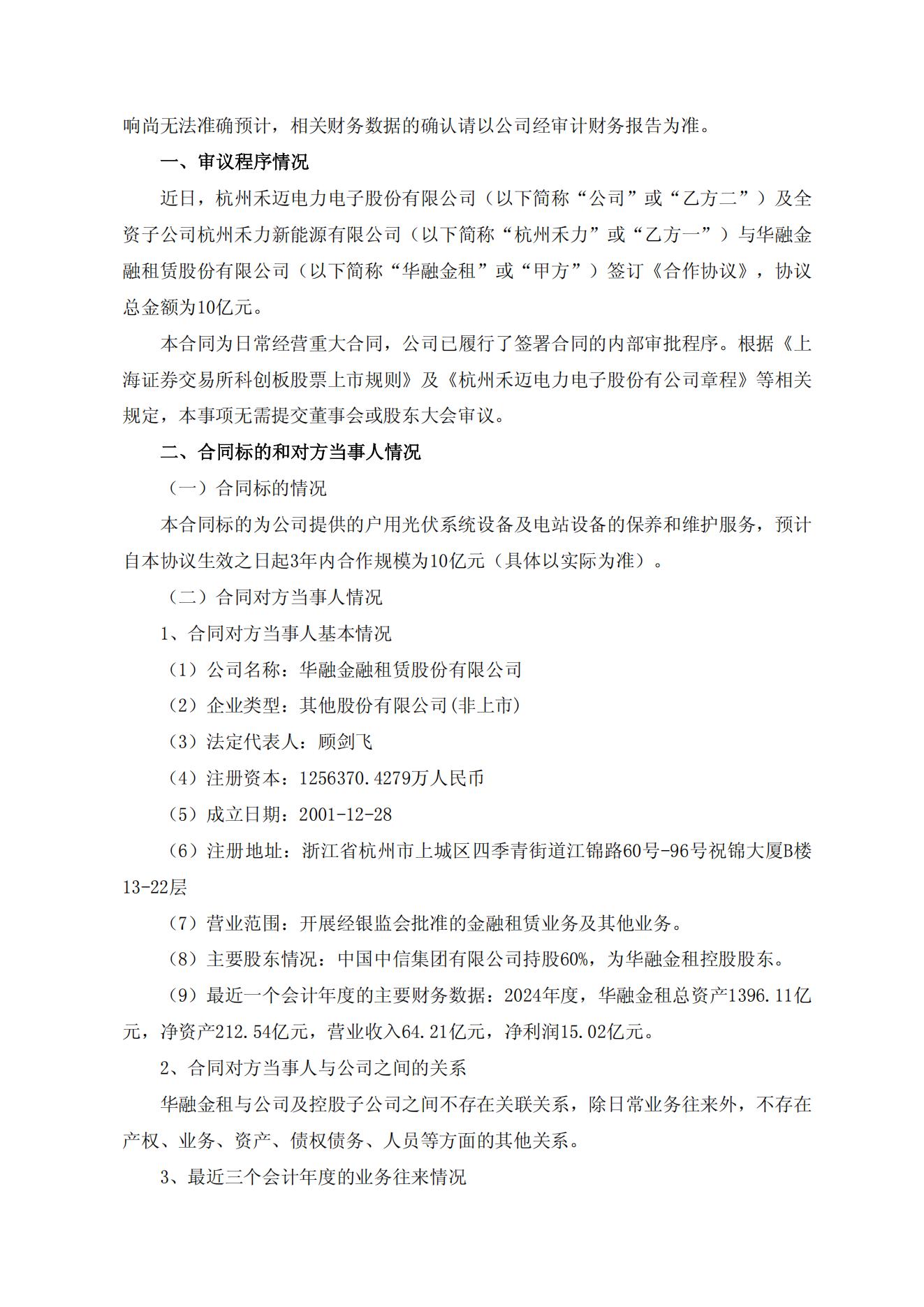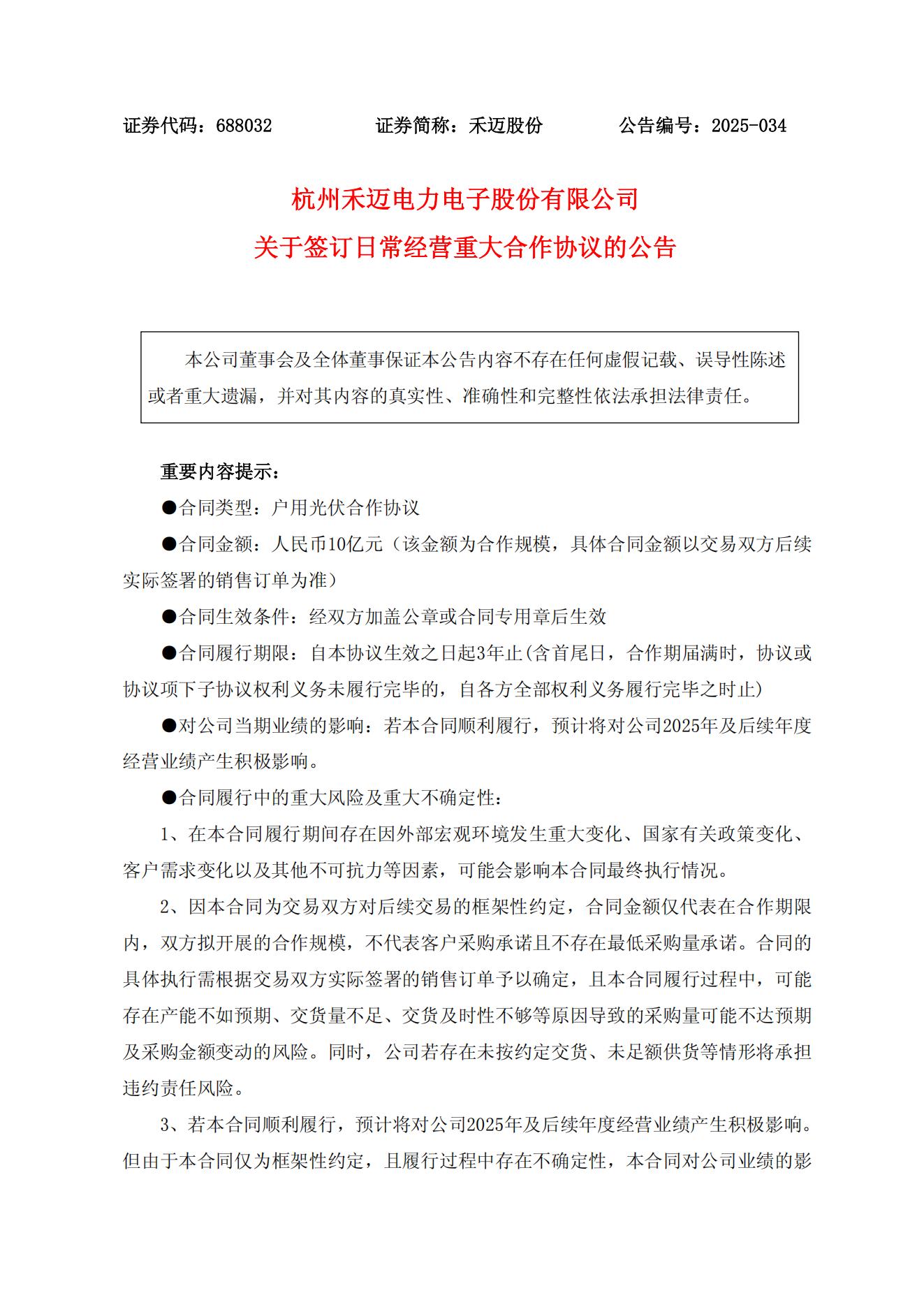 日(ri)前,禾邁股份(fen)發布公(gong)(gong)(gong)(gong)告,禾邁股份(fen)及(ji)全資子公(gong)(gong)(gong)(gong)司(si)與華融(rong)金融(rong)租賃股份(fen)有(you)限公(gong)(gong)(gong)(gong)司(si)簽(qian)訂(ding)合(he)作(zuo)協(xie)議(yi),本(ben)合(he)同(tong)標的為(wei)(wei)公(gong)(gong)(gong)(gong)司(si)提(ti)供(gong)的戶用光(guang)伏系統設備及(ji)電站設備的保養和(he)維護服務,預計自本(ben)協(xie)議(yi)生(sheng)效(xiao)之日(ri)起(qi)3年內合(he)作(zuo)規(gui)模為(wei)(wei)10億(yi)元(具體以實際(ji)為(wei)(wei)準)。具體金額以實際(ji)簽(qian)署(shu)的銷售訂(ding)單為(wei)(wei)準。該合(he)同(tong)為(wei)(wei)公(gong)(gong)(gong)(gong)司(si)日(ri)常經營(ying)重大合(he)同(tong),預計將對公(gong)(gong)(gong)(gong)司(si)2025年及(ji)后續年度經營(ying)業績產生(sheng)積極影響(xiang)。 上一篇: 這家光伏膠膜項目延期