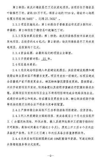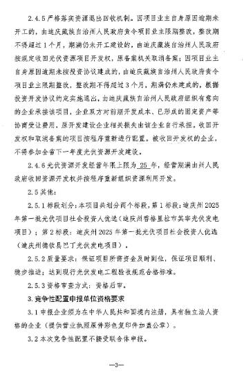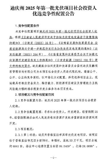 5月23日(ri),云南迪慶州發(fa)(fa)改委發(fa)(fa)布迪慶州2025年第一(yi)批光伏項目社會投資人優選(xuan)競爭性(xing)配置公告。 根據(ju)公告,本次(ci)優(you)選項目(mu)分為兩(liang)個標段(duan)。其(qi)中,第1標段(duan):迪(di)慶州(zhou)香格里拉(la)市(shi)其(qi)率光優(you)發電項目(mu),該項目(mu)位于香格里拉(la)市(shi)尼西多(duo)新(xin)陽村(cun)、李福村(cun),裝機20萬千(qian)瓦,總投資(zi)的6.6億(yi)元(yuan)。第2標段(duan):迪(di)慶州(zhou)德飲縣(xian)巴(ba)丁(ding)光優(you)發電項目(mu),該項目(mu)位于德飲縣(xian)葉枝(zhi)鎮巴(ba)丁(ding)村(cun),裝機20萬千(qian)瓦,總投資(zi)約7億(yi)元(yuan)。 此項(xiang)目開發建設經(jing)營期(qi)限25年,經(jing)營期(qi)限滿后,由(you)州(zhou)人民(min)政(zheng)府收(shou)回資源開發權(quan)并重新組織資源利用開發。 光伏電站項(xiang)目(mu)納入年(nian)度建設(she)規(gui)模后,其投資(zi)建設(she)規(gui)模和建設(she)場址等主要(yao)內容不(bu)得(de)擅(shan)自變(bian)更(geng)。項(xiang)目(mu)開發(fa)權一經確定,在(zai)項(xiang)目(mu)建成全容量(liang)投產前不(bu)得(de)變(bian)更(geng)業(ye)(ye)主,確因特殊情況(kuang)需要(yao)變(bian)更(geng)的,要(yao)按照省、州關于(yu)收回(hui)項(xiang)目(mu)開發(fa)權、取消各案以及按程序重(zhong)新進行(xing)配置(zhi)的要(yao)求(qiu)辦理。獲得(de)項(xiang)目(mu)開發(fa)權的項(xiang)目(mu)業(ye)(ye)主不(bu)得(de)將項(xiang)目(mu)轉包(bao)或(huo)分包(bao)給其他企業(ye)(ye),或(huo)進行(xing)非法轉讓和倒賣(mai)。存(cun)在(zai)擅(shan)自變(bian)更(geng)投資(zi)主體(ti)、轉讓倒賣(mai)前期手續等違(wei)法違(wei)規(gui)行(xing)為的企業(ye)(ye)不(bu)得(de)參與竟爭性配置(zhi)。 列入(ru)年度建(jian)設方案(an)的項目,完成各察后(hou)2個月內應實(shi)現(xian)開(kai)工(辦理用(yong)(yong)林(lin)用(yong)(yong)地(di)、環保水(shui)保、接入(ru)系統審批等開(kai)工前(qian)期手續的時間可剔(ti)除(chu),剔(ti)除(chu)時間最長(chang)不(bu)超過2個月),原則上開(kai)工后(hou)8個月內應具(ju)(ju)備投(tou)產條件,自(zi)開(kai)工之日起1年內應具(ju)(ju)備全容量并網件。 詳情如下: