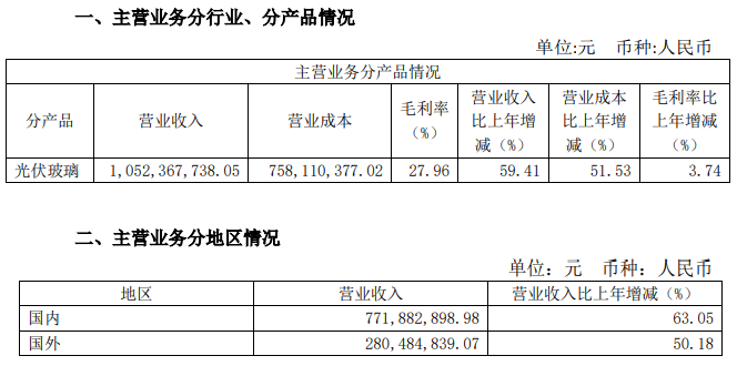 10月30日,河南安彩高科股份有限公司公布2021年前三季度光伏玻璃業務主要經營數據。2021年前三季度,安彩高科光伏玻璃營收10.52億元,較上年增加59.41%,營業成本為7.58億元,較去年增加51.53%;毛利率為27.96%,較上年增加3.74%。 從業務分部來看,國外營業收入為7.7億元,國外營業收入為2.8億元,營業收入較上年相比分別增加63.05%和50.18%。