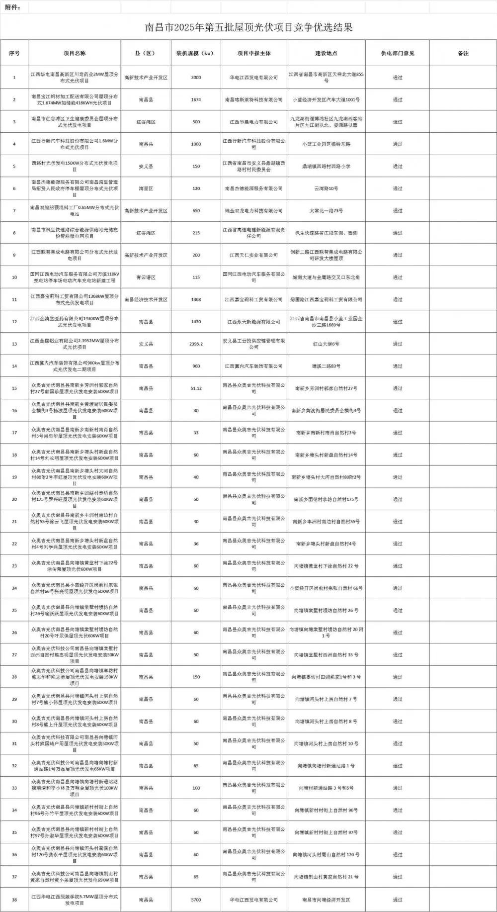5月29日,江(jiang)西(xi)省(sheng)南(nan)(nan)昌(chang)市(shi)發展改革委關(guan)于公布列入南(nan)(nan)昌(chang)市(shi)2025年第五批(pi)屋(wu)頂光伏項(xiang)目競爭(zheng)優選結果(guo)的通知。 文件顯(xian)示,南昌市(shi)2025年(nian)第(di)五批(pi)屋頂光伏(fu)項目(mu)競爭優選共(gong)有(you)光伏(fu)項目(mu)38個,規模共(gong)計19.84732MW。 通過優選項(xiang)目應在納入建設計劃后一年內建成并網,超出時限(xian)自動作(zuo)廢。 具(ju)體如(ru)下: 南昌市發展改革委關于公布列入南昌市2025年第五批屋頂光伏項目競爭優選結果的通知 各(ge)縣區發(fa)展(zhan)改革委、開發(fa)區經(jing)(jing)發(fa)局,灣里管理局經(jing)(jing)發(fa)辦,國網南昌供(gong)電公司,各(ge)有關單位: 按照《江(jiang)西(xi)省發(fa)展(zhan)改革委(wei)(wei) 江(jiang)西(xi)省能源(yuan)局關于補充完善〈江(jiang)西(xi)省光伏發(fa)電(dian)、風電(dian)項目(mu)開(kai)發(fa)工(gong)作(zuo)指南(nan)〉有(you)關事(shi)項的通知》要求,開(kai)展(zhan)了全(quan)市(shi)屋頂光伏項目(mu)2025年第五(wu)批競爭性(xing)優(you)選工(gong)作(zuo),南(nan)昌市(shi)發(fa)展(zhan)改革委(wei)(wei)對(dui)項目(mu)材料進行合規性(xing)審查,南(nan)昌供電(dian)公(gong)司對(dui)電(dian)網(wang)消納材料進行合規性(xing)審查,現將優(you)選結果予以公(gong)布(bu)。 通(tong)過優選(xuan)項(xiang)目應在(zai)納入建(jian)設計(ji)劃(hua)后一年(nian)內建(jian)成并網(wang),超出時(shi)限(xian)自動作廢。各地要(yao)落實《江西(xi)省(sheng)可(ke)再(zai)(zai)生能(neng)源(yuan)項(xiang)目建(jian)設落實“三(san)管三(san)必(bi)須”要(yao)求工作指(zhi)導意見》有關要(yao)求,指(zhi)導督促(cu)開(kai)發主體做(zuo)好屋(wu)頂光(guang)伏電(dian)站的安(an)全質量(liang)保障措施(shi);按照《江西(xi)省(sheng)能(neng)源(yuan)局關于(yu)進一步(bu)做(zuo)好可(ke)再(zai)(zai)生能(neng)源(yuan)發電(dian)項(xiang)目建(jian)檔立卡工作的通(tong)知》要(yao)求,督促(cu)已開(kai)工項(xiang)目在(zai)可(ke)再(zai)(zai)生能(neng)源(yuan)規劃(hua)項(xiang)目庫管理系統中及時(shi)更新建(jian)設進度(du),及時(shi)做(zuo)好建(jian)檔立卡工作。 附件:南昌(chang)市(shi)2025年第(di)五批(pi)屋(wu)頂光伏項目(mu)競爭優選結果.xlsx 南昌市發展(zhan)和改(gai)革委員會(hui) 2025年5月(yue)28日