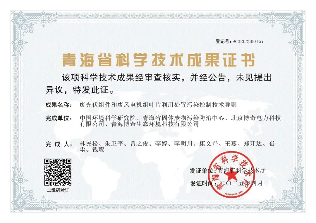 近日,由北京博奇、青海博奇參與起草的全國首個針對廢光伏組件和廢風電機組葉片利用處置污染控制的地方標準1 ——《青海省廢光伏組件和廢風電機組葉片利用處置污染控制技術導則》(DB63T 2388-2024)取得青海省科學技術成果證書,標志著博奇在廢光伏組件和廢風電葉片回收及資源化利用方面取得重大突破。 青海省科學技術成果證書 青海博奇與北京博奇將共同針對風光發電等項目,深入研究光伏組件和風電葉片的全生命周期,在梯次利用及回收拆解資源化兩條技術路線上適時擇優部署產線,并為后續廢舊風電葉片回收及資源化利用項目做好儲備,以保障回收利用工作能高質量開展及推進,有效控制生態環境風險。 此項成果成功填補了青海省光伏回收領域的標準空白,對推動新能源產業朝著可持續、綠色方向發展意義重大,為實現“雙碳”目標提供了富有價值的標桿實踐。