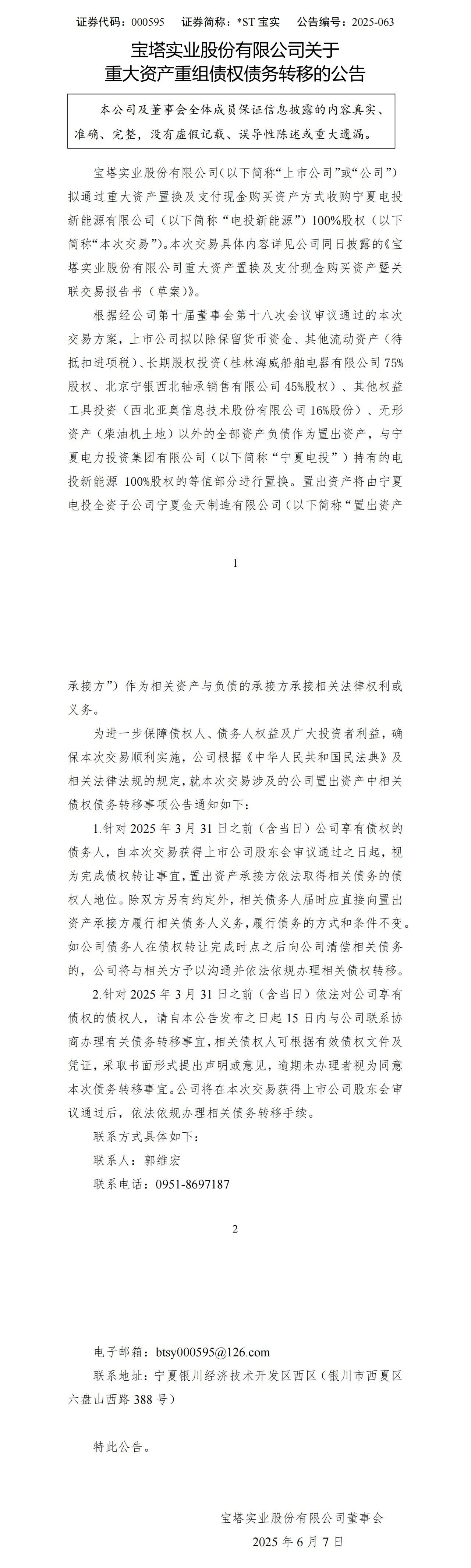 6月7日,*ST寶(bao)實(shi)(shi)(全稱(cheng)寶(bao)塔(ta)(ta)實(shi)(shi)業股份有(you)限公(gong)(gong)司,以下簡稱(cheng)“寶(bao)塔(ta)(ta)實(shi)(shi)業”)發布(bu)《重大資(zi)產(chan)置換及(ji)支付現(xian)金購買資(zi)產(chan)暨關聯交易報(bao)告書(草(cao)案)》(以下簡稱(cheng)“草(cao)案”),公(gong)(gong)布(bu)了收購寧夏電投(tou)新能(neng)源(yuan)(yuan)有(you)限公(gong)(gong)司(以下簡稱(cheng)“電投(tou)新能(neng)源(yuan)(yuan)”)100%股權的最新方(fang)案。 《草案(an)》顯示,寶(bao)塔實業擬將除保留(liu)貨(huo)幣資(zi)(zi)金、其他流動資(zi)(zi)產(chan)(chan)(待(dai)抵扣進項稅(shui))、長(chang)期股(gu)(gu)權(quan)(quan)投(tou)資(zi)(zi)(桂林海(hai)威75%股(gu)(gu)權(quan)(quan)、北(bei)京(jing)西(xi)軸銷售45%股(gu)(gu)權(quan)(quan))、其他權(quan)(quan)益工具投(tou)資(zi)(zi)(西(xi)北(bei)亞奧(ao)16%股(gu)(gu)權(quan)(quan))、無形資(zi)(zi)產(chan)(chan)(柴(chai)油(you)機土(tu)地)以外的全部資(zi)(zi)產(chan)(chan)負債作為置出資(zi)(zi)產(chan)(chan),與寧夏電(dian)力投(tou)資(zi)(zi)集團(tuan)有(you)限(xian)公司(以下簡稱“寧夏電(dian)投(tou)”)持(chi)有(you)的電(dian)投(tou)新能源(yuan)100%股(gu)(gu)權(quan)(quan)即置入資(zi)(zi)產(chan)(chan)的等值部分進行置換(huan)。 雙方協商(shang)確定擬置(zhi)入資(zi)產(chan)的(de)(de)交(jiao)(jiao)(jiao)易(yi)(yi)對(dui)價為80,927.00萬(wan)(wan)元(yuan)。雙方同意以(yi)置(zhi)入資(zi)產(chan)和(he)置(zhi)出資(zi)產(chan)交(jiao)(jiao)(jiao)易(yi)(yi)對(dui)價的(de)(de)等值部分(即46,804.00萬(wan)(wan)元(yuan))進行置(zhi)換,針對(dui)置(zhi)入資(zi)產(chan)和(he)置(zhi)出資(zi)產(chan)交(jiao)(jiao)(jiao)易(yi)(yi)價格的(de)(de)差額部分,即34,123.00萬(wan)(wan)元(yuan),由寶塔實業(ye)以(yi)支(zhi)付現金(jin)方式(shi)自置(zhi)入資(zi)產(chan)交(jiao)(jiao)(jiao)割日起12個月內向(xiang)交(jiao)(jiao)(jiao)易(yi)(yi)對(dui)方予(yu)以(yi)支(zhi)付。 寶塔實(shi)業(ye)表示,本次交易完成后,上市公(gong)司現(xian)有軸承業(ye)務將實(shi)現(xian)置出,主營(ying)業(ye)務變更為風力發(fa)電(dian)、光伏發(fa)電(dian)及儲能電(dian)站的投(tou)資(zi)開發(fa)和運營(ying),以及船舶(bo)電(dian)器的生產與(yu)銷售。 值的(de)注意的(de)是(shi),此次交(jiao)易的(de)交(jiao)易對方(fang)寧夏(xia)電投(tou)為寶塔(ta)實業控股(gu)股(gu)東寧夏(xia)國有資(zi)本運營集團(tuan)有限責(ze)任公(gong)司(si)的(de)全資(zi)子公(gong)司(si)。 2024年7月(yue)25日,寶(bao)塔實業(ye)發(fa)布公告稱,公司正在籌劃(hua)通(tong)過重(zhong)大(da)資(zi)(zi)(zi)產置換(huan)及(ji)發(fa)行股(gu)份購(gou)買(mai)資(zi)(zi)(zi)產方式(shi)收購(gou)電投(tou)新能(neng)源(yuan)100%股(gu)權。并(bing)表示,通(tong)過本次交(jiao)易,寶(bao)塔實業(ye)將置出(chu)持續虧損的(de)軸承(cheng)業(ye)務(wu)資(zi)(zi)(zi)產,置入具有廣闊市(shi)場前景和(he)較強盈(ying)利能(neng)力(li)(li)的(de)新能(neng)源(yuan)發(fa)電及(ji)儲能(neng)業(ye)務(wu)資(zi)(zi)(zi)產,實現(xian)由軸承(cheng)業(ye)務(wu)到新能(neng)源(yuan)業(ye)務(wu)的(de)產業(ye)轉型,增(zeng)強上市(shi)公司的(de)核心競爭力(li)(li)和(he)盈(ying)利能(neng)力(li)(li)。 2024年10月30日,寶(bao)塔實(shi)業發布公(gong)告稱(cheng),公(gong)司擬置出價值(zhi)5.47億(yi)元的軸承業務等資產(chan),并作價10.71億(yi)元收購電投新能(neng)源100%股權,同時(shi)募(mu)集(ji)不超(chao)過5.24億(yi)元配套資金(jin)。交易完成(cheng)后,新能(neng)源發電及儲(chu)能(neng)業務將(jiang)成(cheng)為寶(bao)塔實(shi)業的主營業務。 2025年4月11日(ri),寶(bao)塔(ta)實(shi)業發(fa)(fa)(fa)布《關(guan)于終止發(fa)(fa)(fa)行(xing)股份(fen)(fen)購買資(zi)(zi)(zi)產(chan)并(bing)募集配(pei)套資(zi)(zi)(zi)金(jin)(jin)、撤回申請(qing)文件并(bing)擬對原重(zhong)大(da)資(zi)(zi)(zi)產(chan)重(zhong)組方(fang)案進行(xing)重(zhong)大(da)調(diao)整的議案》等相關(guan)議案,提及(ji)(ji)(ji)交易(yi)雙(shuang)方(fang)擬將太陽(yang)山風電場三四(si)期項(xiang)目(mu)自置(zhi)入資(zi)(zi)(zi)產(chan)中剝離(li)并(bing)對置(zhi)入資(zi)(zi)(zi)產(chan)交易(yi)作(zuo)價進行(xing)調(diao)整。考(kao)慮(lv)到重(zhong)大(da)資(zi)(zi)(zi)產(chan)重(zhong)組方(fang)案調(diao)整后,置(zhi)入資(zi)(zi)(zi)產(chan)及(ji)(ji)(ji)置(zhi)出資(zi)(zi)(zi)產(chan)作(zuo)價差(cha)額(e)有所降低,寶(bao)塔(ta)實(shi)業擬以現金(jin)(jin)支(zhi)付置(zhi)入資(zi)(zi)(zi)產(chan)及(ji)(ji)(ji)置(zhi)出資(zi)(zi)(zi)產(chan)的作(zuo)價差(cha)額(e),不再發(fa)(fa)(fa)行(xing)股份(fen)(fen)及(ji)(ji)(ji)募集配(pei)套資(zi)(zi)(zi)金(jin)(jin)。 原(yuan)文(wen)如下:
