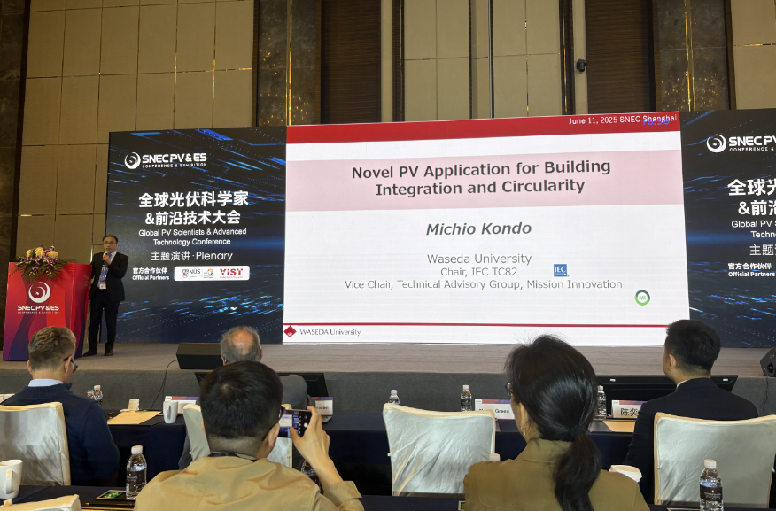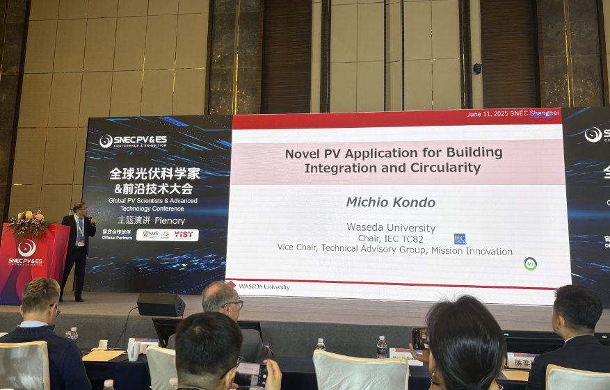 Michio Kondo 教授,日本早稻(dao)田大(da)學 Michio Kondo教授(shou)的(de)演講指出,全(quan)球(qiu)光(guang)(guang)伏(fu)累(lei)計裝機量達1.52TW(中國(guo)占38%、美(mei)國(guo)21%、印度12%),為(wei)建(jian)筑光(guang)(guang)伏(fu)一(yi)體化(hua)(BIPV)和循(xun)環經濟創造(zao)新(xin)機遇(yu)。針對(dui)鈣(gai)鈦礦光(guang)(guang)伏(fu)長期穩(wen)定(ding)性難題,Kondo團隊開發(fa)的(de)新(xin)型蜂窩(wo)結構組件使回收(shou)率提升至(zhi)92%,較傳統工藝(yi)提高27個百分(fen)(fen)點,同時將BIPV模(mo)塊生命周期延(yan)長至(zhi)25年(傳統產品20年)。該技(ji)術通過(guo)優化(hua)EVA封裝層與背板材料分(fen)(fen)離工藝(yi),使每噸(dun)廢棄組件回收(shou)能(neng)耗降(jiang)低35%,直接(jie)推動(dong)光(guang)(guang)伏(fu)產業循(xun)環經濟指標(CEI)提升至(zhi)0.81(行業平(ping)均0.63)。研(yan)究特別強調,在年新(xin)增(zeng)300GW的(de)市(shi)場規模(mo)下,該突破可(ke)使全(quan)球(qiu)光(guang)(guang)伏(fu)產業鏈年減(jian)少12萬(wan)噸(dun)聚合(he)(he)物廢棄物,完美(mei)契合(he)(he)建(jian)筑一(yi)體化(hua)對(dui)美(mei)學設(she)計與全(quan)生命周期管理的(de)雙重需求,為(wei)萬(wan)億(yi)級(ji)BIPV市(shi)場提供(gong)了關鍵技(ji)術支撐。