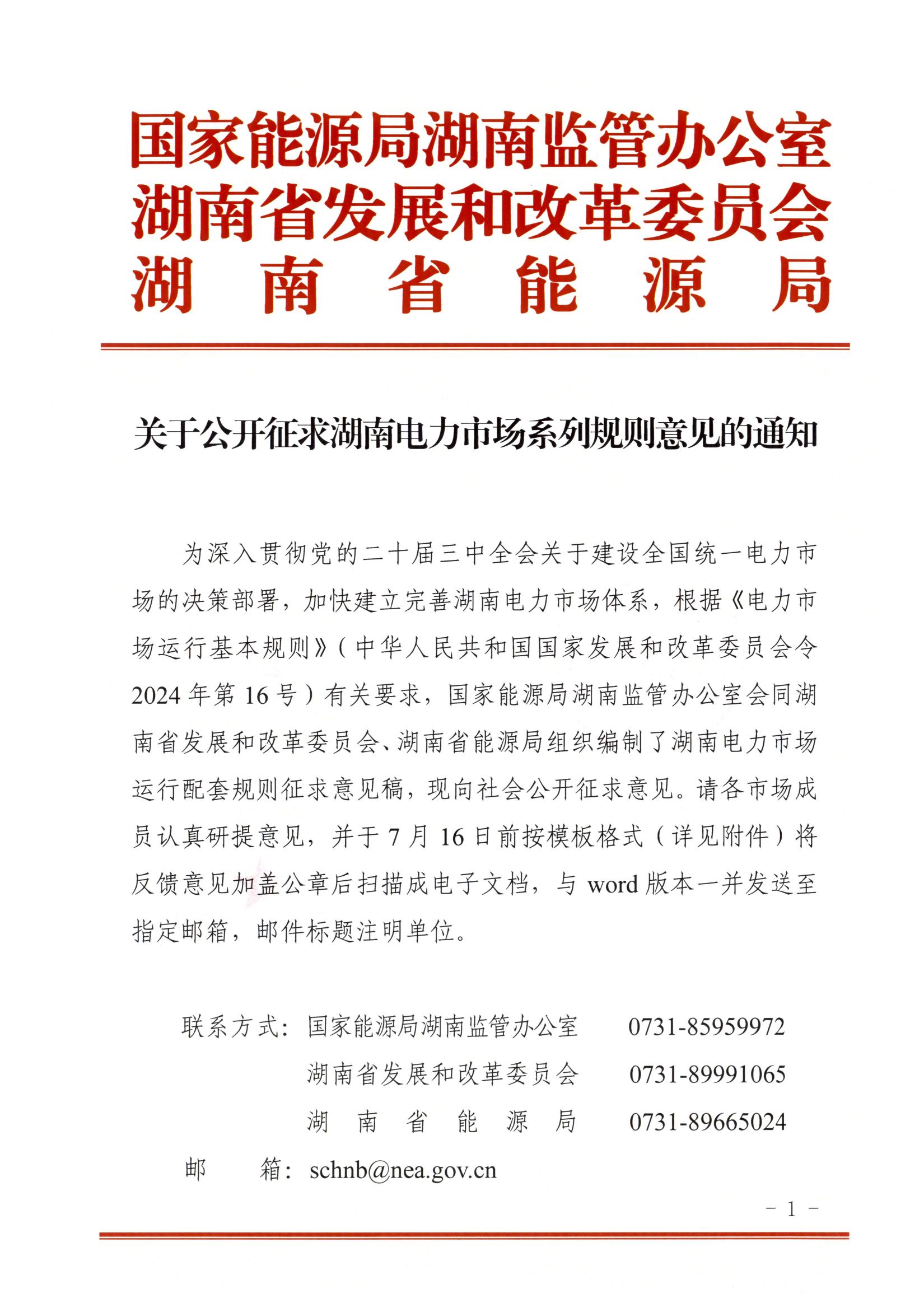 6月17日,國家能(neng)源局(ju)湖(hu)南(nan)監管辦(ban)公室(shi)發布了(le)關于公開征求湖(hu)南(nan)電(dian)力市場(chang)系列規則意見的通知。通知指(zhi)出,《湖(hu)南(nan)省電(dian)力現(xian)貨(huo)市場(chang)交(jiao)易(yi)(yi)(yi)實施(shi)細(xi)則》(征求意見稿)中提到,現(xian)階段,參與現(xian)貨(huo)交(jiao)易(yi)(yi)(yi)的發電(dian)側經營主體包(bao)(bao)括公用燃煤機(ji)組、燃氣(qi)機(ji)組、風電(dian)及(ji)光伏等;參與現(xian)貨(huo)交(jiao)易(yi)(yi)(yi)的用戶(hu)側經營主體包(bao)(bao)括批(pi)發市場(chang)用戶(hu)及(ji)電(dian)網(wang)企業代理購電(dian)用戶(hu);參與現(xian)貨(huo)交(jiao)易(yi)(yi)(yi)的新型主體包(bao)(bao)括獨立新型儲能(neng)、虛擬電(dian)廠等。 發電側:220千(qian)(qian)伏(fu)及以上(shang)公(gong)用燃煤機(ji)組(zu)以報(bao)量(liang)(liang)(liang)報(bao)價(jia)方式參與現貨(huo)交(jiao)(jiao)易,納入容量(liang)(liang)(liang)電價(jia)機(ji)制執行范圍的(de)110千(qian)(qian)伏(fu)公(gong)用燃煤(含煤矸石)機(ji)組(zu)以報(bao)量(liang)(liang)(liang)不(bu)報(bao)價(jia)方式參與現貨(huo)交(jiao)(jiao)易。35千(qian)(qian)伏(fu)及以上(shang)風電、光伏(fu)以報(bao)量(liang)(liang)(liang)報(bao)價(jia)方式參與現貨(huo)交(jiao)(jiao)易,新(xin)(xin)能(neng)(neng)源場站與其配建新(xin)(xin)型儲能(neng)(neng)按聯(lian)合方式運行、一(yi)體化申報(bao);其余(yu)風電、光伏(fu)原則上(shang)不(bu)報(bao)量(liang)(liang)(liang)不(bu)報(bao)價(jia),作為價(jia)格接受者參與現貨(huo)交(jiao)(jiao)易,若具備條件可選(xuan)擇(ze)(ze)其他參與方式,其中10千(qian)(qian)伏(fu)風電、光伏(fu)可選(xuan)擇(ze)(ze)以報(bao)量(liang)(liang)(liang)報(bao)價(jia)方式參與現貨(huo)交(jiao)(jiao)易,10千(qian)(qian)伏(fu)以下風電、光伏(fu)可選(xuan)擇(ze)(ze)由虛擬(ni)電廠運營商代理(li)參與現貨(huo)交(jiao)(jiao)易。 原文如(ru)下: 關于公開征求湖南電力市場系列規則意見的通知 為深入貫徹黨的(de)二十屆三中全會關于(yu)建設全國(guo)統一(yi)(yi)電(dian)(dian)(dian)力市場(chang)(chang)的(de)決策(ce)部署,加(jia)快建立完善(shan)湖(hu)南(nan)電(dian)(dian)(dian)力市場(chang)(chang)體系,根據(ju)《電(dian)(dian)(dian)力市場(chang)(chang)運行(xing)基本(ben)規則(ze)》(中華人民(min)共和(he)(he)國(guo)國(guo)家(jia)發(fa)展(zhan)和(he)(he)改革(ge)委員(yuan)會令2024年第(di)16號)有關要求,國(guo)家(jia)能源(yuan)局(ju)湖(hu)南(nan)監管辦(ban)公(gong)室會同(tong)湖(hu)南(nan)省(sheng)發(fa)展(zhan)和(he)(he)改革(ge)委員(yuan)會、湖(hu)南(nan)省(sheng)能源(yuan)局(ju)組織編制了湖(hu)南(nan)電(dian)(dian)(dian)力市場(chang)(chang)運行(xing)配套規則(ze)征(zheng)求意見(jian)稿,現向(xiang)社會公(gong)開征(zheng)求意見(jian)。請(qing)各市場(chang)(chang)成(cheng)(cheng)員(yuan)認真研(yan)提意見(jian),并于(yu)7月16日(ri)前按模板格式(詳見(jian)附件(jian))將(jiang)反饋(kui)意見(jian)加(jia)蓋公(gong)章后掃描成(cheng)(cheng)電(dian)(dian)(dian)子(zi)文檔,與word版本(ben)一(yi)(yi)并發(fa)送至指(zhi)定郵箱(xiang),郵件(jian)標題注明(ming)單位(wei)。 聯系(xi)方式:國家能源局湖(hu)南監管辦公室 0731-85959972 湖南省(sheng)發展(zhan)和改革委員會(hui) 0731-89991065 湖(hu) 南 省 能(neng) 源 局 0731-89665024 郵(you) 箱:schnb@nea.gov.cn 附(fu)件:1. 2. 3. 4. 5. 6. 7. 8. 國家能源局湖南監(jian)管辦(ban)公室 湖南省發展和改革委員(yuan)會(hui) 湖 南(nan) 省 能 源(yuan) 局 2025年(nian)6月16日