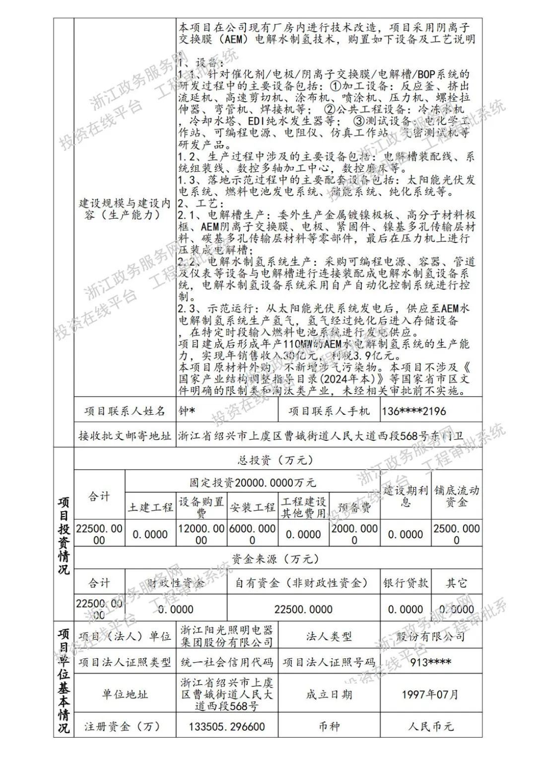 近日,浙江陽光(guang)照明電器集(ji)團股(gu)份有限公(gong)司年產110兆瓦AEM制氫裝備研發(fa)及制造項目獲備案。 根據項目(mu)信息,浙江陽光照明(ming)電(dian)器(qi)(qi)集團股(gu)份有限公(gong)司(si)年(nian)產110兆(zhao)瓦AEM制氫(qing)裝備研發及制造項目(mu)為(wei)新建項目(mu),建設(she)地點為(wei)浙江省紹興市上虞區,項目(mu)總投資(zi)22500萬(wan)元。項目(mu)單位(wei)為(wei)浙江陽光照明(ming)電(dian)器(qi)(qi)集團股(gu)份有限公(gong)司(si)。 擬開工時間為(wei)2025年6月,擬建成時間為(wei)2028年9月。 建設規模與建設內容(生產能力): 本項目在公司現有廠房內進(jin)行技術(shu)(shu)改造,項目采用陰離子交換膜(AEM)電解水(shui)制氫技術(shu)(shu),購(gou)置如下設備(bei)及工藝說明。 1、設備: 1.1、針對催化(hua)劑(ji)/電(dian)(dian)極/陰離子交換膜/電(dian)(dian)解槽/BOP系(xi)統的(de)研(yan)發(fa)過(guo)程(cheng)中的(de)主(zhu)要設備包括:①加工(gong)(gong)設備:反應(ying)釜、擠出流延機(ji)(ji)(ji)、高(gao)速剪切機(ji)(ji)(ji)、涂布(bu)機(ji)(ji)(ji)、噴涂機(ji)(ji)(ji)、壓力機(ji)(ji)(ji)、螺栓拉伸器(qi)(qi)、彎(wan)管(guan)機(ji)(ji)(ji)、焊接機(ji)(ji)(ji)等(deng); ②公(gong)共工(gong)(gong)程(cheng)設備:冷(leng)凍水機(ji)(ji)(ji),冷(leng)卻水塔、EDI純(chun)水發(fa)生器(qi)(qi)等(deng); ③測(ce)試設備:電(dian)(dian)化(hua)學工(gong)(gong)作站(zhan)、可(ke)編程(cheng)電(dian)(dian)源、電(dian)(dian)阻儀、仿真工(gong)(gong)作站(zhan)、氣密測(ce)試機(ji)(ji)(ji)等(deng)研(yan)發(fa)產品(pin)。 1.2、生(sheng)產過程中(zhong)涉及的主要(yao)設備包括(kuo):電解槽(cao)裝(zhuang)配線(xian)、系統組(zu)裝(zhuang)線(xian)、數(shu)控多軸加工中(zhong)心,數(shu)控磨(mo)床等(deng)。 1.3、落地示范過(guo)程中的(de)主要配套設備包括:太(tai)陽(yang)能光伏發(fa)電系(xi)統(tong)、燃(ran)料電池發(fa)電系(xi)統(tong)、儲能系(xi)統(tong)、純化系(xi)統(tong)等(deng)。 2、工藝: 2.1、電解槽生產:委外(wai)生產金屬鍍鎳極板、高分子材料(liao)(liao)極框、AEM陰離子交換膜、電極、緊固(gu)件(jian)(jian)、鎳基多孔傳(chuan)輸(shu)層材料(liao)(liao)、碳基多孔傳(chuan)輸(shu)層材料(liao)(liao)等零部件(jian)(jian),最后在壓力機上進行壓裝成電解槽; 2.2、電解水(shui)制氫(qing)系統(tong)生產:采購(gou)可(ke)編程電源(yuan)、容(rong)器、管道及儀表(biao)等設備與電解槽進行連接(jie)裝配成電解水(shui)制氫(qing)設備系統(tong),電解水(shui)制氫(qing)設備系統(tong)采用自產自動化(hua)控(kong)制系統(tong)進行控(kong)制。 2.3、示范運行:從(cong)太陽能(neng)光伏系(xi)(xi)統發(fa)電(dian)(dian)后,供(gong)應至AEM水電(dian)(dian)解制氫系(xi)(xi)統生產氫氣(qi),氫氣(qi)經過純化(hua)后進入存儲設備(bei),在特定時(shi)段輸(shu)入燃料電(dian)(dian)池系(xi)(xi)統進行發(fa)電(dian)(dian)供(gong)應。 項目建成后形(xing)成年產110MW的AEM水電(dian)解制氫(qing)系統的生產能力,實現年銷售收入30億元,利稅3.9億元。 據了解(jie),浙(zhe)江陽光(guang)照(zhao)(zhao)(zhao)明(ming)(ming)(ming)電(dian)(dian)器(qi)集(ji)團股份有限公司(si)(si)(簡稱(cheng):陽光(guang)照(zhao)(zhao)(zhao)明(ming)(ming)(ming))創(chuang)立于1975年,五十年來致力于節能(neng)照(zhao)(zhao)(zhao)明(ming)(ming)(ming)行(xing)業,是(shi)A股主板上市公司(si)(si),公司(si)(si)產品涵蓋LED智能(neng)照(zhao)(zhao)(zhao)明(ming)(ming)(ming)、家居(ju)照(zhao)(zhao)(zhao)明(ming)(ming)(ming)、商業照(zhao)(zhao)(zhao)明(ming)(ming)(ming)、戶(hu)外照(zhao)(zhao)(zhao)明(ming)(ming)(ming)、電(dian)(dian)工電(dian)(dian)器(qi)等領域(yu)。 項目詳情如下: