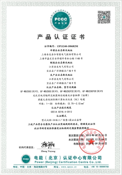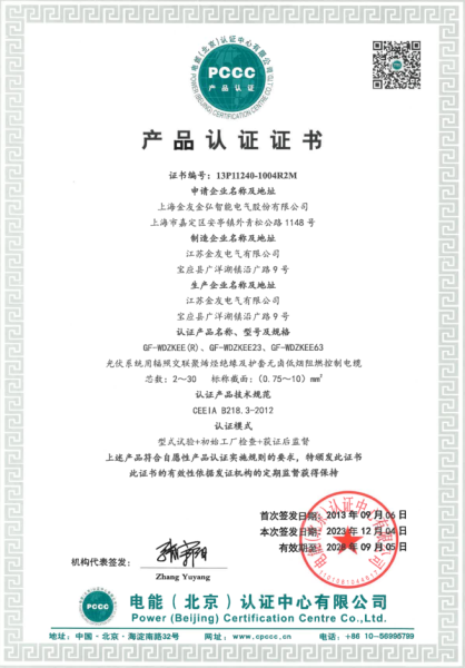 金友集團于2013年9月6日以卓越之姿,成為國內首家成功通過光伏電纜PCCC產品認證的企業,并在同年強勢邁進國家電投采購名錄,在光伏電纜發展史上留下濃墨重彩的一筆! PCCC認證,由電能(北京)產品認證中心有限公司執行,自2005年成立以來,一直是電力行業機電產品認證的標桿機構。其管理委員會匯聚了國家主管部門、兩大電網、五大發電集團等各方大佬和行業專家,從源頭上保證了認證的專業、科學、公正。能通過PCCC認證,意味著產品在質量、技術、穩定性等各方面都達到了行業頂尖水平。而金友集團作為首家通過光伏電纜PCCC認證的企業,無疑展現出其在光伏電纜領域的深厚技術積累與卓越品質把控。 順利進入國家電投采購名錄,對金友集團來說更是如虎添翼。國家電投作為能源行業的巨頭,其采購標準嚴苛,能成為其供應商,是對金友集團產品實力和品牌信譽的高度認可。這不僅為金友集團帶來了廣闊的市場空間,更提升了品牌的行業影響力,使其在眾多競爭對手中脫穎而出。 2013年是金友集團發展歷程中的一個高光點,更是其持續奮進的新起點。未來,金友集團將繼續秉持創新精神,不斷提升產品品質與技術水平,在光伏電纜領域創造更多輝煌,為全球光伏產業發展貢獻更多力量,助力實現綠色能源的美好未來。