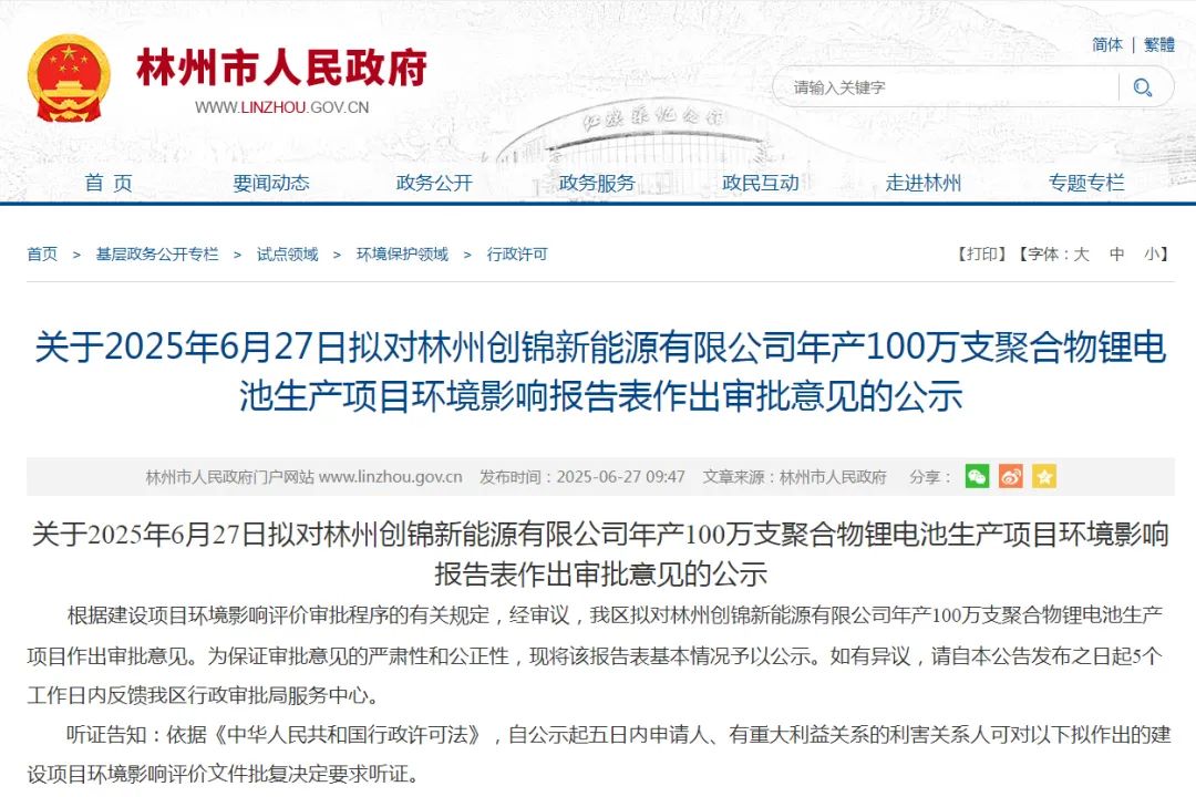 日前,河南林州市人民政府網站發布《關于2025年6月27日擬對林州創錦新能源有限公司年產100萬支聚合物鋰電池生產項目環境影響報告表作出審批意見的公示》,這一鋰電池項目正式迎來階段性進展。 公示信息顯示,項目選址河南省安陽市林州市紅旗渠經濟技術開發區電子產業園,林州創錦新能源有限公司擬投資5180萬元建設年產100萬支聚合物鋰電池生產項目。 林州創錦新能源有限公司成立于2023年,是深圳市創錦新能源有限公司旗下子公司。去年4月,林州創錦新能源有限公司獲林州巨創私募股權投資合伙企業(有限合伙)1000萬元股權融資,林州巨創私募股權投資合伙企業(有限合伙)就此成為公司第二大股東,持股比例33.33333%。 此次投建年產100萬支聚合物鋰電池生產項目,無疑是該公司在產能上的又一次加碼,體現了其對聚合物鋰電池市場的看好。 聚合物鋰電池是在液態鋰離子電池基礎上發展起來的,它的正極和負極材料和液態鋰離子電池相同,但它采用了凝膠電解液和鋁塑膜做外包裝,具有能量密度高、電池外形靈活性強、安全性好等優點,能夠很好滿足產品對輕薄化、小型化、高性能和使用安全的要求,在新興領域應用越來越廣泛,市場規模持續擴大。 得益于新能源汽車行業的快速發展,尤其是電動汽車和混合動力汽車的普及,2025至2030年中國鋰聚合物電池市場規模預計將呈現顯著增長趨勢。 行業分析認為,2025年中國鋰聚合物電池市場規模預計達到約500億元人民幣,同比增長18%。預計到2027年,市場規模將突破700億元人民幣,年復合增長率維持在15%左右。 不過,隨著人形機器人、無人機、智能穿戴設備等智能場景的誕生,以及新能源汽車、儲能需求的升級,市場也對電池的能量密度和續航能力提出了更高要求,對快速充電功能的需求也日益迫切。 這將持續推動電池生產企業不斷擴大產能、優化產品性能、降低成本,以滿足市場的需求,同時也將吸引更多的企業進入該行業,加劇市場競爭,為整個行業的快速發展和技術進步提供新動能。