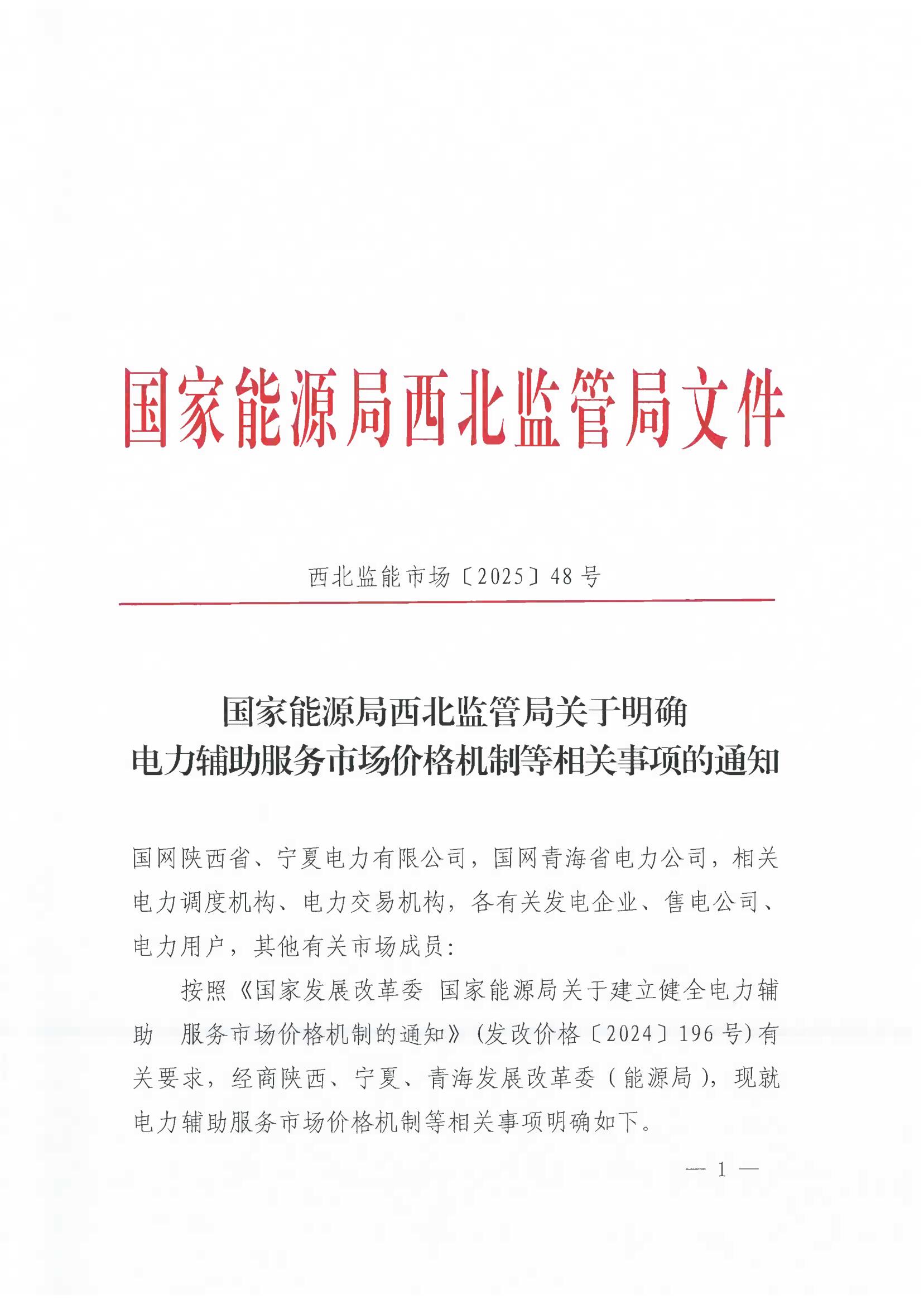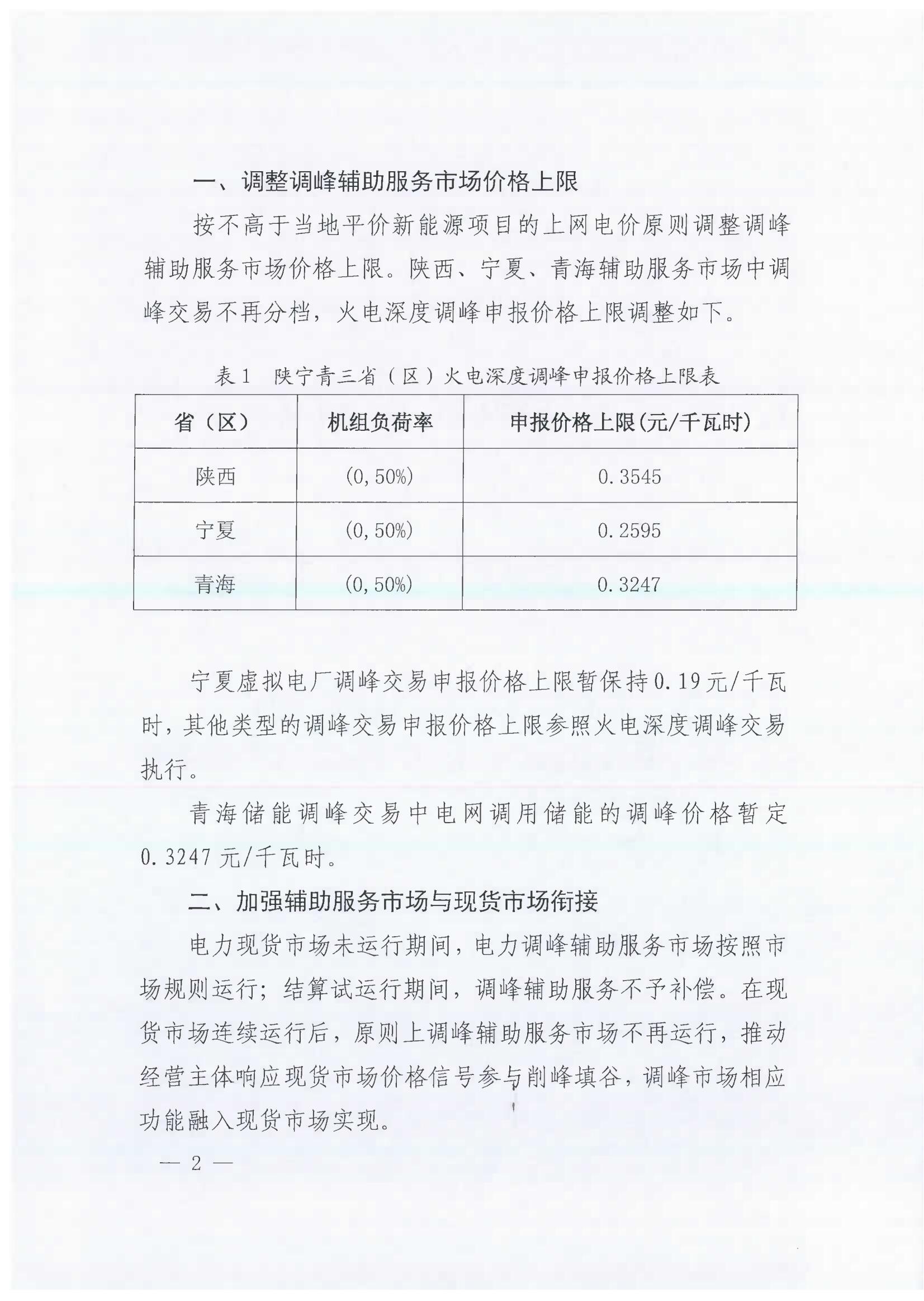 7月1日,國家能(neng)源(yuan)局西北監管(guan)局關于(yu)明確電力輔(fu)助服(fu)(fu)務市(shi)場價格機制等相關事項的通知(zhi),通知(zhi)指出,按(an)不高于(yu)當地(di)平價新能(neng)源(yuan)項目(mu)的上(shang)網電價原(yuan)則調(diao)整(zheng)(zheng)調(diao)峰輔(fu)助服(fu)(fu)務市(shi)場價格上(shang)限(xian)。陜西、寧夏、青海輔(fu)助服(fu)(fu)務市(shi)場中調(diao)峰交易不再(zai)分(fen)檔,火電深度調(diao)峰申(shen)報價格上(shang)限(xian)調(diao)整(zheng)(zheng)如下: 寧夏(xia)虛擬電廠調峰交(jiao)(jiao)易申報價格上限(xian)暫保持(chi)0.19元(yuan)/千瓦(wa)時,其他類型(xing)的調峰交(jiao)(jiao)易申報價格上限(xian)參照火電深度調峰交(jiao)(jiao)易執行(xing)。 青海儲能(neng)調(diao)峰(feng)交(jiao)易中電網調(diao)用儲能(neng)的調(diao)峰(feng)價(jia)格暫定0.3247 元/千瓦時。 原文(wen)如(ru)下: