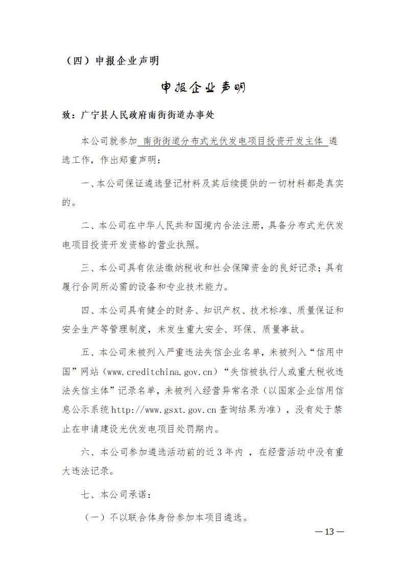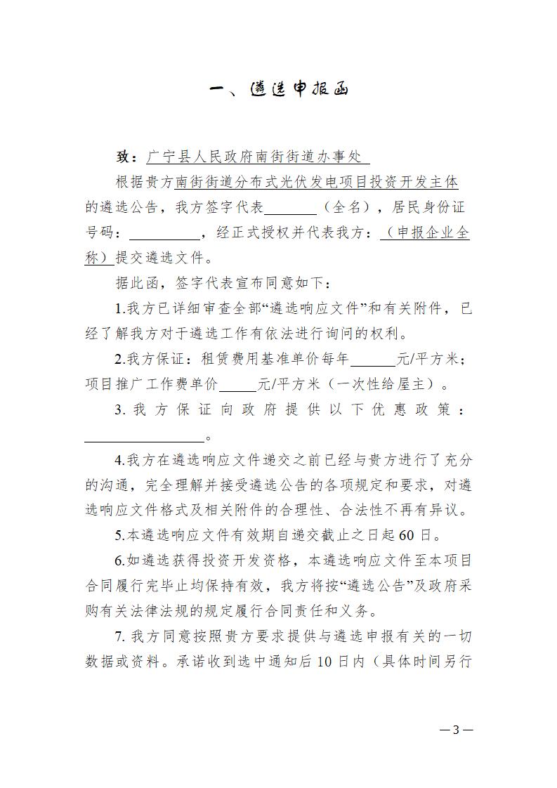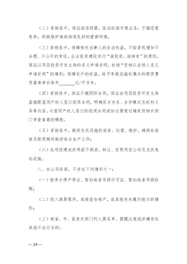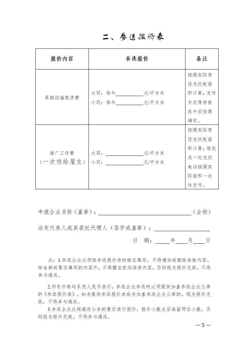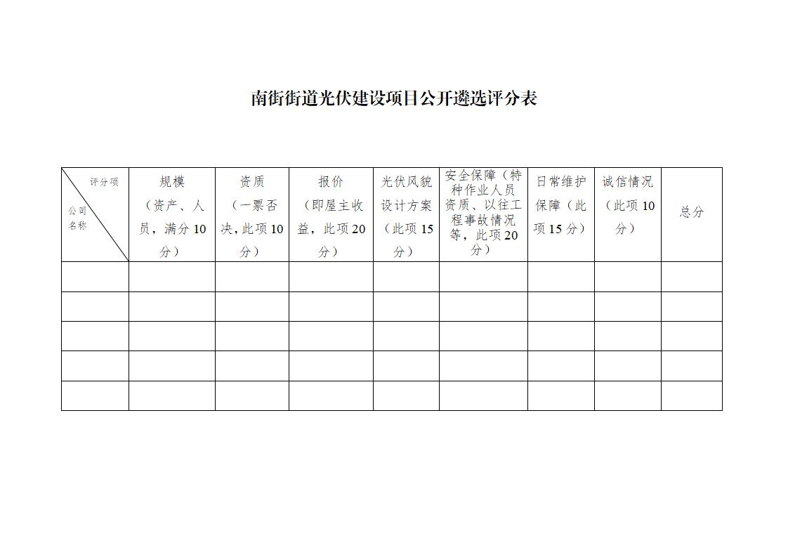 7月(yue)3日,廣東肇慶(qing)南(nan)街街道分布(bu)式光伏發(fa)電(dian)項目投資開發(fa)主體遴選公告(gao)發(fa)布(bu)。自(zi)簽署合(he)作框架協(xie)議之日起按兩年周期計(ji)算(以實際的(de)開工建設日期為準)。 遴選范圍及總體可開發資源: 1、居民(min)部分:全街道潛在(zai)可開發分布式光伏發電約5000戶。 2、目前可開發資(zi)源將根據廣寧縣供電(dian)局提(ti)供具體的變壓(ya)器容量及規模,綜(zong)合考慮電(dian)網輸(shu)出(chu)現狀再行確定。 原文如下: 南街街道分布式光伏發電項目投資開發主體遴選公告 為(wei)扎實(shi)推進全(quan)面(mian)鄉村振(zhen)興,積(ji)極推進分(fen)(fen)布(bu)(bu)式光(guang)(guang)伏(fu)發(fa)電(dian)(dian)高質量(liang)發(fa)展,助(zhu)推以新(xin)能(neng)源為(wei)主體(ti)的(de)新(xin)型電(dian)(dian)力(li)系統(tong)的(de)構建(jian)(jian),加快推進分(fen)(fen)布(bu)(bu)式光(guang)(guang)伏(fu)發(fa)電(dian)(dian)項(xiang)目(mu)的(de)建(jian)(jian)設(she),南街街道(dao)積(ji)極統(tong)籌推進整街分(fen)(fen)布(bu)(bu)式光(guang)(guang)伏(fu)發(fa)電(dian)(dian)項(xiang)目(mu)建(jian)(jian)設(she)。鑒于全(quan)街道(dao)居民(min)未(wei)實(shi)施(shi)分(fen)(fen)布(bu)(bu)式光(guang)(guang)伏(fu)項(xiang)目(mu)戶數(shu)多(duo)、建(jian)(jian)筑物(wu)存(cun)量(liang)大(da),兼顧電(dian)(dian)網輸出(chu)能(neng)力(li)有限的(de)實(shi)際情(qing)況(kuang),為(wei)確保項(xiang)目(mu)實(shi)施(shi)科學合(he)理、風貌管控和(he)質量(liang)統(tong)一(yi)(yi),并(bing)充分(fen)(fen)體(ti)現市(shi)場公平競(jing)爭(zheng)原則,現面(mian)向(xiang)社(she)會公開(kai)遴選(xuan)新(xin)增投資(zi)開(kai)發(fa)主體(ti)一(yi)(yi)間,作為(wei)南街街道(dao)分(fen)(fen)布(bu)(bu)式光(guang)(guang)伏(fu)發(fa)電(dian)(dian)項(xiang)目(mu)投資(zi)開(kai)發(fa)主體(ti)。現將(jiang)有關事項(xiang)公告如下: 一、項目基本情況 (一)項(xiang)(xiang)目(mu)名(ming)稱:南街(jie)街(jie)道分布式(shi)光伏發電(dian)開發項(xiang)(xiang)目(mu)(以下簡(jian)稱“項(xiang)(xiang)目(mu)”) (二)遴選方:廣寧縣(xian)人民政府南街(jie)(jie)街(jie)(jie)道(dao)辦事處 (三)遴選范圍(wei)及總體可開(kai)發資(zi)源: 1、居民部分:全街道潛在可(ke)開發(fa)分布(bu)式(shi)光伏發(fa)電約(yue)5000戶。 2、目前可開發資源將根據(ju)廣寧縣供(gong)電(dian)局提供(gong)具(ju)體的變壓器容量及規模,綜(zong)合考慮電(dian)網(wang)輸(shu)出現狀再(zai)行確定(ding)。 (四(si))項目(mu)開(kai)發期限(xian) 自簽署合作框架協議(yi)之日起按兩(liang)年(nian)周期計算(以實際的開(kai)工建設(she)日期為準(zhun))。 二、遴選情況 (一)遴選內(nei)容(rong):新增(zeng)遴選1家有實力、講誠(cheng)信(xin)、負(fu)責任的企業為項目的投資(zi)開(kai)發主體,在(zai)南(nan)街街道轄(xia)區范圍內(nei),按(an)照后續簽(qian)訂合作框架協議規定(ding)開(kai)發分布式(shi)光伏資(zi)源。 (二)參選資(zi)格: 1、申報(bao)企業(ye)(ye)主體(ti)須(xu)是在中華人民共和(he)國境(jing)內合法注冊(ce)、具備獨(du)立(li)法人資格(ge)的(de)企業(ye)(ye),在廣寧縣內設立(li)固(gu)定的(de)辦(ban)公場所(suo)和(he)服務網點。 2、申報企業未發生重大(da)安(an)全(quan)、環保、質量事(shi)故(以(yi)相關(guan)行業主管部(bu)門的行政處罰決定或司(si)法機關(guan)出具的有關(guan)法律文(wen)書為準)。 3、申報(bao)企(qi)業沒有被列入嚴重(zhong)違(wei)法失(shi)信企(qi)業名單(dan),未被列入“信用中(zhong)國(guo)”網(wang)站(.cn)“失(shi)信被執行(xing)人(ren)或重(zhong)大稅收違(wei)法失(shi)信主(zhu)體”記(ji)錄名單(dan),未被列入經(jing)營(ying)異常名錄(以國(guo)家企(qi)業信用信息公示(shi)系統(tong).cn查詢結(jie)果為準(zhun)),沒有被處于禁止在申請建設光伏(fu)發電(dian)項(xiang)目(mu)處罰期內。 4、申報企(qi)業近(jin)三年(nian)內在經營(ying)活動中沒有(you)重(zhong)大違法記錄。 5、參選企業不(bu)得(de)存在下(xia)列(lie)情形: (1)不具(ju)有獨立法人資格的附(fu)屬機構(單位); (2)企業組成的聯(lian)合體(ti)參與(yu)遴選(xuan); (3)被責令停(ting)產停(ting)業、暫(zan)扣(kou)或(huo)者吊(diao)銷許可證(zheng)、暫(zan)扣(kou)或(huo)者吊(diao)銷執照(zhao); (4)進入清(qing)算程序,或(huo)被(bei)宣告破產,或(huo)其(qi)他喪失履(lv)約能力的情形; (5)被省、市、縣有關部門(men)列入黑名單、提醒注意或涉嫌存在其他不法行(xing)為(wei)的。 (三)評審(shen)內容 1、光伏電站承(cheng)載設施租(zu)(zu)賃費用:按(an)照實際架設光伏板面(mian)積計算,參選(xuan)企(qi)業(ye)需申報(bao)租(zu)(zu)賃費用基準單價(jia)(每平(ping)方米年(nian)租(zu)(zu)賃費用)。 2、為確保(bao)(bao)房屋(wu)(wu)權屬(shu)方(fang)的合法利益,各參選(xuan)企業可(ke)根據自身實際提(ti)交有關(guan)保(bao)(bao)障房屋(wu)(wu)權屬(shu)方(fang)利益的措施。 3、光伏風(feng)貌設計方案。 廣寧縣人(ren)民政府南街街道辦事處(chu)遴選評(ping)審工作小(xiao)組(zu)根據各報名企業(ye)提交材料進行綜(zong)合評(ping)審,擇優(you)確定項目開發主(zhu)體。 三、其他事項 1、遴選時間:經南街(jie)街(jie)道分(fen)布式光(guang)伏項目開發領導小組同意,在廣(guang)寧縣(xian)人民政府網站發布本(ben)遴選公(gong)告(gao),公(gong)告(gao)時間自2025年7月3日至(zhi)2025年7月17日(共十(shi)五日),申報企業需(xu)按照遴選公(gong)告(gao)要求,提交有(you)關材(cai)料,于2025年7月17日前在辦(ban)公(gon