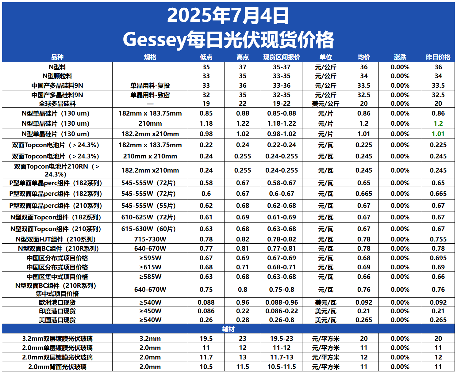 Gessey:7月4日每日光伏市場行情2025-07-04 17:33來源:gessey瀏覽數:270次