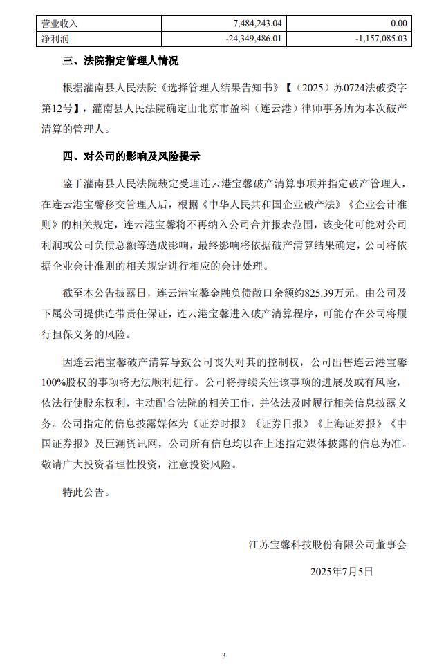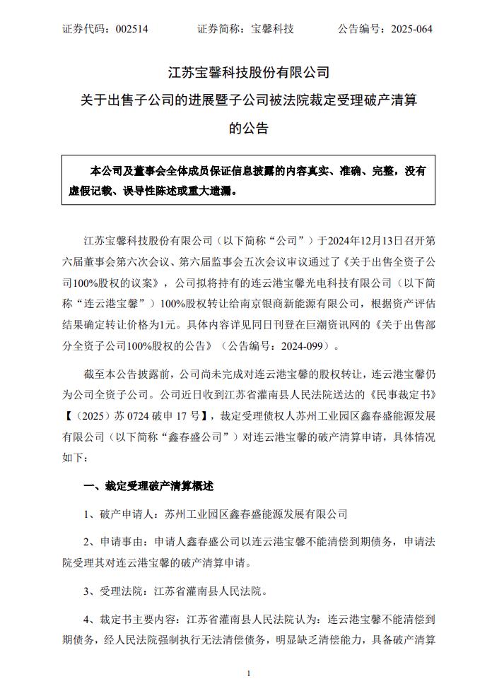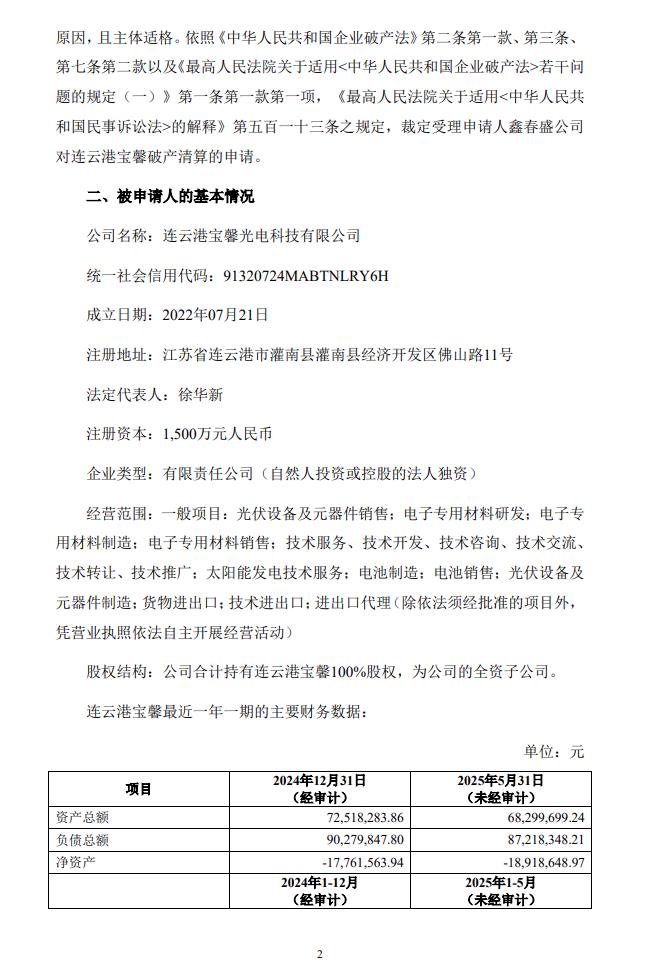 7月4日,寶馨科技發布公告稱,公司全資子公司連云港寶馨光電科技有限公司近日被法院裁定受理破產清算。該裁定是由于連云港寶馨無法清償到期債務,債權人蘇州工業園區鑫春盛能源發展有限公司向法院申請破產清算。 公告顯示,截至2025年5月31日,連云港寶馨的資產總額為6830萬元,負債總額為8722萬元,凈資產為-1892萬元,2025年1-5月凈利潤為-116萬元。 據悉,連云港寶馨光電科技有限公司是寶馨科技專門從事光伏組件生產及銷售的控股子公司,已投產下線,設計產能為500MW。公司成立于2022年7月21日,位于江蘇省連云港市灌南縣經濟開發區佛山路11號,注冊資本1500萬元人民幣,法定代表人為徐華新,經營范圍包括光伏設備及元器件銷售、電子專用材料研發、制造與銷售、技術服務、太陽能發電技術服務、電池制造與銷售、光伏設備及元器件制造、貨物進出口、技術進出口、進出口代理等。 寶馨科技表示,此次破產清算的裁定將對公司產生影響,連云港寶馨將不再納入公司的合并報表范圍,可能影響公司的利潤和負債總額。此外,連云港寶馨的金融負債敞口余額約為825萬元,公司及其下屬公司對該債務提供了連帶責任保證,破產清算可能使公司面臨履行擔保義務的風險。同時,由于連云港寶馨破產清算,公司出售其100%股權的事項也將受到影響,未能順利進行。 上一篇: 大唐、國電投、華潤成立新能源項目公司