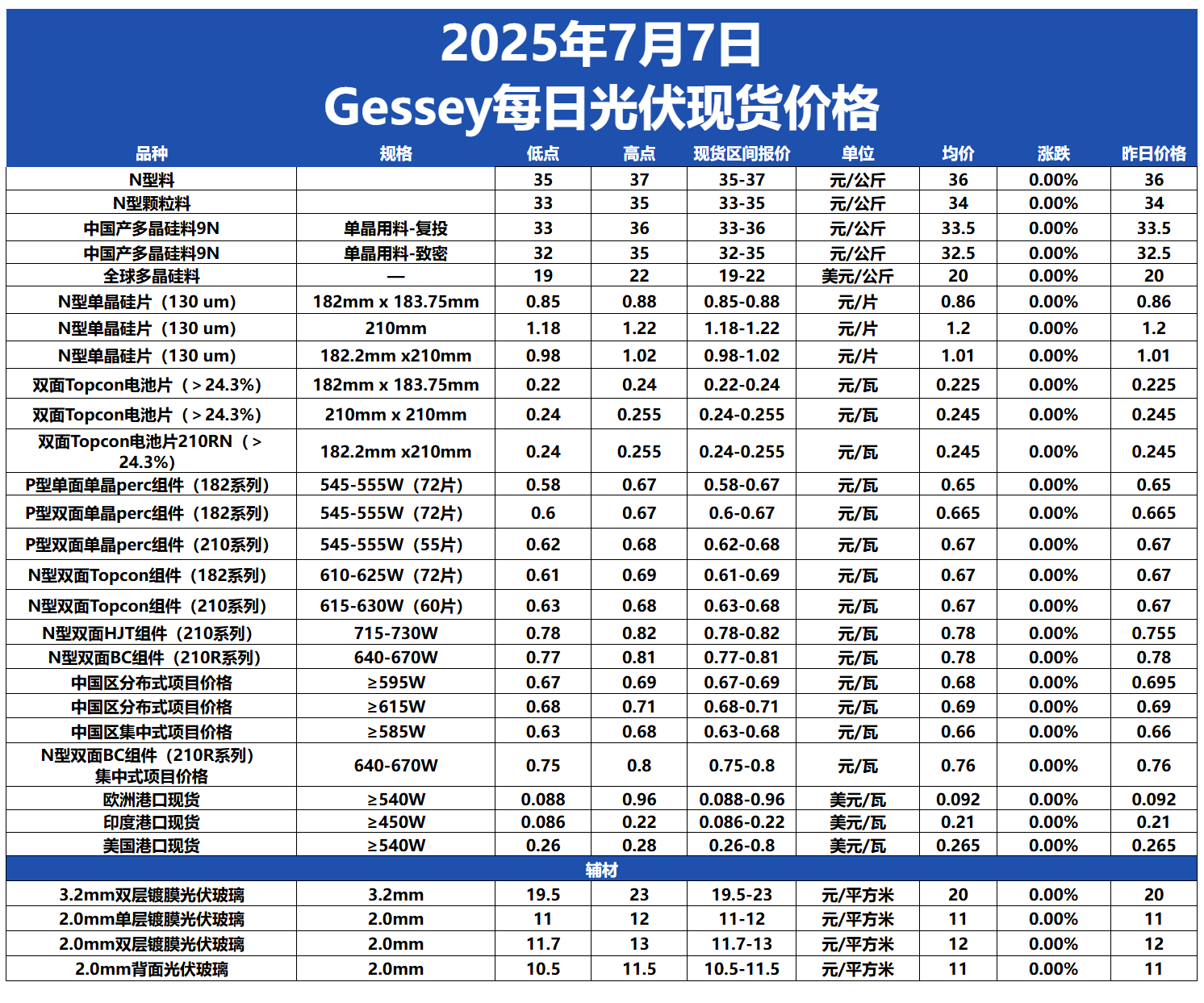Gessey:7月7日每日光伏市場行情2025-07-07 18:46來(lai)源:gessey瀏覽數:271次