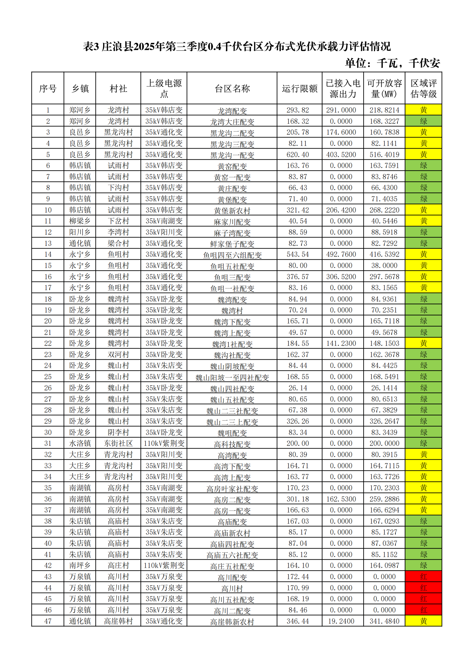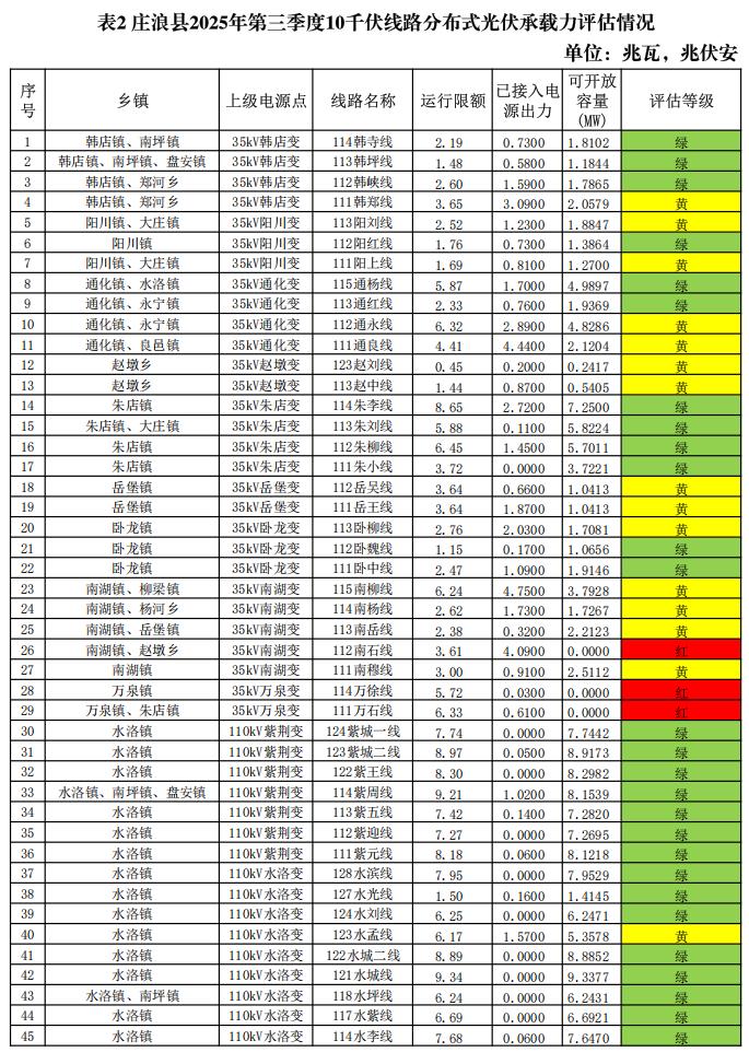 7月10日(ri),甘肅省平涼市(shi)莊(zhuang)浪縣(xian)人民政府公布(bu)了該縣(xian)2025年第三(san)季度分布(bu)式光伏(fu)接入電(dian)網可開放容量相關數據(ju)。 截止時(shi)間2025年6月31日,莊(zhuang)浪縣的萬(wan)泉變萬(wan)泉變2#、萬(wan)泉變萬(wan)泉變1#兩處變電站(zhan)分布式光伏接網(wang)評估(gu)等級(ji)為紅(hong)色,已無可(ke)開放容量(liang),覆蓋萬(wan)泉鎮(zhen)(zhen)、朱店(dian)鎮(zhen)(zhen)、秦安鎮(zhen)(zhen)五營鄉、張(zhang)家川回族自治(zhi)縣梁(liang)山鎮(zhen)(zhen)4個地區。