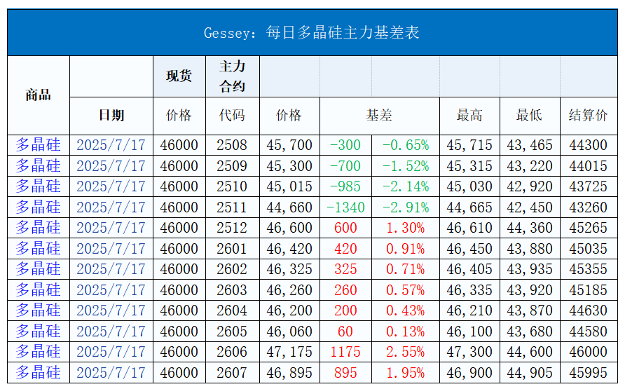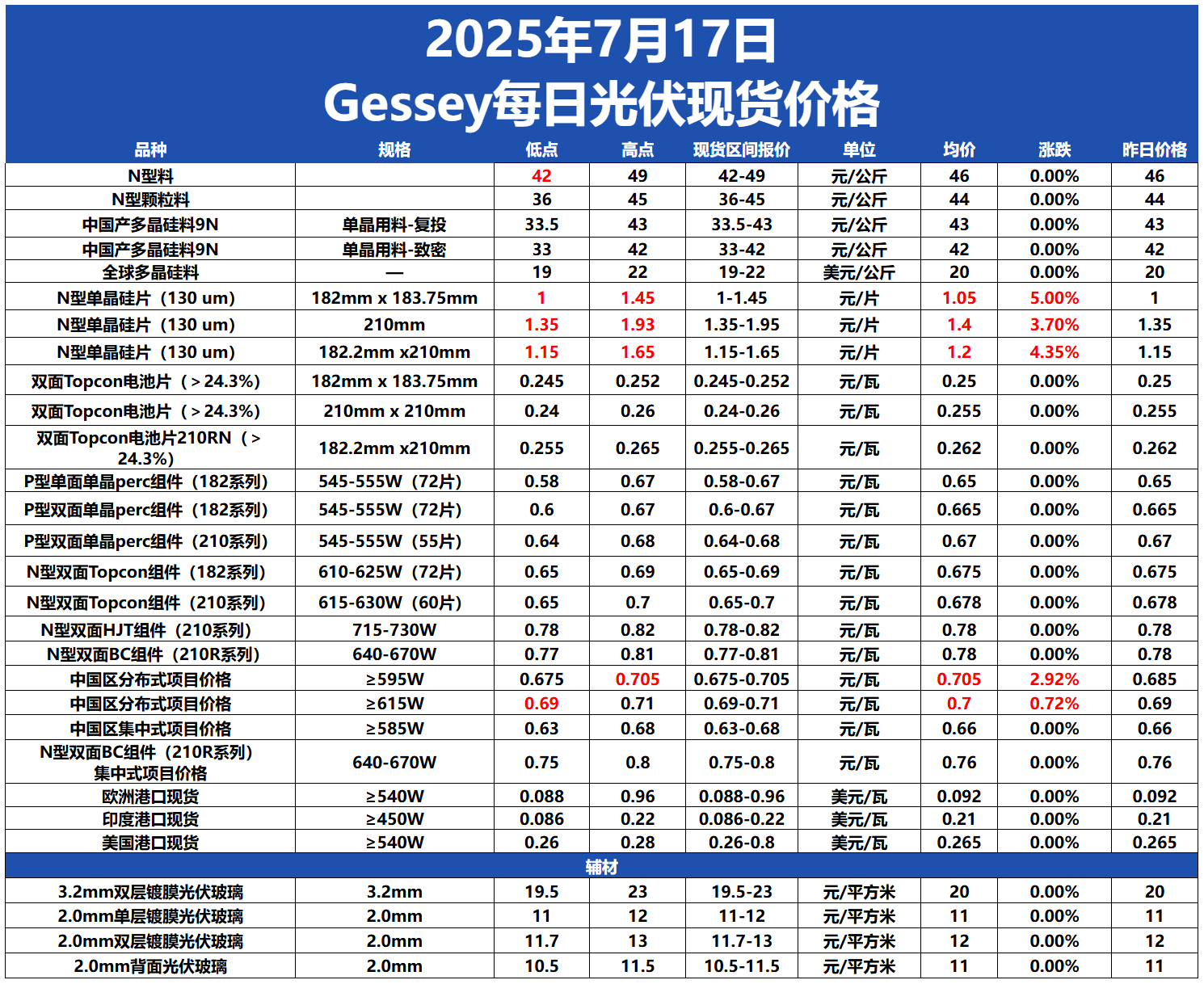 現貨市場價格變動: 多晶硅: 今日硅料價格整體維穩,N型料主流價格在42-49元/公斤,均價46元/公斤。N型顆粒硅主流價格在36-45元/公斤,均價44元/公斤。國產復投特級硅料主流價格在33.5-43元/公斤,均價43元/公斤,國產致密特級硅料主流價格在33-42元/公斤,均價42元/公斤。全球多晶硅料主流價格在19-22元/公斤,均價20元/公斤。 硅片: 今日硅片價格小幅上漲,N型-183.75mm單晶硅片主流現貨價格維持1-1.45元/片,均價1.05元/片,上漲5%。N型-210mm單晶硅片主流現貨價格維持1.35-1.93元/片,均價1.4元/片,上漲3.7%。N型-210Rmm單晶硅片主流現貨價格1.15-1.65元/片,均價1.2元/片,上漲4.35%。 電池片: 今日電池片價格整體維穩,24.3%以上183.75mm雙面Topcon電池片主流價格在0.245-0.252元/瓦,均價0.25元/瓦。24.3%以上210mm雙面Topcon電池片主流價格在0.24-0.26元/瓦,均價0.255元/瓦。24.3%以上210Rmm雙面Topcon電池片主流價格在0.255-0.265元/瓦,均價0.262元/瓦。 組件: 今日組件價格小幅上漲,雙面單晶perc組件(182系列)價格在0.6-0.67元/ 瓦,均價為0.665元/瓦。雙面單晶perc組件(210系列)價格在0.64-0.68元/ 瓦,均價為0.67元/瓦。N型雙面Topcon 組件(182系列)價格在0.65-0.69元/ 瓦,均價為0.675元/瓦。N型雙面Topcon 組件(210系列)價格在0.65-0.7元/ 瓦,均價為0.678元/瓦。N型雙面HJT組件(210系列)價格在0.78-0.82元/ 瓦,均價為0.78元/瓦。N型雙面BC組件(210R系列)價格在0.77-0.81元/ 瓦,均價為0.78元/瓦。中國區分布式項目(≥595W)價格在0.675-0.705元/瓦,均價為0.705元/瓦,上漲2.92%,中國區分布式項目(≥6155W)價格在0.69-0.71元/瓦,均價為0.7元/瓦,上漲0.72%,中國區集中式項目(≥585W)價格在0.63-0.68元/ 瓦,均價為0.66元/瓦。N型雙面BC組件(210R系列)集中式項目價格在0.75-0.8元/ 瓦,均價為0.76元/瓦。歐洲港口現貨價格在0.088-0.96美元/ 瓦,均價為0.092美元/瓦。印度港口現貨價格在0.086-0.22美元/ 瓦,均價為0.21美元/瓦。美國港口現貨價格在0.26-0.28美元/ 瓦,均價為0.265美元/瓦。 玻璃: 今日玻璃價格整體維穩,3.2mm雙層鍍膜光伏玻璃價格在19.5-23元/平方米,均價為20元/平方米。2.0mm單層鍍膜光伏玻璃價格在11-12元/平方米,均價為11元/平方米。2.0mm雙層鍍膜光伏玻璃價格在11.7-13元/平方米,均價為12元/平方米。2.0mm背面光伏玻璃價格在10.5-11.5元/平方米,均價為11元/平方米。 聚焦每日行情波動: 近期,在行業政策倡導反內卷以及重點企業開展價格交流的背景下,硅片價格持續上行。昨日,硅片報價進一步上漲,截至今日,今日午間已有訂單以當前均價成交的推進。今日硅片價格小幅上漲,N型-183.75mm單晶硅片主流現貨價格維持1-1.45元/片,均價1.05元/片,上漲5%。N型-210mm單晶硅片主流現貨價格維持1.35-1.93元/片,均價1.4元/片,上漲3.7%。N型-210Rmm單晶硅片主流現貨價格1.15-1.65元/片,均價1.2元/片,上漲4.35%。 今日組件價格小幅上漲,中國區分布式項目(≥595W)價格在0.675-0.705元/瓦,均價為0.705元/瓦,上漲2.92%,中國區分布式項目(≥6155W)價格在0.69-0.71元/瓦,均價為0.7元/瓦,上漲0.72%。截至目前,主流電池片企業尚未報價,但多家組件企業反饋,當前最新的分布式報價基本不低于0.7元/瓦。不過,由于上游近期出現新的價格調整,組件企業在簽單時頗為謹慎。多家企業表示,鑒于最新電池片報價尚未公布,暫且不簽訂新項目訂單,待最新價格更新后再進行洽談簽單。預計明日及下周初,最新組件價格仍有調漲的預期,而受上游材料最新價格影響,電池片明日或許會繼續跟進報漲。 期貨市場 行情走勢:主力合約收盤價為45700元/ 噸,前結算價為42515元/噸,收盤價較前結算價漲幅為7.49% ,收盤價較開盤價漲1800元/噸,漲幅為4.10%,成交量為410795手,持倉量為70964手。 下一篇: 蓋錫咨詢:7月17日光伏行業要聞速覽