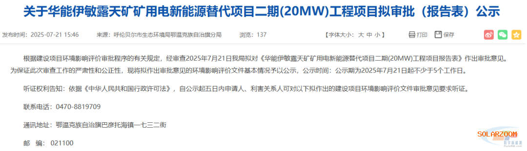 7月21日,內蒙古呼倫貝爾鄂溫克族(zu)自(zi)治旗人民政府發布了關(guan)于華能伊敏露天礦礦用電新能源替(ti)代(dai)項(xiang)目(mu)二期(qi)(20MW)工程(cheng)項(xiang)目(mu)擬審批(pi)(報告表)的公示。 公(gong)示(shi)內容(rong)顯(xian)示(shi),該(gai)項(xiang)目(mu)位(wei)于內蒙古自治區(qu)呼倫貝爾(er)市(shi)鄂溫克族自治旗(qi)伊敏(min)河境內,建設(she)單(dan)位(wei)為(wei)華能(neng)集團旗(qi)下(xia)公(gong)司華能(neng)伊敏(min)煤電有限責任(ren)公(gong)司。 該項(xiang)目總(zong)投資4553.15萬元,光伏場區總(zong)占地(di)面積(ji)為(wei)53.6608hm2,額(e)定容量(liang)為(wei)20MW,直流側總(zong)容量(liang)為(wei)20.00349MWp,項(xiang)目擬安裝615Wp(共(gong)32,526塊)單晶硅雙面光伏組件。 據悉,此前7月15日,該項(xiang)目環(huan)評已獲得內蒙古(gu)呼(hu)倫貝爾市(shi)生態環(huan)境局鄂(e)溫克族(zu)自治旗分局的受理。