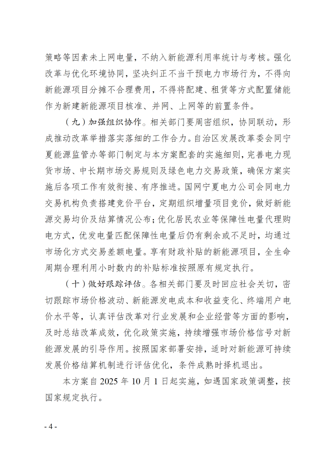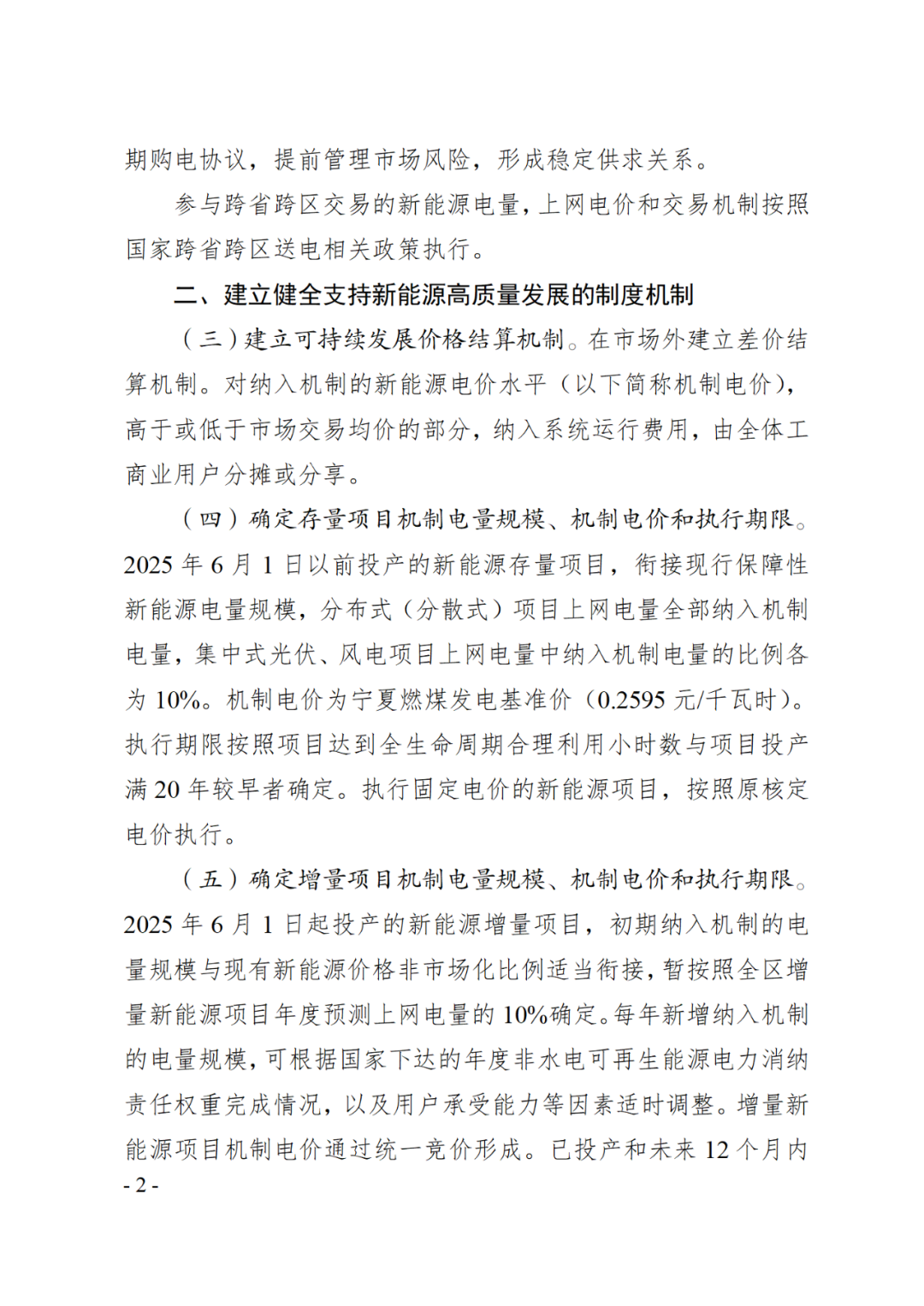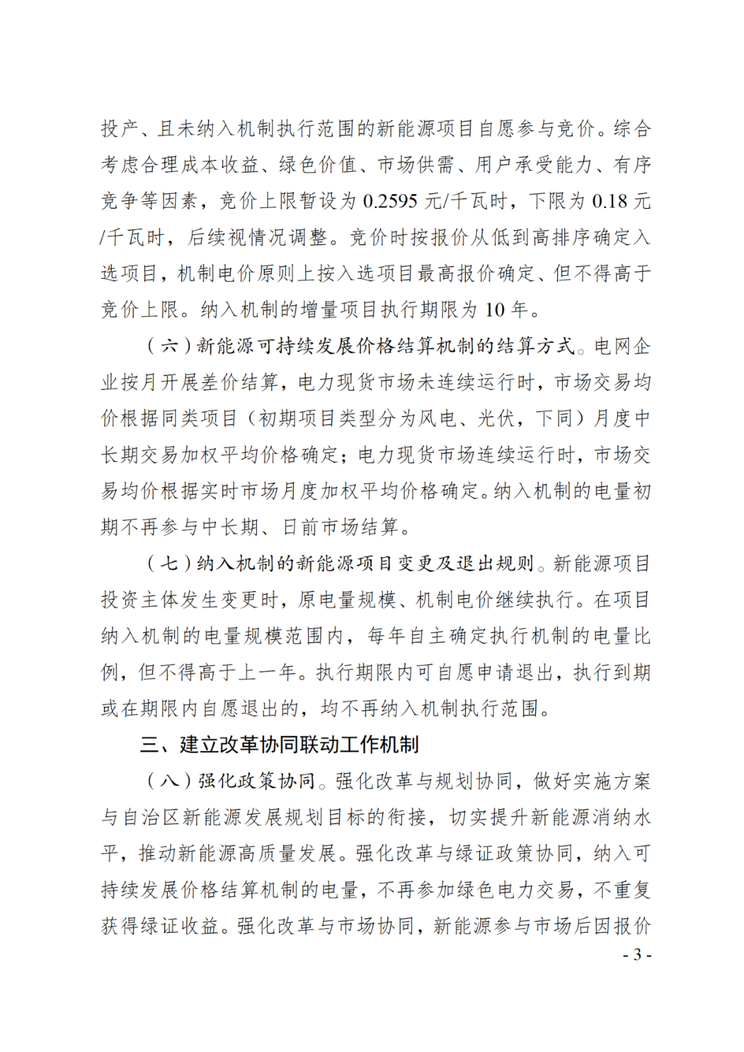 7月28日,寧夏回族自治區發展改革委發布關于《自治區深化(hua)新能源(yuan)上網電價市場化(hua)改革實施方案(an)(征求意(yi)見稿)》公(gong)開征求意(yi)見的公(gong)告(gao)(進行中)。 2025年6月1日以前投(tou)產的新(xin)能(neng)源(yuan)存量項(xiang)(xiang)(xiang)目(mu)(mu)(mu),銜接現行保障性新(xin)能(neng)源(yuan)電量規模,分(fen)布(bu)式(shi)(分(fen)散式(shi))項(xiang)(xiang)(xiang)目(mu)(mu)(mu)上網電量全(quan)部納入機制電量,集(ji)中式(shi)光伏(fu)、風電項(xiang)(xiang)(xiang)目(mu)(mu)(mu)上網電量中納入機制電量的比例各(ge)為(wei)10%。機制電價(jia)為(wei)寧(ning)夏(xia)燃煤(mei)發(fa)電基(ji)準價(jia)(0.2595元(yuan)/千瓦時(shi))。執(zhi)行期(qi)限(xian)按照(zhao)項(xiang)(xiang)(xiang)目(mu)(mu)(mu)達(da)到全(quan)生命周期(qi)合(he)理利用小時(shi)數與項(xiang)(xiang)(xiang)目(mu)(mu)(mu)投(tou)產滿(man)20年較(jiao)早者確定。執(zhi)行固(gu)定電價(jia)的新(xin)能(neng)源(yuan)項(xiang)(xiang)(xiang)目(mu)(mu)(mu),按照(zhao)原核定電價(jia)執(zhi)行。 2025年6月1日(ri)起投(tou)(tou)產(chan)的(de)(de)新(xin)能(neng)(neng)源(yuan)(yuan)增量(liang)項目(mu),初期(qi)納(na)入機(ji)(ji)制(zhi)的(de)(de)電量(liang)規模(mo)(mo)與現(xian)有新(xin)能(neng)(neng)源(yuan)(yuan)價(jia)格(ge)非(fei)市場化比例適當(dang)銜接,暫按(an)照(zhao)全區增量(liang)新(xin)能(neng)(neng)源(yuan)(yuan)項目(mu)年度預測上網(wang)電量(liang)的(de)(de)10%確定(ding)。每年新(xin)增納(na)入機(ji)(ji)制(zhi)的(de)(de)電量(liang)規模(mo)(mo),可根(gen)據國家(jia)下達的(de)(de)年度非(fei)水電可再生(sheng)能(neng)(neng)源(yuan)(yuan)電力(li)消納(na)責任權重完成情況,以及(ji)用戶承受(shou)能(neng)(neng)力(li)等(deng)因素(su)適時調整。增量(liang)新(xin)能(neng)(neng)源(yuan)(yuan)項目(mu)機(ji)(ji)制(zhi)電價(jia)通過統(tong)一競(jing)價(jia)形(xing)成。已投(tou)(tou)產(chan)和(he)未(wei)(wei)來12個月內投(tou)(tou)產(chan)、且未(wei)(wei)納(na)入機(ji)(ji)制(zhi)執行范圍的(de)(de)新(xin)能(neng)(neng)源(yuan)(yuan)項目(mu)自愿(yuan)參與競(jing)價(jia)。 綜合(he)(he)考慮合(he)(he)理成本收益、綠色價(jia)值、市場供需、用戶承受(shou)能(neng)力、有序競爭(zheng)等因素,競價(jia)上限(xian)(xian)暫設(she)為0.2595元/千(qian)瓦時,下限(xian)(xian)為0.18元/千(qian)瓦時,后續視(shi)情況調整。競價(jia)時按報價(jia)從低到高排序確定入(ru)選(xuan)項(xiang)目,機(ji)制電價(jia)原則上按入(ru)選(xuan)項(xiang)目最高報價(jia)確定、但不得高于競價(jia)上限(xian)(xian)。納入(ru)機(ji)制的增量項(xiang)目執行期限(xian)(xian)為10年(nian)。 文件指(zhi)出(chu),強(qiang)化(hua)改(gai)革與(yu)綠證(zheng)(zheng)政策協同,納(na)入可持(chi)續發展價(jia)格結(jie)算機制的電量,不(bu)再參(can)加綠色電力交(jiao)易,不(bu)重復獲得綠證(zheng)(zheng)收益。強(qiang)化(hua)改(gai)革與(yu)市(shi)場協同,新能(neng)源參(can)與(yu)市(shi)場后因(yin)(yin)報(bao)價(jia)策略等因(yin)(yin)素(su)未上網電量,不(bu)納(na)入新能(neng)源利用(yong)率統(tong)計與(yu)考核。 強(qiang)化(hua)改革與優化(hua)環境協同,堅決糾(jiu)正不當干預電力(li)市場(chang)行為(wei),不得向新能(neng)源項(xiang)(xiang)目(mu)分攤不合理(li)費用(yong),不得將(jiang)配(pei)建(jian)、租賃等方式配(pei)置儲(chu)能(neng)作為(wei)新建(jian)新能(neng)源項(xiang)(xiang)目(mu)核準、并網、上網等的(de)前置條件。 方案(an)自(zi)2025年10月1日起實施,如遇國家(jia)政(zheng)策調整,按(an)國家(jia)規定執行。 原文見(jian)下: 自治區發展改革委關于《自治區深化新能源上網電價市場化改革實施方案(征求意見稿)》 公開征求意見的公告(進行中) 為(wei)持(chi)續深化(hua)電力市(shi)場化(hua)改(gai)(gai)革(ge)(ge)(ge),充分發(fa)(fa)揮市(shi)場在資源配置中(zhong)的決定(ding)性作用,支持(chi)新能源產業(ye)高(gao)質量發(fa)(fa)展,按照國(guo)家發(fa)(fa)展改(gai)(gai)革(ge)(ge)(ge)委、國(guo)家能源局《關于深化(hua)新能源上網(wang)電價(jia)市(shi)場化(hua)改(gai)(gai)革(ge)(ge)(ge) 促進新能源高(gao)質量發(fa)(fa)展的通知》(發(fa)(fa)改(gai)(gai)價(jia)格〔2025〕136號)要求(qiu),結合自治(zhi)區實際情(qing)況(kuang),我(wo)委起草(cao)了《自治(zhi)區深化(hua)新能源上網(wang)電價(jia)市(shi)場化(hua)改(gai)(gai)革(ge)(ge)(ge)實施方案(征求(qiu)意(yi)見(jian)稿)》,現公開(kai)征求(qiu)意(yi)見(jian)。 此(ci)次公開征(zheng)求意見(jian)時間為2025年7月28日至2025年8月6日,歡(huan)迎有(you)關單(dan)位和(he)社會各界人士提出意見(jian)建議。 聯系(xi)電話:0951-6038207,電子郵箱(xiang):nxwjjgc@126.com。 附件:自(zi)治區深(shen)化新能源(yuan)上網電價市場化改革實施方案(征求(qiu)意見(jian)稿) 寧夏回族自治(zhi)區發展改革委 2025年7月(yue)28日(ri) (此(ci)件公(gong)開發布) 附(fu)件: 自治(zhi)區深化(hua)新能(neng)源上網電(dian)價市場化(hua)改革實施方案(征求(qiu)意見稿).wps 上一篇: 廣州發展披露6.5GW新能源項目進展情況