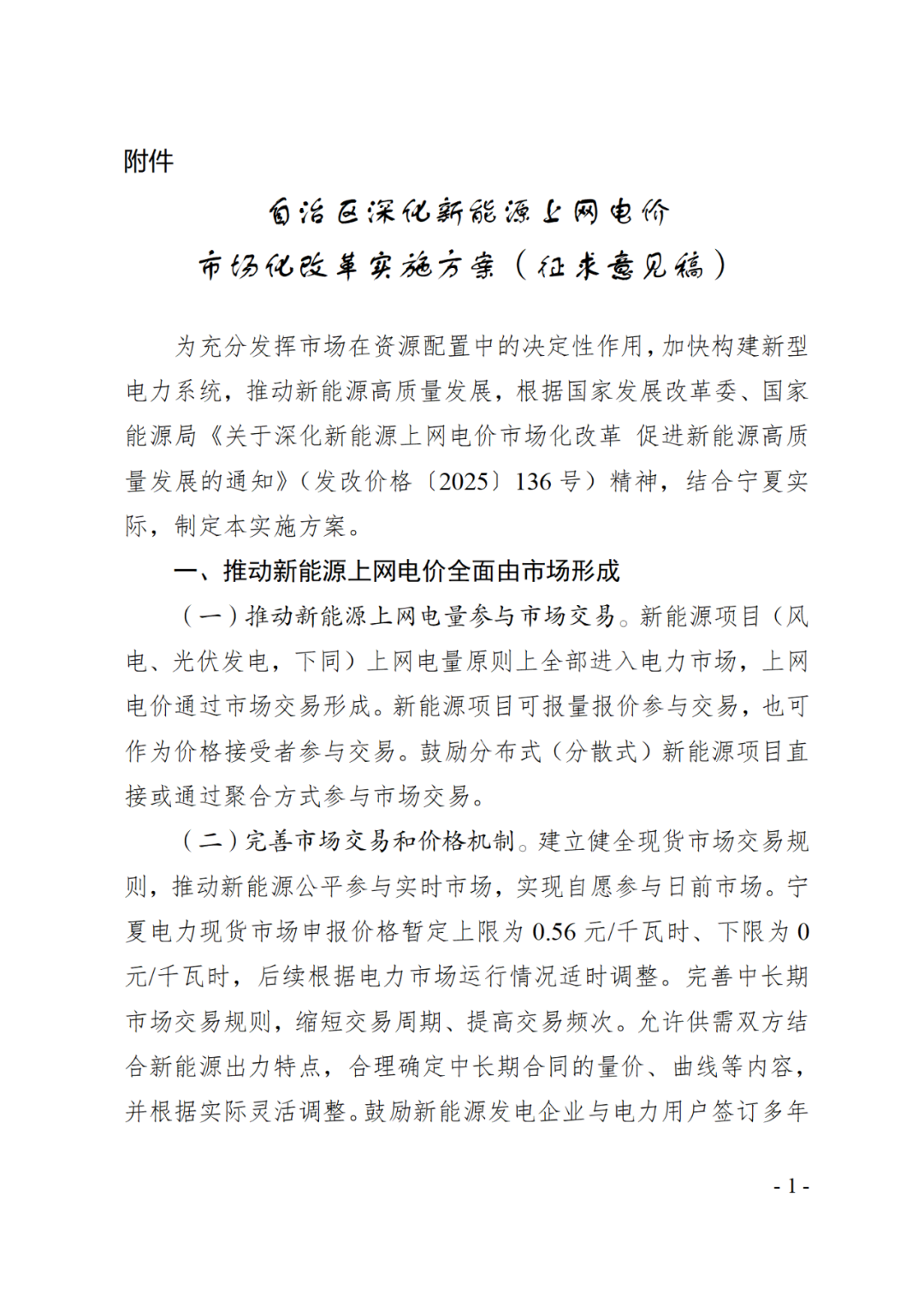 寧夏回族自治區發展改革委發布關于《自治區深化新能源上網電價市場化改革實施方案(征求意見稿)》公開征求意見的公告2025-07-29 11:19來源(yuan):gessey瀏覽數:241次