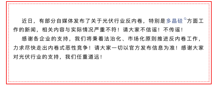 7月29日,中國光伏行業協會發布澄清公告,就近日部分自媒體發布關于光伏行業反內卷,特別是多晶硅方面工作的新聞,相關內容與實際情況嚴重不符!請大家不信謠!不傳謠!