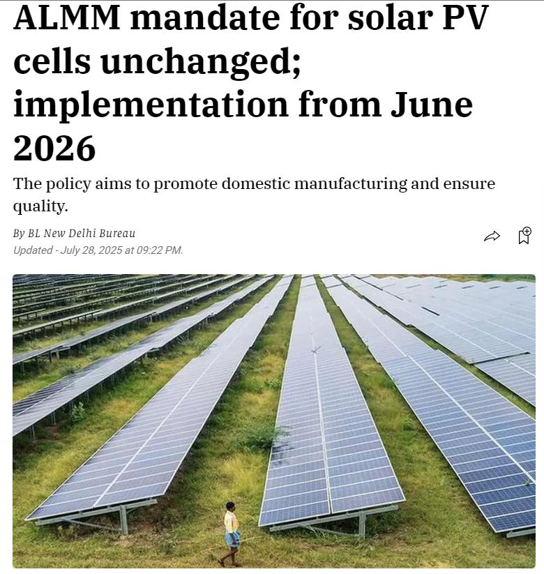 近日,印度新能源和可再生能源部(MNRE)發布消息,宣布太陽能光伏電池型號和制造商批準名單(ALMM)的授權保持不變,并將于2026年6月1日正式生效。 ALMM機制作為保障生產商可靠性、維護消費者權益以及確保國家能源安全的關鍵機制,在印度太陽能產業發展中扮演著重要角色。近年來,該機制有力推動了印度國內太陽能制造業的迅猛發展。目前,印度太陽能光伏組件產能已達91GW,太陽能光伏電池產能為27GW,展現出強勁的增長勢頭。 為進一步規范政府招標項目,印度新能源和可再生能源部于2025年7月28日發布了對太陽能光伏電池ALMM命令(2024年12月9日發布)的修正案。此次修正案旨在依據《2003年電力法》第63條,進一步澄清和簡化政府機構招標項目的程序。按照修訂后的程序,太陽能光伏電池的ALMM將在當前正在進行的太陽能光伏電池ALMM清單發布一個月后強制實施。不過,對于2026年6月1日以后委托的項目,ALMM清單下強制使用太陽能光伏電池的生效日期將維持此前通知的日期不變。 這一舉措為項目投標人帶來了極大的便利和清晰度。在投標過程中,投標人需按照規定提交相關文件,而ALMM機制相關規定的明確,使投標人能夠更準確地規劃投標方案,充分考慮使用ALMM清單中的太陽能模塊和電池的授權要求。 業內專家表示,印度新能源和可再生能源部的這一決策意義重大。它不僅將有力促進國內太陽能制造項目的推進,還能充分解決可再生能源開發商在遵守太陽能光伏電池ALMM方面面臨的難題。隨著新規的實施,印度太陽能電池制造有望進一步加快步伐,更好地跟上國內不斷增長的模塊制造能力,為印度實現清潔能源轉型和能源可持續發展目標提供有力支撐。未來,印度太陽能產業有望在全球市場中占據更有利的地位,為全球可再生能源發展貢獻更多力量。