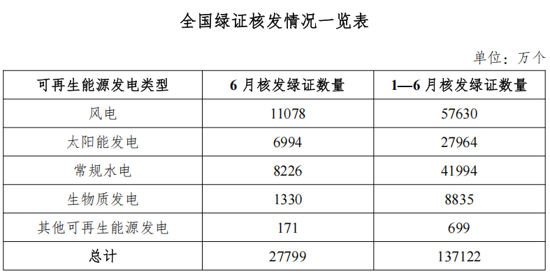 7月31日,國(guo)(guo)家能源局發布(bu)2025年6月全國(guo)(guo)可再生能源綠(lv)色電力(li)證書核發及交易數據。 一、綠證核發情況 2025年(nian)6月(yue),國家能源局(ju)核(he)(he)發(fa)綠(lv)(lv)證(zheng)2.78億(yi)個(ge),環比增長29.33%,涉及可再生能源發(fa)電(dian)項目(mu)19.87萬個(ge),其(qi)中(zhong)(zhong)可交(jiao)易(yi)綠(lv)(lv)證(zheng)1.96億(yi)個(ge),占比70.64%。本期核(he)(he)發(fa)2025年(nian)5月(yue)可再生能源電(dian)量對應(ying)綠(lv)(lv)證(zheng)2.02億(yi)個(ge),占比72.70%。2025年(nian)1—6月(yue),國家能源局(ju)共計核(he)(he)發(fa)綠(lv)(lv)證(zheng)13.71億(yi)個(ge),其(qi)中(zhong)(zhong)可交(jiao)易(yi)綠(lv)(lv)證(zheng)9.58億(yi)個(ge)。 二、綠證交易情況 2025年(nian)6月(yue),全國交易綠(lv)證6091萬個,其中綠(lv)色(se)電力(li)(li)交易綠(lv)證1033萬個。2025年(nian)1—6月(yue),全國交易綠(lv)證3.48億(yi)個,其中綠(lv)色(se)電力(li)(li)交易綠(lv)證1.07億(yi)個。 2025年6月(yue),全國單(dan)獨交易綠(lv)證5059萬個,交易平(ping)均價格為3.40元/個,環比增長24.77%。
