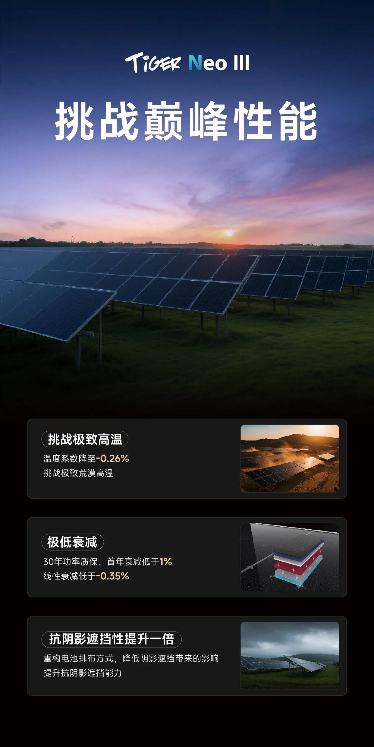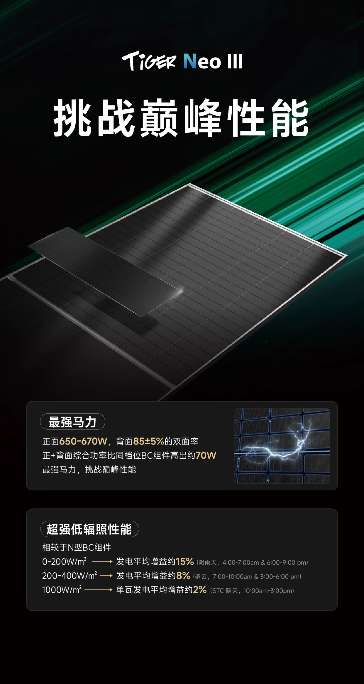 最強馬力 正面(mian)(mian)650-670W,背面(mian)(mian)85±5%的雙面(mian)(mian)率,正+背面(mian)(mian)綜合功率比同檔位BC組件高(gao)出(chu)約70W,最(zui)強(qiang)馬力(li),挑戰巔峰性能。 超強低輻照性能 相較于N型BC組件,0-200W/m2 (陰雨天,4:00-7:00am & 6:00-9:00 pm)發電平均(jun)增(zeng)益約15%, 200-400W/m2 (多云,7:00-10:00am & 3:00-6:00 pm)發電平均(jun)增(zeng)益約8%,1000W/m2 (STC 晴天,10:00am-3:00pm), 單瓦(wa)發電平均(jun)增(zeng)益約2%。 挑(tiao)戰極致高溫 溫(wen)(wen)度系數降至-0.26%, 挑戰極(ji)致荒(huang)漠高溫(wen)(wen) 極低衰(shuai)減 30年功率質保(bao),首年衰減(jian)低(di)于1%, 線性衰減(jian)低(di)于-0.35%。 抗(kang)陰影遮擋性提升一(yi)倍(bei) 重構電池排布方式(shi),降(jiang)低陰(yin)影(ying)遮擋帶來的(de)影(ying)響,提(ti)升抗陰(yin)影(ying)遮擋能力