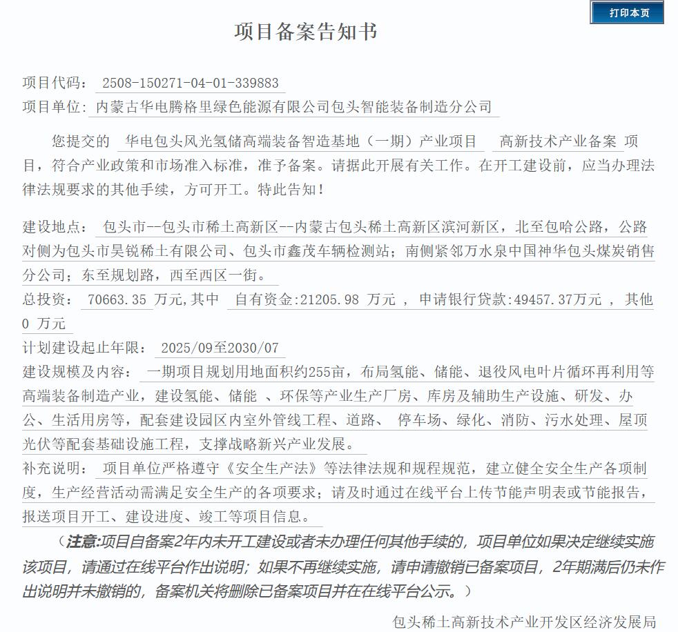 蓋(gai)錫(xi)新能(neng)源網獲悉,近日,內蒙古自治區投資項目在線審(shen)批大廳顯示,華電包(bao)頭風光氫(qing)儲高(gao)端裝(zhuang)備(bei)智造基地(一期)產(chan)業項目備(bei)案成功。 項(xiang)目單(dan)位:內蒙(meng)古華電騰(teng)格里綠色能源有(you)限公(gong)司(si)包頭智能裝備(bei)制(zhi)造分公(gong)司(si)。 建設地(di)點:包頭(tou)市(shi)(shi)--包頭(tou)市(shi)(shi)稀土高新(xin)區(qu)--內蒙古包頭(tou)稀土高新(xin)區(qu)濱(bin)河新(xin)區(qu),北至包哈公路(lu),公路(lu)對側為包頭(tou)市(shi)(shi)昊銳稀土有限公司、包頭(tou)市(shi)(shi)鑫茂車(che)輛檢(jian)測站;南側緊鄰萬(wan)水泉(quan)中國神(shen)華包頭(tou)煤炭銷售分(fen)公司;東至規劃(hua)路(lu),西(xi)至西(xi)區(qu)一街。 總(zong)投資:70663.35萬(wan)(wan)元,其中(zhong) 自有資金:21205.98 萬(wan)(wan)元 , 申(shen)請銀行貸款:49457.37萬(wan)(wan)元 , 其他0萬(wan)(wan)元 計劃建設(she)起止年限:2025/09至2030/07 建設(she)規(gui)模及(ji)內容:一期項(xiang)目規(gui)劃用地面積(ji)約255畝(mu),布局氫(qing)能、儲(chu)能、退役風電葉片循環再利(li)用等(deng)高端裝備(bei)制造(zao)產業,建設(she)氫(qing)能、儲(chu)能 、環保(bao)等(deng)產業生產廠房、庫房及(ji)輔助生產設(she)施、研發、辦(ban)公、生活用房等(deng),配套建設(she)園區(qu)內室外管線(xian)工程、道(dao)路、 停車場、綠(lv)化、消防、污水處(chu)理、屋頂光(guang)伏等(deng)配套基(ji)礎設(she)施工程,支撐戰略新興產業發展(zhan)。 原文如下:
