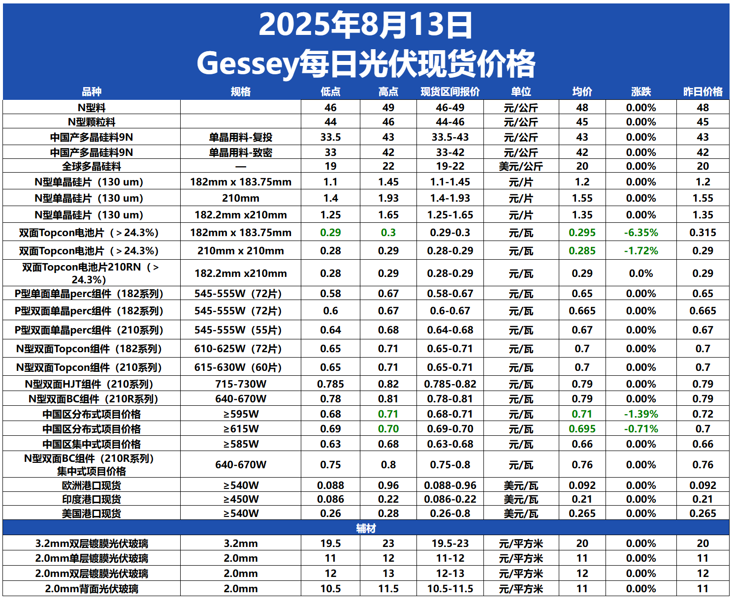 現貨市場價格變動: 多晶硅: 今日(ri)硅料價(jia)(jia)格(ge)(ge)(ge)整體維穩,N型料主流價(jia)(jia)格(ge)(ge)(ge)在(zai)(zai)46-49元(yuan)(yuan)/公(gong)(gong)斤(jin)(jin)(jin)(jin),均價(jia)(jia)48元(yuan)(yuan)/公(gong)(gong)斤(jin)(jin)(jin)(jin)。N型顆(ke)粒(li)硅主流價(jia)(jia)格(ge)(ge)(ge)在(zai)(zai)44-46元(yuan)(yuan)/公(gong)(gong)斤(jin)(jin)(jin)(jin),均價(jia)(jia)45元(yuan)(yuan)/公(gong)(gong)斤(jin)(jin)(jin)(jin)。國產(chan)復投特級(ji)硅料主流價(jia)(jia)格(ge)(ge)(ge)在(zai)(zai)33.5-43元(yuan)(yuan)/公(gong)(gong)斤(jin)(jin)(jin)(jin),均價(jia)(jia)43元(yuan)(yuan)/公(gong)(gong)斤(jin)(jin)(jin)(jin),國產(chan)致(zhi)密特級(ji)硅料主流價(jia)(jia)格(ge)(ge)(ge)在(zai)(zai)33-42元(yuan)(yuan)/公(gong)(gong)斤(jin)(jin)(jin)(jin),均價(jia)(jia)42元(yuan)(yuan)/公(gong)(gong)斤(jin)(jin)(jin)(jin)。全球多晶硅料主流價(jia)(jia)格(ge)(ge)(ge)在(zai)(zai)19-22元(yuan)(yuan)/公(gong)(gong)斤(jin)(jin)(jin)(jin),均價(jia)(jia)20元(yuan)(yuan)/公(gong)(gong)斤(jin)(jin)(jin)(jin)。 硅片: 今日硅(gui)片(pian)價格(ge)整體維穩,N型-183.75mm單(dan)(dan)晶硅(gui)片(pian)主流(liu)現貨價格(ge)維持(chi)1.1-1.45元(yuan)/片(pian),均價1.2元(yuan)/片(pian)。N型-210mm單(dan)(dan)晶硅(gui)片(pian)主流(liu)現貨價格(ge)維持(chi)1.4-1.93元(yuan)/片(pian),均價1.55元(yuan)/片(pian)。N型-210Rmm單(dan)(dan)晶硅(gui)片(pian)主流(liu)現貨價格(ge)1.25-1.65元(yuan)/片(pian),均價1.35元(yuan)/片(pian)。 電池片: 今日電池片價格(ge)(ge)小幅下跌(die),24.3%以(yi)上183.75mm雙面Topcon電池片主流價格(ge)(ge)在(zai)0.29-0.3元(yuan)/瓦,均價0.295元(yuan)/瓦,下降6.35%。24.3%以上210mm雙面Topcon電池片(pian)主流價格在0.28-0.29元/瓦,均(jun)價0.285元/瓦,下降1.72%。24.3%以上210Rmm雙面Topcon電池片主流價(jia)格在0.28-0.29元/瓦(wa),均價(jia)0.29元/瓦(wa)。 組件: 今日組(zu)(zu)件(jian)(jian)(jian)價(jia)(jia)(jia)格(ge)小幅下跌,雙(shuang)面(mian)單晶(jing)perc組(zu)(zu)件(jian)(jian)(jian)(182系列(lie))價(jia)(jia)(jia)格(ge)在(zai)0.6-0.67元(yuan)/ 瓦(wa)(wa)(wa)(wa),均價(jia)(jia)(jia)為(wei)(wei)0.665元(yuan)/瓦(wa)(wa)(wa)(wa)。雙(shuang)面(mian)單晶(jing)perc組(zu)(zu)件(jian)(jian)(jian)(210系列(lie))價(jia)(jia)(jia)格(ge)在(zai)0.64-0.68元(yuan)/ 瓦(wa)(wa)(wa)(wa),均價(jia)(jia)(jia)為(wei)(wei)0.67元(yuan)/瓦(wa)(wa)(wa)(wa)。N型(xing)(xing)雙(shuang)面(mian)Topcon 組(zu)(zu)件(jian)(jian)(jian)(182系列(lie))價(jia)(jia)(jia)格(ge)在(zai)0.65-0.71元(yuan)/ 瓦(wa)(wa)(wa)(wa),均價(jia)(jia)(jia)為(wei)(wei)0.7元(yuan)/瓦(wa)(wa)(wa)(wa)。N型(xing)(xing)雙(shuang)面(mian)Topcon 組(zu)(zu)件(jian)(jian)(jian)(210系列(lie))價(jia)(jia)(jia)格(ge)在(zai)0.65-0.71元(yuan)/ 瓦(wa)(wa)(wa)(wa),均價(jia)(jia)(jia)為(wei)(wei)0.7元(yuan)/瓦(wa)(wa)(wa)(wa)。N型(xing)(xing)雙(shuang)面(mian)HJT組(zu)(zu)件(jian)(jian)(jian)(210系列(lie))價(jia)(jia)(jia)格(ge)在(zai)0.785-0.82元(yuan)/ 瓦(wa)(wa)(wa)(wa),均價(jia)(jia)(jia)為(wei)(wei)0.79元(yuan)/瓦(wa)(wa)(wa)(wa)。N型(xing)(xing)雙(shuang)面(mian)BC組(zu)(zu)件(jian)(jian)(jian)(210R系列(lie))價(jia)(jia)(jia)格(ge)在(zai)0.78-0.81元(yuan)/ 瓦(wa)(wa)(wa)(wa),均價(jia)(jia)(jia)為(wei)(wei)0.79元(yuan)/瓦(wa)(wa)(wa)(wa)。中國區分布式項目(mu)(≥595W)價(jia)(jia)(jia)格(ge)在(zai)0.68-0.71元(yuan)/瓦(wa)(wa)(wa)(wa),均價(jia)(jia)(jia)為(wei)(wei)0.71元(yuan)/瓦(wa)(wa)(wa)(wa),下降1.39%,中國(guo)區(qu)分(fen)布(bu)式項目(≥615W)價(jia)(jia)格(ge)在(zai)0.69-0.7元/瓦(wa),均價(jia)(jia)為0.695元/瓦(wa),下降(jiang)0.71%,中國區集(ji)(ji)中式(shi)項目(≥585W)價(jia)(jia)(jia)(jia)格(ge)在(zai)(zai)(zai)0.63-0.68元(yuan)/ 瓦(wa)(wa)(wa)(wa),均價(jia)(jia)(jia)(jia)為(wei)0.66元(yuan)/瓦(wa)(wa)(wa)(wa)。N型雙面BC組件(210R系列(lie))集(ji)(ji)中式(shi)項目價(jia)(jia)(jia)(jia)格(ge)在(zai)(zai)(zai)0.75-0.8元(yuan)/ 瓦(wa)(wa)(wa)(wa),均價(jia)(jia)(jia)(jia)為(wei)0.76元(yuan)/瓦(wa)(wa)(wa)(wa)。歐(ou)洲港口(kou)現(xian)貨(huo)(huo)價(jia)(jia)(jia)(jia)格(ge)在(zai)(zai)(zai)0.088-0.96美元(yuan)/ 瓦(wa)(wa)(wa)(wa),均價(jia)(jia)(jia)(jia)為(wei)0.092美元(yuan)/瓦(wa)(wa)(wa)(wa)。印度港口(kou)現(xian)貨(huo)(huo)價(jia)(jia)(jia)(jia)格(ge)在(zai)(zai)(zai)0.086-0.22美元(yuan)/ 瓦(wa)(wa)(wa)(wa),均價(jia)(jia)(jia)(jia)為(wei)0.21美元(yuan)/瓦(wa)(wa)(wa)(wa)。美國港口(kou)現(xian)貨(huo)(huo)價(jia)(jia)(jia)(jia)格(ge)在(zai)(zai)(zai)0.26-0.28美元(yuan)/ 瓦(wa)(wa)(wa)(wa),均價(jia)(jia)(jia)(jia)為(wei)0.265美元(yuan)/瓦(wa)(wa)(wa)(wa)。 玻璃: 今(jin)日玻璃(li)價格(ge)整體維穩,3.2mm雙(shuang)層(ceng)(ceng)鍍(du)膜光(guang)(guang)伏(fu)玻璃(li)價格(ge)在(zai)19.5-23元(yuan)/平(ping)(ping)方(fang)(fang)(fang)米(mi)(mi)(mi),均(jun)價為(wei)20元(yuan)/平(ping)(ping)方(fang)(fang)(fang)米(mi)(mi)(mi)。2.0mm單層(ceng)(ceng)鍍(du)膜光(guang)(guang)伏(fu)玻璃(li)價格(ge)在(zai)11-12元(yuan)/平(ping)(ping)方(fang)(fang)(fang)米(mi)(mi)(mi),均(jun)價為(wei)11元(yuan)/平(ping)(ping)方(fang)(fang)(fang)米(mi)(mi)(mi)。2.0mm雙(shuang)層(ceng)(ceng)鍍(du)膜光(guang)(guang)伏(fu)玻璃(li)價格(ge)在(zai)12-13元(yuan)/平(ping)(ping)方(fang)(fang)(fang)米(mi)(mi)(mi),均(jun)價為(wei)12元(yuan)/平(ping)(ping)方(fang)(fang)(fang)米(mi)(mi)(mi)。2.0mm背面光(guang)(guang)伏(fu)玻璃(li)價格(ge)在(zai)10.5-11.5元(yuan)/平(ping)(ping)方(fang)(fang)(fang)米(mi)(mi)(mi),均(jun)價為(wei)11元(yuan)/平(ping)(ping)方(fang)(fang)(fang)米(mi)(mi)(mi)。 聚焦每日行情波動: 今(jin)日電池片價(jia)格小幅下(xia)跌(die),海外囤貨氛圍陸續回落,目前訂(ding)單持續交付