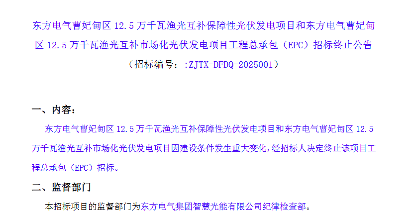 9月3日,東方電氣曹妃甸區12.5萬千瓦漁光互補保障性光伏發電項目和東方電氣曹妃甸區12.5萬千瓦漁光互補市場化光伏發電項目工程總承包(EPC)招標終止公告發布。根據公告,招標終止原因為項目建設條件發生重大變化,故而項目EPC招標招標終止。 據悉,項目于今年2月底啟動招標,3月公布中標候選人,項目業主為東方電氣,招標人為東唐(唐山曹妃甸區)新能源有限公司。12.5萬千瓦漁光互補保障性項目位于河北省唐山市曹妃甸區五農場,地類全部為農用地,總投資約5.3億元,新建一座光伏電站,直流側裝機總容量約162.5Mwp,交流側容量125MW;12.5萬千瓦漁光互補市場化項目位于河北省唐山市曹妃甸區五農場和柳贊鎮,地類全部為農用地。總投資約 5.6億元,新建一座光伏電站,直流側裝機總容量約162.5MWp,交流側容量125MW。