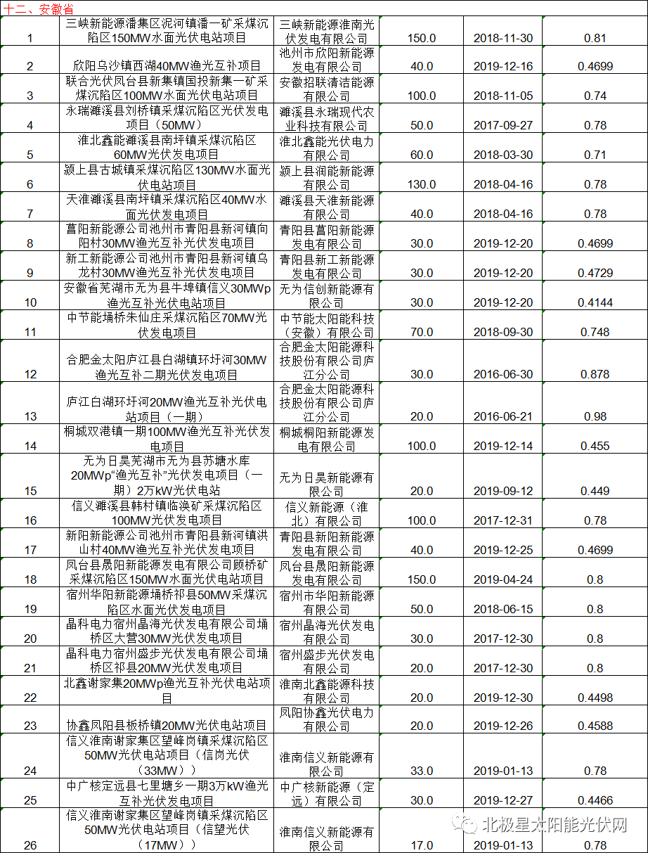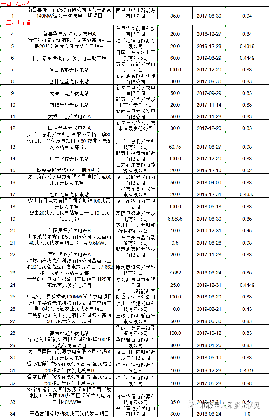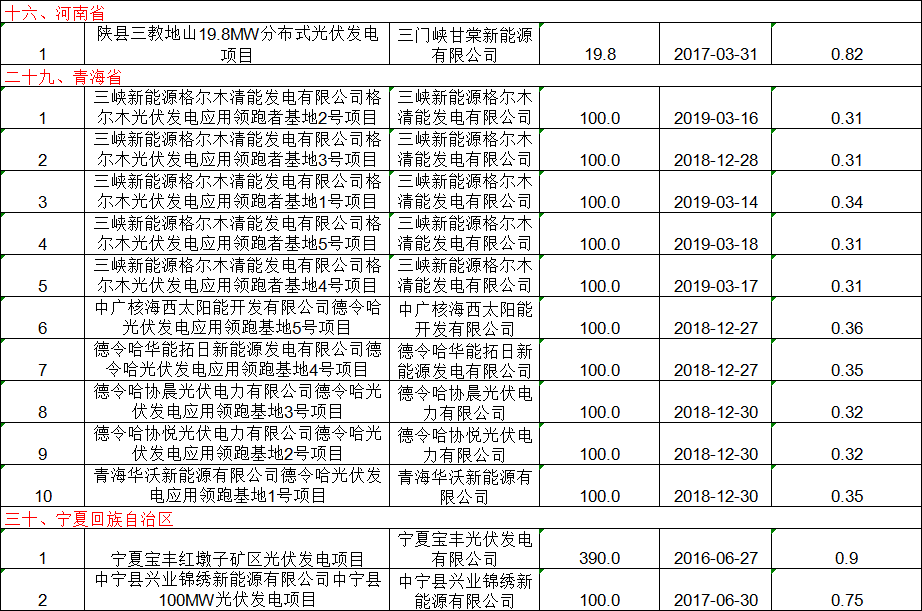 8月28日,國家電網公示了最新一批的可(ke)再(zai)生能源發電補貼項(xiang)目(mu)清單,其中共涉及(ji)82個集中式光(guang)伏項(xiang)目(mu),總裝機(ji)容量達4858.99548MW,涵蓋山西、江蘇、安徽(hui)、江西、山東、河南、青海、寧(ning)夏8個省份。 以下為(wei)本(ben)次(ci)公(gong)示清單中光伏項(xiang)目(mu)部(bu)分: