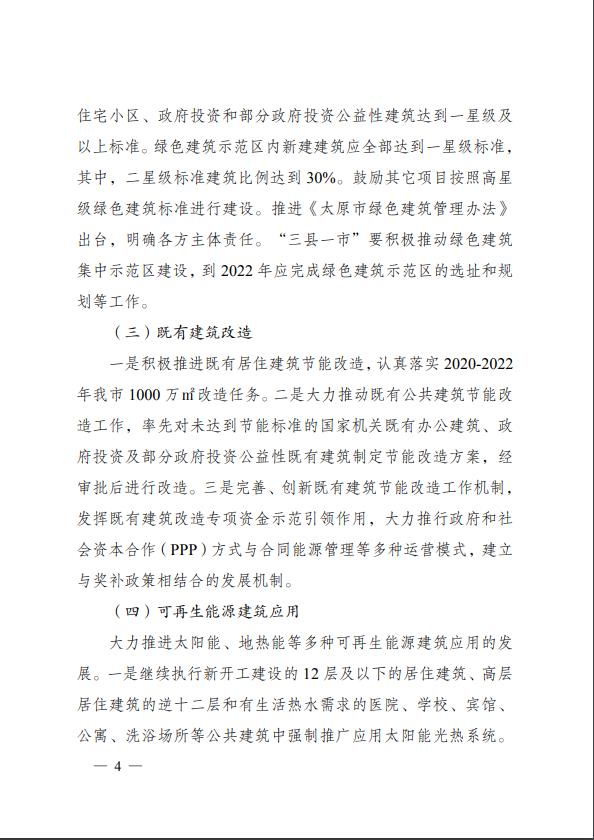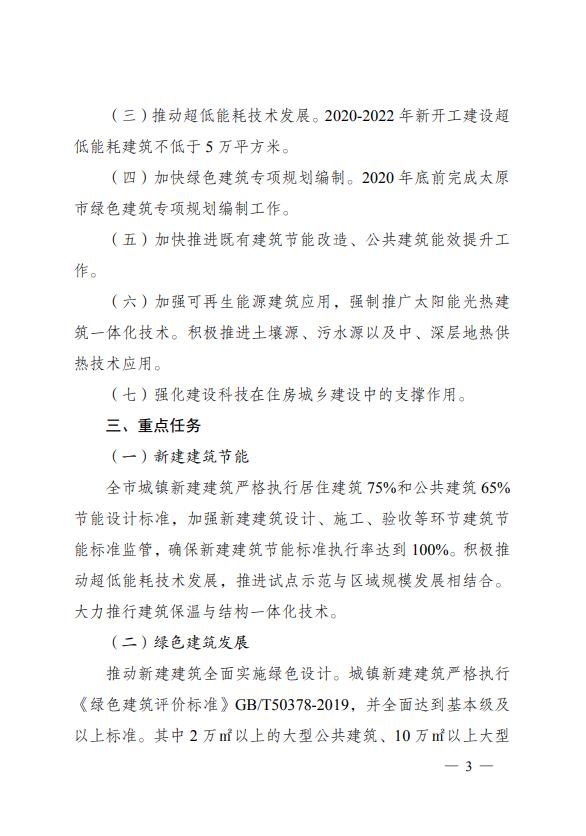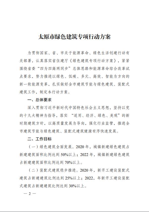 近日,山西省太原市住房和城鄉建設局發布了 《太原市綠色建筑專項行動方案》,表示:2022年,太原市城鎮新建綠色建筑占新建建筑面積比例將達到70%以上,同時,2022年新開工建設裝配式建筑占新建建筑比例也將達到30%以上。 太原市將繼續執行新開工建設的12層及以下的居住建筑、高層居住建筑的逆十二層和有生活熱水需求的醫院、學校、賓館、公寓、洗浴場所等公共建筑中強制推廣應用太陽能光熱系統。 具體文件問下: