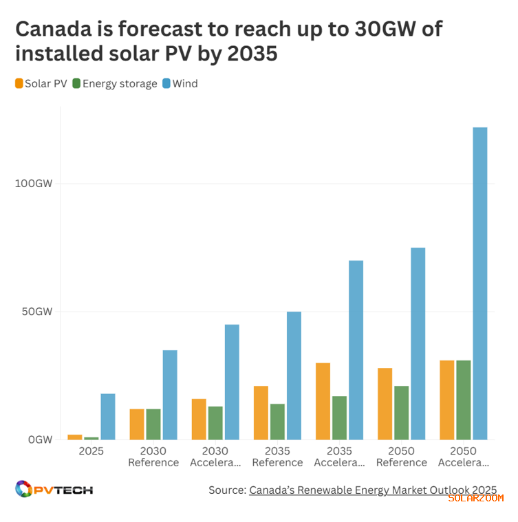 加拿(na)大可(ke)再生能(neng)源協會(CanREA)預測(ce),未(wei)來十年加拿(na)大將增加17GW 至 26GW的太(tai)陽(yang)能(neng)光(guang)伏。 這是(shi)該行(xing)業協會與咨詢公(gong)司(si)Dunsky Energy + Climate Advisors聯(lian)合發布的(de)報告《加拿大可再生能(neng)(neng)(neng)源市(shi)場展(zhan)望:風能(neng)(neng)(neng)、太陽能(neng)(neng)(neng)、儲能(neng)(neng)(neng)》中(zhong)的(de)關(guan)鍵要點(dian)之一,該公(gong)司(si)還(huan)預測到2035年將增加12GW至16GW的(de)儲能(neng)(neng)(neng)。 2035年(nian)(nian)至2050年(nian)(nian)間,太陽(yang)能光伏、風(feng)(feng)能和儲能的(de)總裝機容量將進一步增長(chang)50-60%。這一增長(chang)將導致(zhi)風(feng)(feng)能和太陽(yang)能在加拿(na)大電力供應中(zhong)的(de)份(fen)額從目前的(de) 10%增加到2035年(nian)(nian)的(de) 21%,這主要是(shi)由風(feng)(feng)能增長(chang)(30-51GW)推動的(de)。 這三(san)種技術(shu)加(jia)起來預計將占2025年至2050年間(jian)加(jia)拿大所有新(xin)建電力供(gong)應能力的(de)70%以上。 太(tai)陽(yang)能光(guang)伏(fu)新(xin)增量(liang)高達26GW,相(xiang)當于(yu)截至(zhi)2025年(nian)(nian)7月(yue)該技術的2.3GW裝機(ji)容(rong)量(liang)增長十倍以上。未來十年(nian)(nian),儲能將呈現(xian)與(yu)太(tai)陽(yang)能光(guang)伏(fu)類(lei)似的增長模式,因為截至(zhi)2025年(nian)(nian)7月(yue),儲能裝機(ji)量(liang)為1GW。風能在這(zhe)三項技術中處于(yu)領先地位,截至(zhi)2025年(nian)(nian)7月(yue)裝機(ji)容(rong)量(liang)超過(guo)17GW。 此外(wai),報告還提到,除了裝機(ji)容(rong)量外(wai),目(mu)前還有(you)600MW的太陽(yang)能光(guang)伏和3.4GW的儲(chu)能積極采購機(ji)會,以及11.5GW的與技術(shu)無關或光(guang)風混合項目(mu)。然而,CanREA 表示(shi),這(zhe)些采購只是“冰山一角(jiao)”。 在這三種技(ji)術中,預計2025年至(zhi)2035年間平(ping)均每年投資(zi)14-200億加(jia)元(10.2-145億美元)。 大(da)部分已(yi)安(an)裝的大(da)型地面太(tai)陽能裝機(ji)容量位于艾伯(bo)塔(ta)省(sheng),擁有近(jin) 2GW 的運(yun)營太(tai)陽能光(guang)伏(fu),其次是安(an)大(da)略省(sheng)和草原省(sheng)。