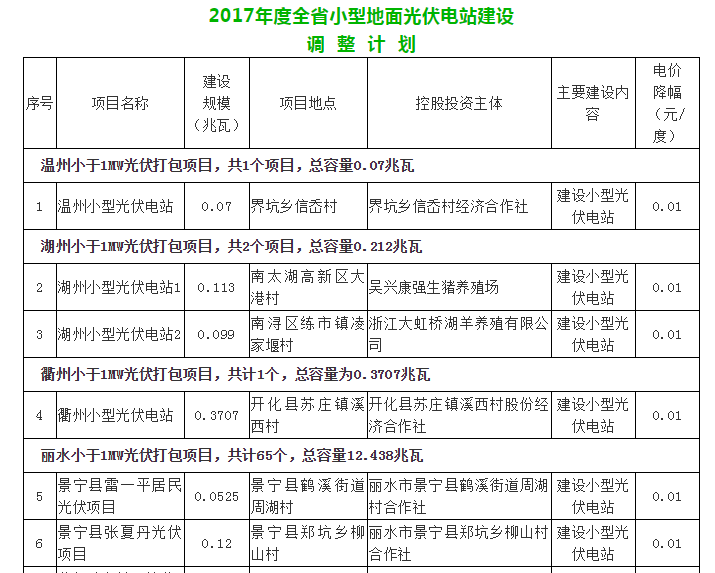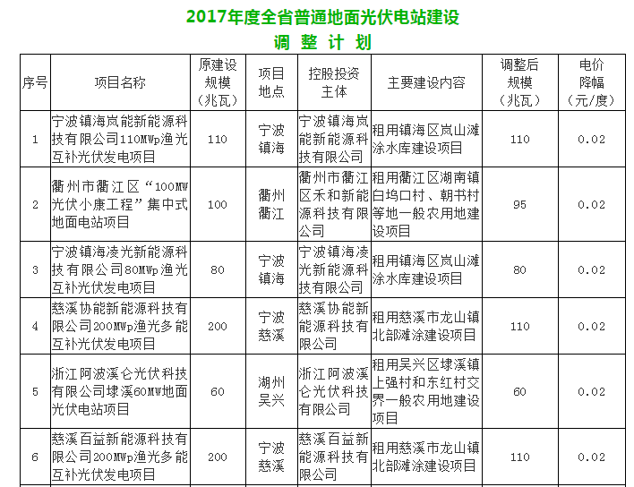 近日(ri),浙江省(sheng)發展改革(ge)委關于下達(da)2017年度全省(sheng)普(pu)通地(di)面(mian)(mian)光伏電站(zhan)建設調整(zheng)計劃的(de)通知。據通知顯示(shi),2017年度全省(sheng)普(pu)通地(di)面(mian)(mian)光伏電站(zhan)建設調整(zheng)包含(han)32個項(xiang)目(mu)(mu),共計1011.9207MW;小(xiao)型地(di)面(mian)(mian)光伏電站(zhan)建設調整(zheng)包含(han)90個項(xiang)目(mu)(mu),共計16.1807MW 浙江省(sheng)發展改革委關于下達2017年度(du)全省(sheng)普通地面光伏電站建設調(diao)整計(ji)劃的(de)通知 加(jia)急 浙發改能(neng)源〔2019〕533號(hao) 各市、縣(市、區)發展改(gai)革委(局(ju)): 根(gen)據《國(guo)家發展(zhan)改(gai)革委 國(guo)家能(neng)(neng)源局關(guan)(guan)于完善光(guang)(guang)伏(fu)(fu)發電(dian)(dian)規(gui)模(mo)管(guan)理(li)和實行(xing)競(jing)(jing)爭方式配置項目(mu)的(de)(de)指導意(yi)見(jian)》(發改(gai)能(neng)(neng)源〔2016〕1163號(hao))、《國(guo)家能(neng)(neng)源局關(guan)(guan)于可再生能(neng)(neng)源發展(zhan)“十三(san)五”規(gui)劃實施(shi)的(de)(de)指導意(yi)見(jian)》(國(guo)能(neng)(neng)發新能(neng)(neng)〔2017〕31號(hao))、《關(guan)(guan)于開展(zhan)2017年(nian)(nian)度(du)及2018年(nian)(nian)度(du)全(quan)(quan)省(sheng)(sheng)普通(tong)(tong)地(di)面(mian)光(guang)(guang)伏(fu)(fu)電(dian)(dian)站(zhan)建設(she)規(gui)模(mo)競(jing)(jing)爭性(xing)分(fen)(fen)配的(de)(de)通(tong)(tong)知》(浙發改(gai)能(neng)(neng)源〔2017〕1005號(hao))等文(wen)件要求,我(wo)省(sheng)(sheng)通(tong)(tong)過競(jing)(jing)爭性(xing)分(fen)(fen)配下達了2017年(nian)(nian)度(du)及2018年(nian)(nian)度(du)(部分(fen)(fen))全(quan)(quan)省(sheng)(sheng)普通(tong)(tong)地(di)面(mian)光(guang)(guang)伏(fu)(fu)電(dian)(dian)站(zhan)計劃。為規(gui)范我(wo)省(sheng)(sheng)光(guang)(guang)伏(fu)(fu)發電(dian)(dian)項目(mu)建設(she)管(guan)理(li),根(gen)據各地(di)項目(mu)推進(jin)情況,現(xian)對2017年(nian)(nian)度(du)全(quan)(quan)省(sheng)(sheng)普通(tong)(tong)地(di)面(mian)光(guang)(guang)伏(fu)(fu)電(dian)(dian)站(zhan)建設(she)計劃進(jin)行(xing)調整,并下達2017年(nian)(nian)度(du)全(quan)(quan)省(sheng)(sheng)普通(tong)(tong)地(di)面(mian)光(guang)(guang)伏(fu)(fu)電(dian)(dian)站(zhan)建設(she)調整計劃。具體內容通(tong)(tong)知如下: 一、2017年度普通地(di)面(mian)光伏電站建設計劃(hua)內項目(mu)以此次調(diao)整計劃(hua)為準,調(diao)整計劃(hua)內項目(mu)可享受國家和省電價補貼政策。 二(er)、為進一步規范(fan)項目管(guan)理,利于國家電價補助申請,項目業(ye)主需按照2017年(nian)度調整(zheng)計劃內項目的名稱和規模,對原項目進行備案(an)調整(zheng)。 三、計劃調(diao)整(zheng)項目電價按國家(jia)和(he)省有關文件規定執行,其(qi)中并(bing)(bing)網時間以電力公(gong)司出具的項目并(bing)(bing)網驗收意見為準。 四、2017年度(du)調整計劃(hua)內項(xiang)目,其(qi)投資主體(ti)及股權比例(li)、建設規模(mo)和建設場址等內容不得擅自變更,如(ru)需變更須按照(zhao)發改能(neng)源〔2016〕1163號、浙發改能(neng)源〔2017〕1005號文件有(you)關要求執行。 五、各地(di)發展(zhan)改(gai)革部門應加強項目(mu)建(jian)設和(he)(he)運(yun)(yun)行監(jian)管,特別(bie)是對光(guang)伏(fu)小康和(he)(he)消薄項目(mu)的監(jian)管,確保國家(jia)補貼政策(ce)落(luo)實到位和(he)(he)項目(mu)高(gao)質量運(yun)(yun)行。 附(fu)件(jian):1.2017年(nian)度全省普通地面(mian)光(guang)伏電站(zhan)建設調(diao)整計劃 2.2017年(nian)度全(quan)省小型地面(mian)光伏電(dian)站建設(she)調整計劃 浙江(jiang)省發展和(he)改革委員會 2019年(nian)12月31日 抄送:國家發展(zhan)改革委、國家能(neng)(neng)源(yuan)局,省財政廳(ting)、自然資源(yuan)廳(ting)、生態環境廳(ting)、建設(she)廳(ting)、水利廳(ting)、農業農村(cun)廳(ting),國家能(neng)(neng)源(yuan)局浙江監管(guan)辦,省電力公司,各市政府(fu)、有關縣(市、區)政府(fu)。 浙江省(sheng)發展和改革委員會辦公室 2019年(nian)12月31日印(yin)發(fa)