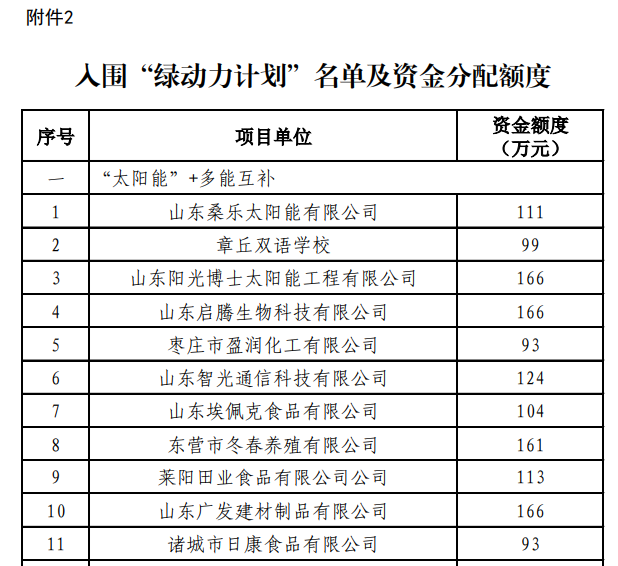 3月23日,山東能源局發布關于公布2020年度省能源節約專項資金入圍名單的通知,其中54個“太陽能”+多能互補項目入圍“綠動力計劃”。 關于公布2020年度省能源節約專項資金入圍名單的通知 各市發展改革委(能源局):根據《山東省能源節約資金管理實施細則》(魯能源科技字〔2019〕235號)和《關于做好2020年度省能源節約資金申報工作的通知》(魯能源科技字〔2019〕290號)精神,經專家評審和公示,省能源局確定了2020年度能源節約專項資金入圍名單,現予以公布(見附件1-3),并提出以下要求。一、請各市協調配合財政部門及時足額將資金撥付到項目單位,切實發揮財政資金引導作用。二、請入圍的生物質能源推廣應用重點縣(市、區)抓緊編制資金使用方案。其中,濰坊安丘市重點用于生物質能源推廣示范縣建設;其他市重點用于陽信縣溫店鎮、惠民縣李莊鎮、平原縣三塘鄉、泗水縣高峪鎮綠色能源示范村鎮建設。資金使用方案主要包括資金使用方式、獎勵或補貼標準、擬支持的重點項目等。三、省能源局將組織對重點項目進行實地核查,對弄虛作假、不符合相關要求的取消入圍資格,收回專項資金。各市專項資金撥付情況、生物質能源推廣應用重點縣(市、區)資金使用方案,于6月底前報省能源局能源節約和科技裝備處。聯系人:賀永杰,電話:0531-68627629郵箱:snyjkjc@shandong.cn 附件:1.入圍生物質能源推廣應用示范縣(市、區)名單及資金分配額度.pdf 2.入圍“綠動力計劃”名單及資金分配額度.pdf 3.入圍能源節約計劃名單及資金分配額度.pdf