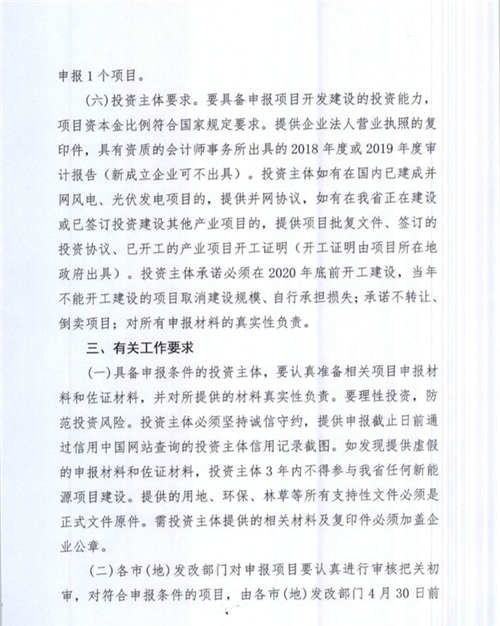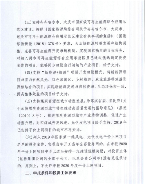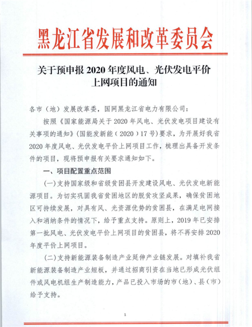 4月21日,黑龍江發改委印發《關于預申報2020年度風電、光伏發電平(ping)價上網項(xiang)目(mu)的(de)通知》,就2020年風、光平(ping)價(jia)項(xiang)目(mu)申報的(de)有關注意事項(xiang)指(zhi)出相關要求(qiu)。 通知(zhi)指出對以下(xia)6個重點范圍內(nei)的申報項目(mu)給(gei)予支持(chi): 1、重點支持(chi)國家(jia)和省級貧困縣平價項(xiang)目的(de)申報,對(dui)于(yu)2019年已(yi)安排平價風電、光伏項(xiang)目的(de)貧困縣本年度不再(zai)安排; 2、在當地設(she)有風機或光伏組件生(sheng)產(chan)廠商的(de)投資方(fang)項目; 3、對納入齊(qi)齊(qi)哈爾及大慶可再生能源示范區的主體項(xiang)目(mu)方且(qie)能夠同步(bu)建設(she)自行(xing)消納產業項(xiang)目(mu)的; 4、以“新能源+旅游(you)”方式開發,實(shi)現生態環保的項(xiang)目; 5、對(dui)四(si)煤城(雞西、鶴崗、雙鴨山(shan)、七臺河)的(de)開發項(xiang)目(mu)給予支持,2019年已(yi)安(an)排平價項(xiang)目(mu)的(de)本年不再(zai)安(an)排; 6、2019年平價項(xiang)(xiang)目在當年實現全容(rong)量并網(wang)的(de),在今(jin)年的(de)申報(bao)項(xiang)(xiang)目中給予(yu)適當獎勵,未并網(wang)的(de)不(bu)允許申報(bao)今(jin)年的(de)項(xiang)(xiang)目。 通知要求,風(feng)電項(xiang)(xiang)目最低申報(bao)規模不得(de)低于50MW,光(guang)伏不得(de)低于100MW,最大規模不得(de)超過200MW。同一投資主(zhu)(zhu)體只(zhi)能申報(bao)1個風(feng)電場或光(guang)伏項(xiang)(xiang)目,投資主(zhu)(zhu)體須在2020年(nian)底前(qian)開工,支持存量項(xiang)(xiang)目轉(zhuan)平價,報(bao)送(song)截止日(ri)期為4月30日(ri)。