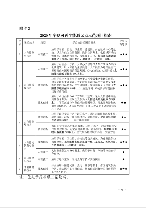 5月6日,寧夏回族自治區住建部發布關于組織申報2020年自治區財政支持可再生能源應用試點示范項目專項資金的通知,其中提到太陽能光伏發電技術應用于學校、衛生院、養老院等公共建筑,為建筑提供動力和照明,光伏組件實現建筑部件化(光伏瓦、光(guang)伏屋頂(ding)、光伏幕墻(qiang)等),與建(jian)筑一(yi)體化的(de)優先等級(ji)為3顆(ke)星(xing),太陽能光伏發(fa)電充電技術應用于村部、學校(xiao)等電動自行車充電的(de)優先等級(ji)為1顆(ke)星(xing)。