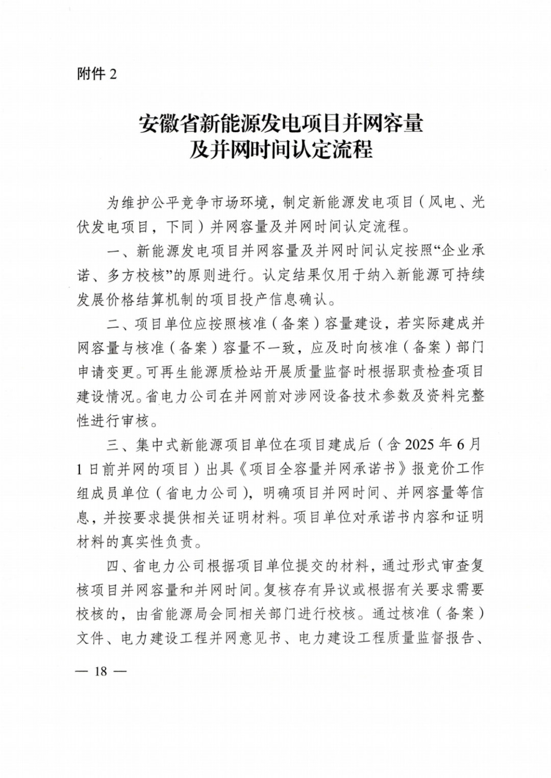 日前,安徽省發改委、能源局聯合印發《深化新能源上網電價市場化改革促進新能源高質量發展實施方案》。 存量項目 電量規模:按項目實際上網電量乘以年機制電量比例確定。集中式新能源單個項目年機制電量比例,按其2024年度上網電量扣減當年中長期(含綠電)合同實際結算電量(小于零則按零處理,下同)占當年上網電量的比例確定。分散式風電、分布式光伏項目年機制電量比例為100%。 機制電價:按燃煤發電基準價(0.3844元/千瓦時)執行。部分項目已有文件明確其上網電價的,以該上網電價(不含補貼)作為其機制電價。 執行期限:按自投產之日起滿20年與剩余全生命周期合理利用小時數(風電36000小時、光伏22000小時)較早者確定。 增量項目 電量規模:每年新增納入機制的電量規模,根據國家下達的年度非水電可再生能源電力消納責任權重完成情況,以及用戶承受能力等因素確定。增量項目機制電量均通過競價獲得,年上網電量按年合理利用小時數計算,風電、光伏年合理利用小時數分別按1800、1100小時確定。已投產的增量新能源項目在參與競價獲得機制電量前,可以參與月度及以下中長期(綠電)交易,不對項目競價申報電量上限產生影響。 單個項目申報電量上限為上一年度發電量的85%。 機制電價:考慮合理成本收益、綠色價值、電力市場供需形勢、用戶承受能力等因素,確定競價上下限。 執行期限:按同類型項目回收初始投資的平均期限確定。2025年6月1日前尚未投產,但已通過競爭性配置(含配儲的6MW以下地面光伏電站)等方式納入年度開發建設方案的新能源項目,可單獨組織競價,由企業自愿參與。通過單獨競價納入機制的項目,其相應儲能容量不再獲得容量補償收益。 另外,文件要求根據新能源發展情況,分光伏和風電兩類組織競價,對應設置競價規模。2025年6月1日前尚未投產,但已通過競爭性配置(含配儲的6MW以下地面光伏電站)等方式納入年度開發建設方案的新能源項目,可單獨組織競價,由企業自愿參與。通過單獨競價納入機制的項目,其相應儲能容量不再獲得容量補償收益。 詳情見下: