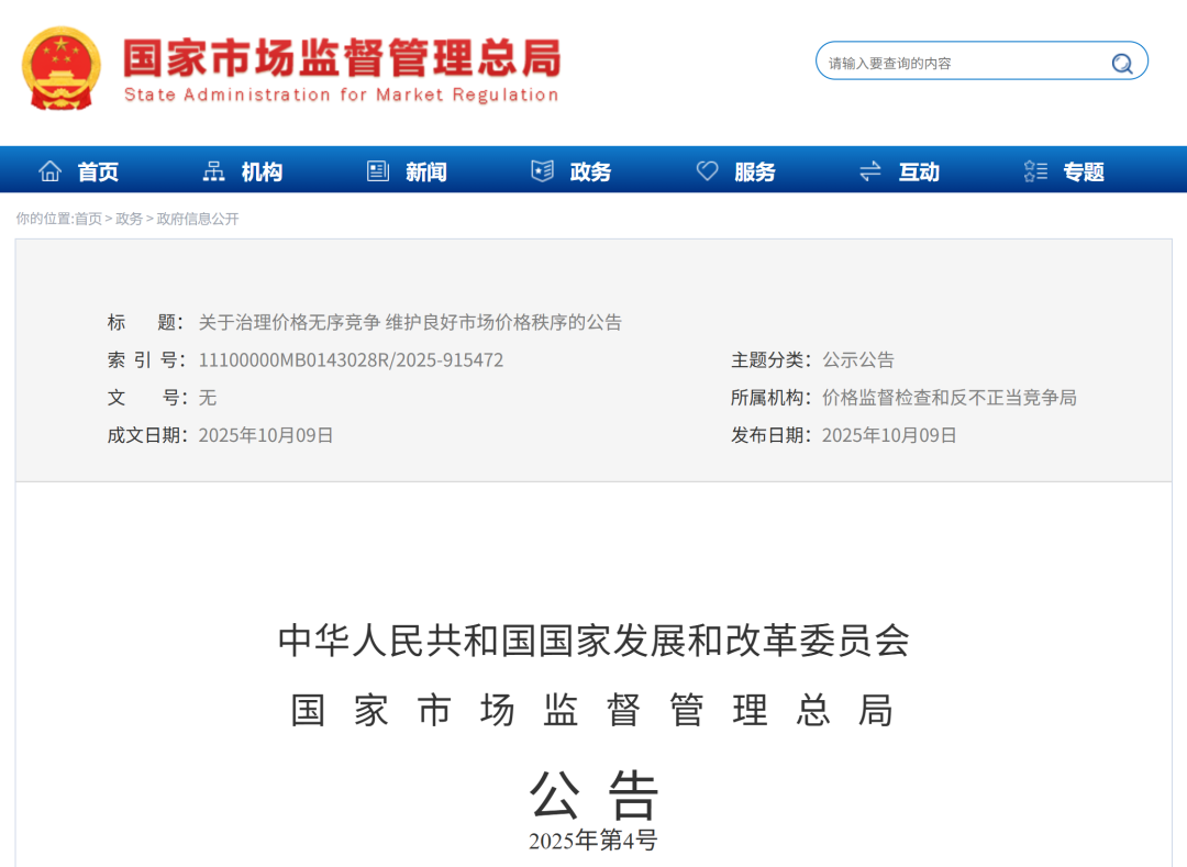 10月9日,國家發展改革委、市場監管總局發布《關于治理價格無序競爭 維護良好市場價格秩序的公告》。 公告提出,價格競爭是市場競爭的重要方式之一,但無序競爭會對行業發展、產品創新、質量安全等造成負面影響,不利于國民經濟健康發展。 公告根據現行法律法規,按照事前引導和事中事后監管相結合的思路,提出多項治理舉措。 調研評估行業平均成本。對價格無序競爭問題突出的重點行業,指導行業協會等有關機構調研評估行業平均成本,為經營者合理定價提供參考。 要求行業協會嚴格遵守價格法、反壟斷法規定,促進行業自律,引導經營者共同維護行業公平競爭秩序。 開展提醒告誡。對涉嫌價格無序競爭的經營者進行提醒告誡,要求其自覺規范價格行為,嚴守價格競爭底線。 加強監管執法。對提醒告誡后仍未規范價格行為的經營者予以重點關注,必要時開展成本調查、價格監督檢查,發現價格違法違規問題的,依法予以查處。充分發揮信用監管作用,依法依規實施失信懲戒。 要求經營者嚴格遵守招標投標法、招標投標法實施條例規定,自覺規范招標投標行為。 原文如下: 價格競爭是市場競爭的重要方式之一,但無序競爭會對行業發展、產品創新、質量安全等造成負面影響,不利于國民經濟健康發展。為規范市場價格行為,維護良好市場價格秩序,助力高質量發展,現就有關事項公告如下。 一、實行市場調節價的商品和服務,經營者應當按照《中華人民共和國價格法》規定,遵循公平、合法和誠實信用的原則,以生產經營成本和市場供求狀況為基本依據,依法行使自主定價權,自覺維護市場價格秩序,共同營造公平競爭、有序競爭的市場環境。 二、對價格無序競爭問題突出的重點行業,行業協會等有關機構在國家發展改革委、市場監管總局和行業主管部門指導下,可以調研評估行業平均成本,為經營者合理定價提供參考。 三、發展改革、市場監管部門要會同行業主管部門加強政策宣貫,提示經營者依法合規經營,提升產品質量和服務水平。對涉嫌價格無序競爭的經營者進行提醒告誡,要求其自覺規范價格行為,嚴守價格競爭底線。 四、發展改革、市場監管部門對提醒告誡后仍未規范價格行為的經營者予以重點關注,必要時開展成本調查、價格監督檢查,發現價格違法違規問題的,依法予以查處。 五、經營者應當嚴格遵守《中華人民共和國招標投標法》《中華人民共和國招標投標法實施條例》規定,自覺規范招標投標行為,不得以低于成本的報價競標,保障產品和服務質量。 六、行業協會應當嚴格遵守《中華人民共和國價格法》《中華人民共和國反壟斷法》規定,促進行業自律,引導經營者共同維護行業公平競爭秩序。 七、國家發展改革委、市場監管總局將會同有關部門密切監測市場價格競爭狀況,維護重點領域價格秩序。充分發揮信用監管作用,依法依規實施失信懲戒。 國家發展改革委 市場監管總局 2025年10月9日