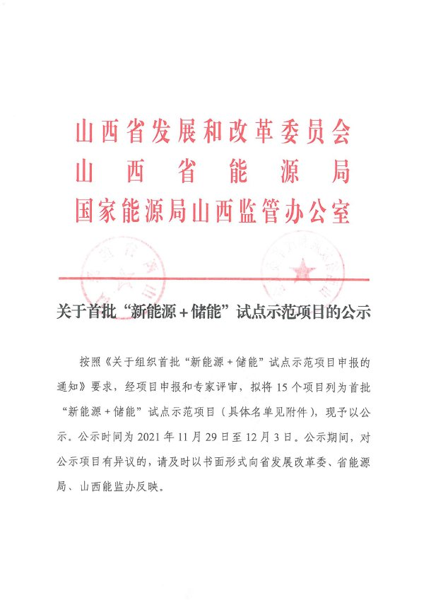 山(shan)西(xi)(xi)省發(fa)展和改革(ge)委(wei)員會、山(shan)西(xi)(xi)省能(neng)(neng)源局、國家能(neng)(neng)源局山(shan)西(xi)(xi)監(jian)管辦(ban)公(gong)室聯(lian)合發(fa)布(bu)《關(guan)于(yu)首(shou)批“新能(neng)(neng)源+儲能(neng)(neng)”試點(dian)示(shi)(shi)范項(xiang)目(mu)的公(gong)示(shi)(shi)》,擬將15個項(xiang)目(mu)列為首(shou)批“新能(neng)(neng)源+儲能(neng)(neng)”試點(dian)示(shi)(shi)范項(xiang)目(mu),公(gong)示(shi)(shi)時(shi)間為2021年11月29日(ri)至12月3日(ri)。公(gong)示(shi)(shi)期間,對公(gong)示(shi)(shi)項(xiang)目(mu)有異(yi)議的,請及時(shi)以書(shu)面形式向省發(fa)展改革(ge)委(wei)、省能(neng)(neng)源局、山(shan)西(xi)(xi)能(neng)(neng)監(jian)辦(ban)反映。