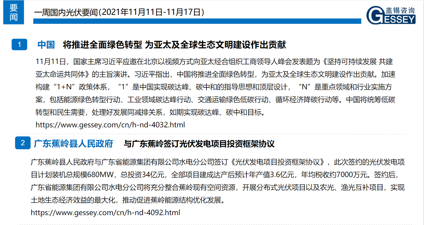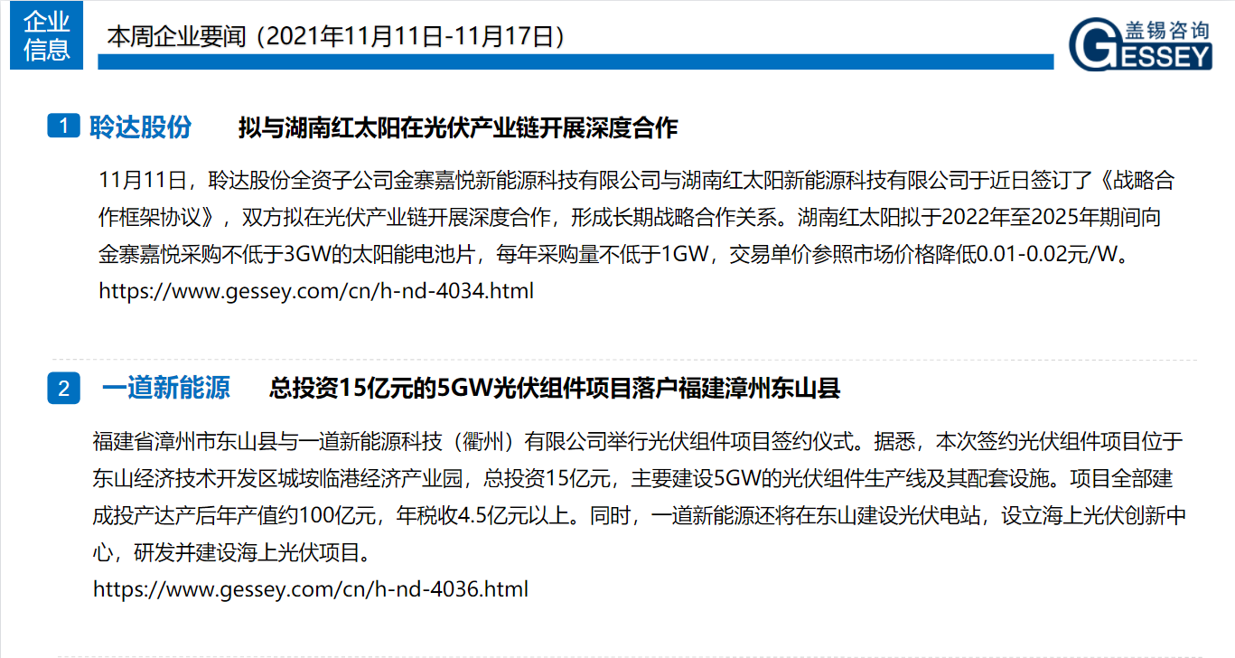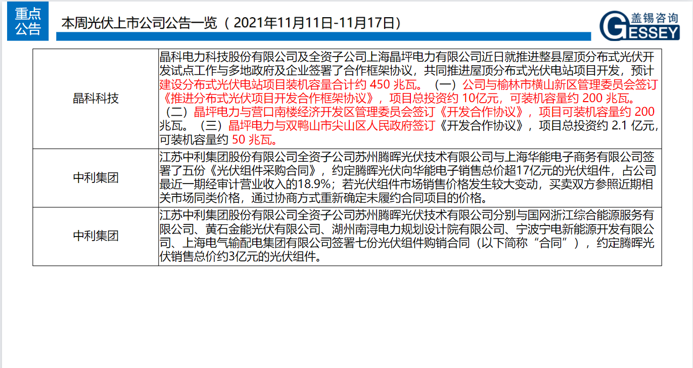 一周光伏市場洞察(2021年11月11日-11月17日)本周最新中標 組件價格地面電站10-30mw中標的年內發貨的組件平均中標價繼續抬漲至2.06元/瓦。后市預測:組件價格維持不動,整體組件企業訂單緩慢推進,價格維持高位運行。目前組件企業無主動降價意愿,但是基于成本制約以及客戶簽單放緩,組件企業預計12月開工率繼續走低。