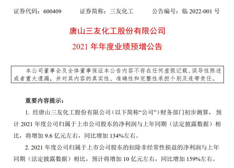 1月12日,三友(you)化(hua)工發布2021度業績(ji)預增公告。 2021年業績預告情況 1、預計2021年(nian)度公司實(shi)現歸屬(shu)于上市公司股東的凈利(li)潤與上年(nian)同(tong)期(法定披(pi)露(lu)數據)相比(bi),將增加9.6億元左右(you), 同(tong)比(bi)增加134%左右(you)。 2、2021年度公(gong)司歸(gui)屬于上市(shi)公(gong)司股東的扣(kou)除非經常性損(sun)益的凈(jing)利潤與上年同(tong)期(法定披(pi)露數據(ju))相(xiang)比(bi), 預計將(jiang)增加(jia)(jia)10億元左右,同(tong)比(bi)增加(jia)(jia)159%左右。 業績大漲(zhang)原因 受市場影(ying)響,公司(si)主(zhu)導產品粘膠短纖、純(chun)堿、 燒堿、二甲基(ji)硅(gui)氧烷混合環體售價(jia)同(tong)比大幅(fu)上漲,雖然主(zhu)要原(yuan)材(cai)料漿(jiang)粕(po)、電(dian)石、硅塊、原煤等價格(ge)也(ye)同比呈現不同程度(du)上漲(zhang)(zhang),但公司(si)(si)強化管理(li)、科學決策,抓住(zhu)市場有利時機,使(shi)主導產品(pin)售價上漲(zhang)(zhang)幅度(du)遠大于生產成本增長(chang)(chang)幅度(du),實現本報告期歸屬(shu)于上市公司(si)(si)股(gu)東(dong)的凈利潤大幅增長(chang)(chang)。
